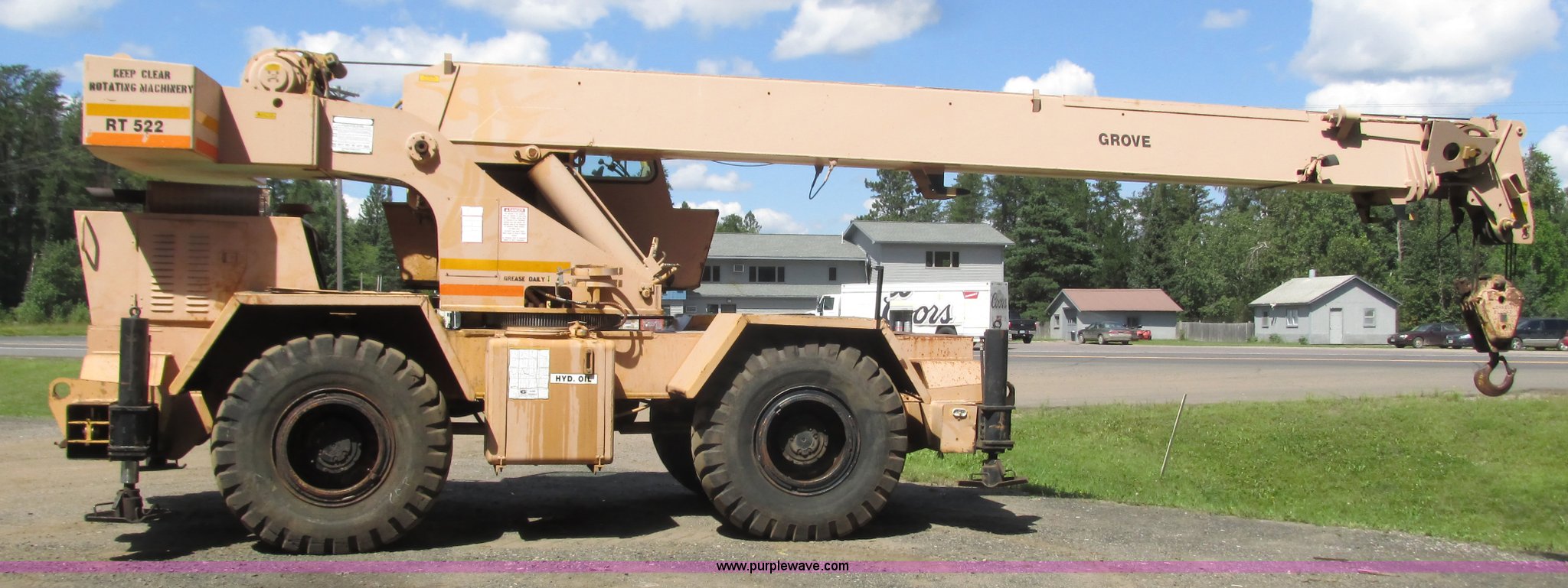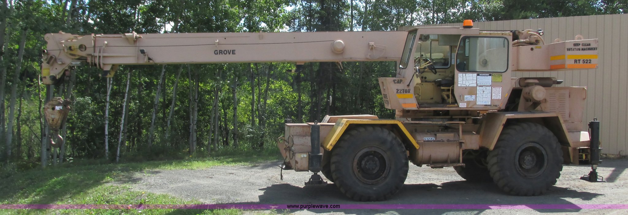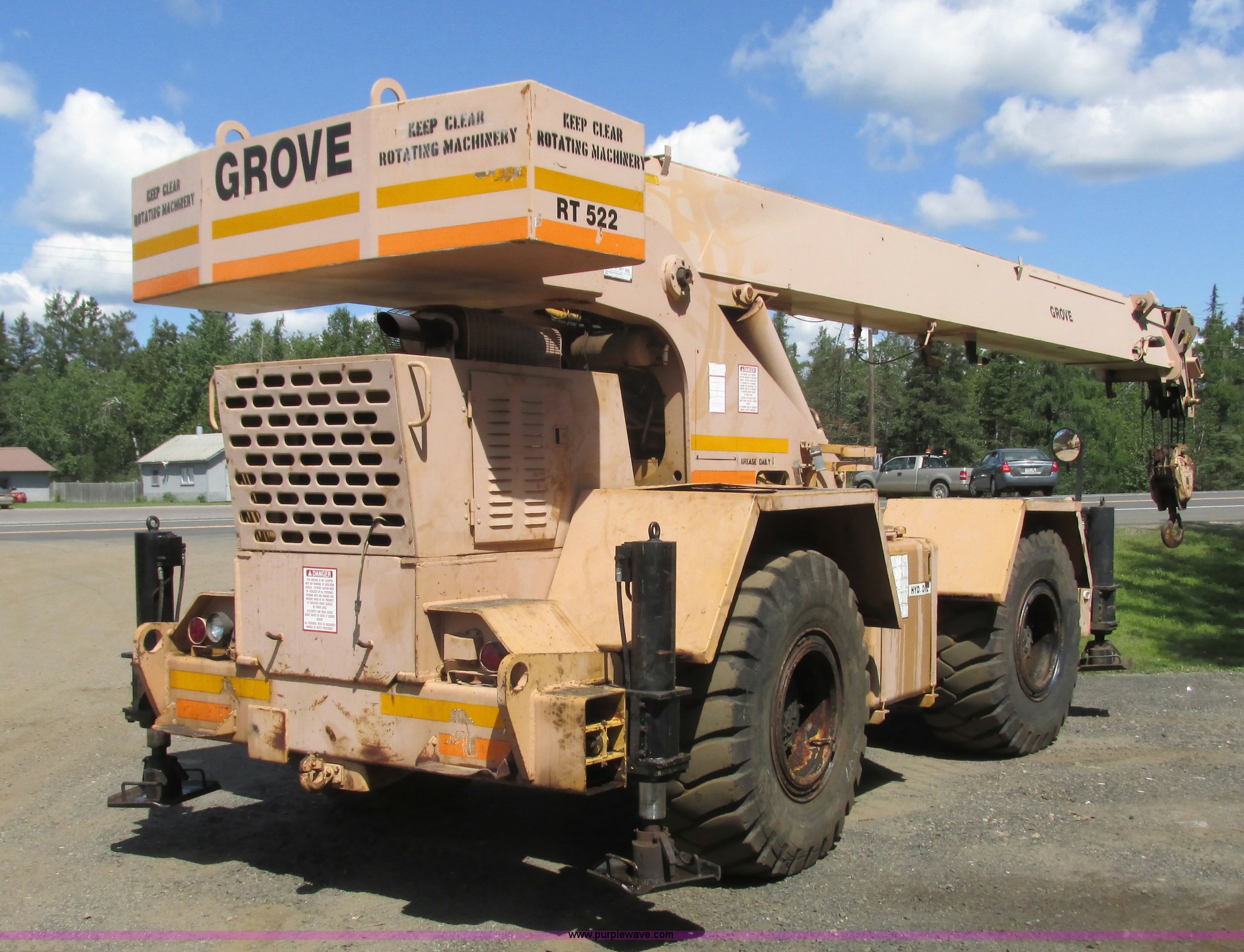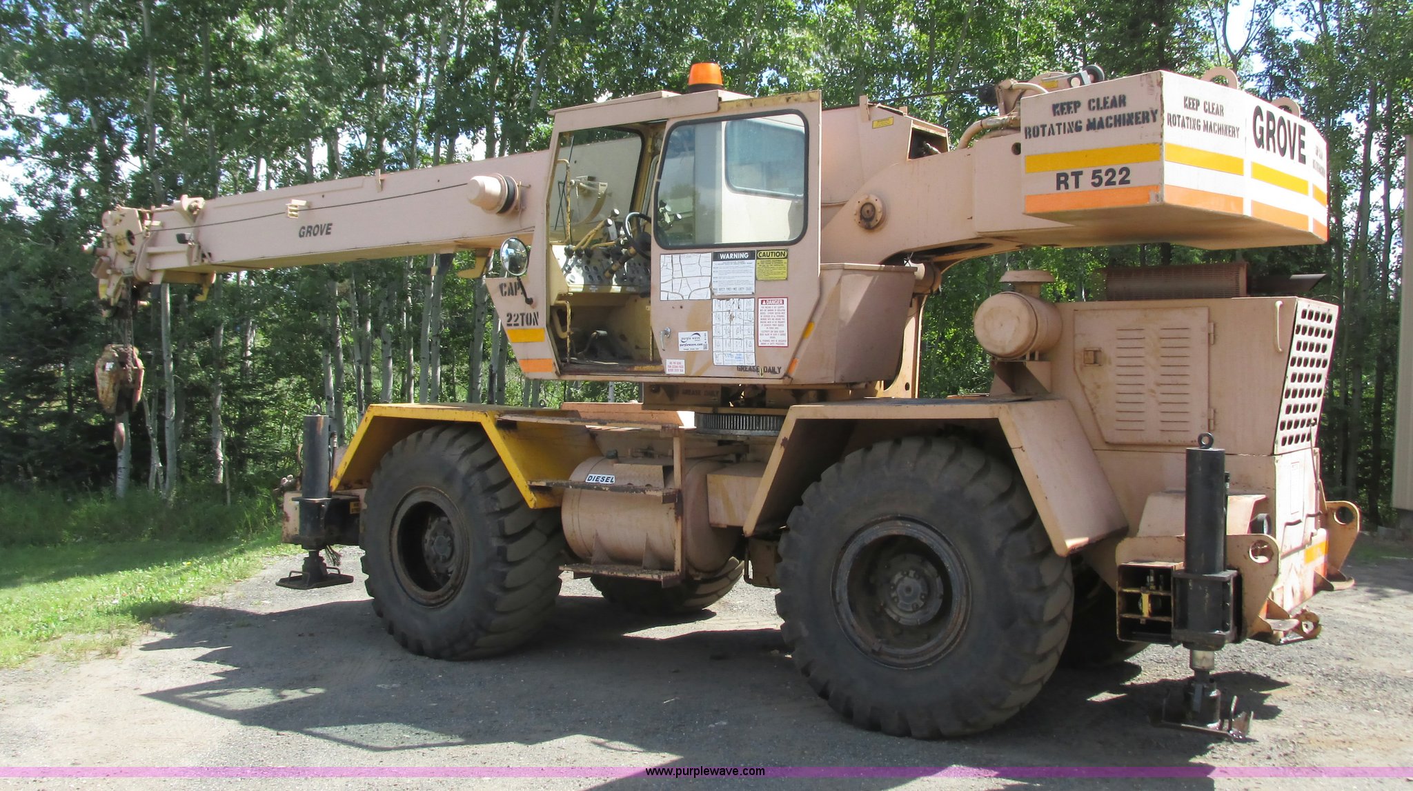 Purple Wave is selling a used Rough or All Terrain Crane in Minnesota. This item is a Grove RT522 crane with the following: 2,940 hours on meter, Detroit four cylinder turbo diesel enigne, Powershift transmission, 3F-3R gears, Heat, Stick crane controls, Work lights, Tandem axles, Telescopic Hydraulic crane, 70' boom length, 44,000 lbs maximum lift capacity, Single winch, In-cab boom controls, Crane block, (3) sheaves, Swing brake, Propane heater, (4) stabilizers, Air brakes, Tandem axle, (4) drive wheels, (2) steering wheels, 20.5-25 tires, Serial 50616