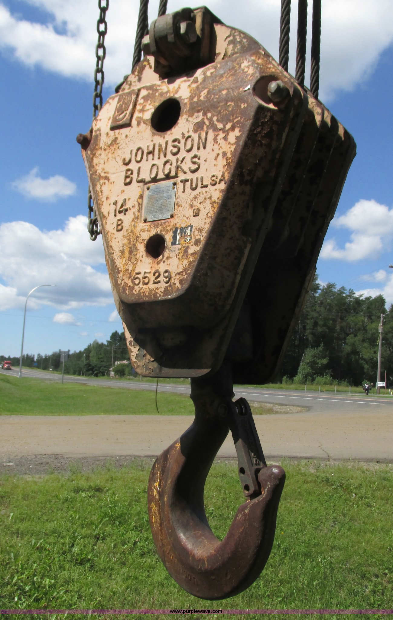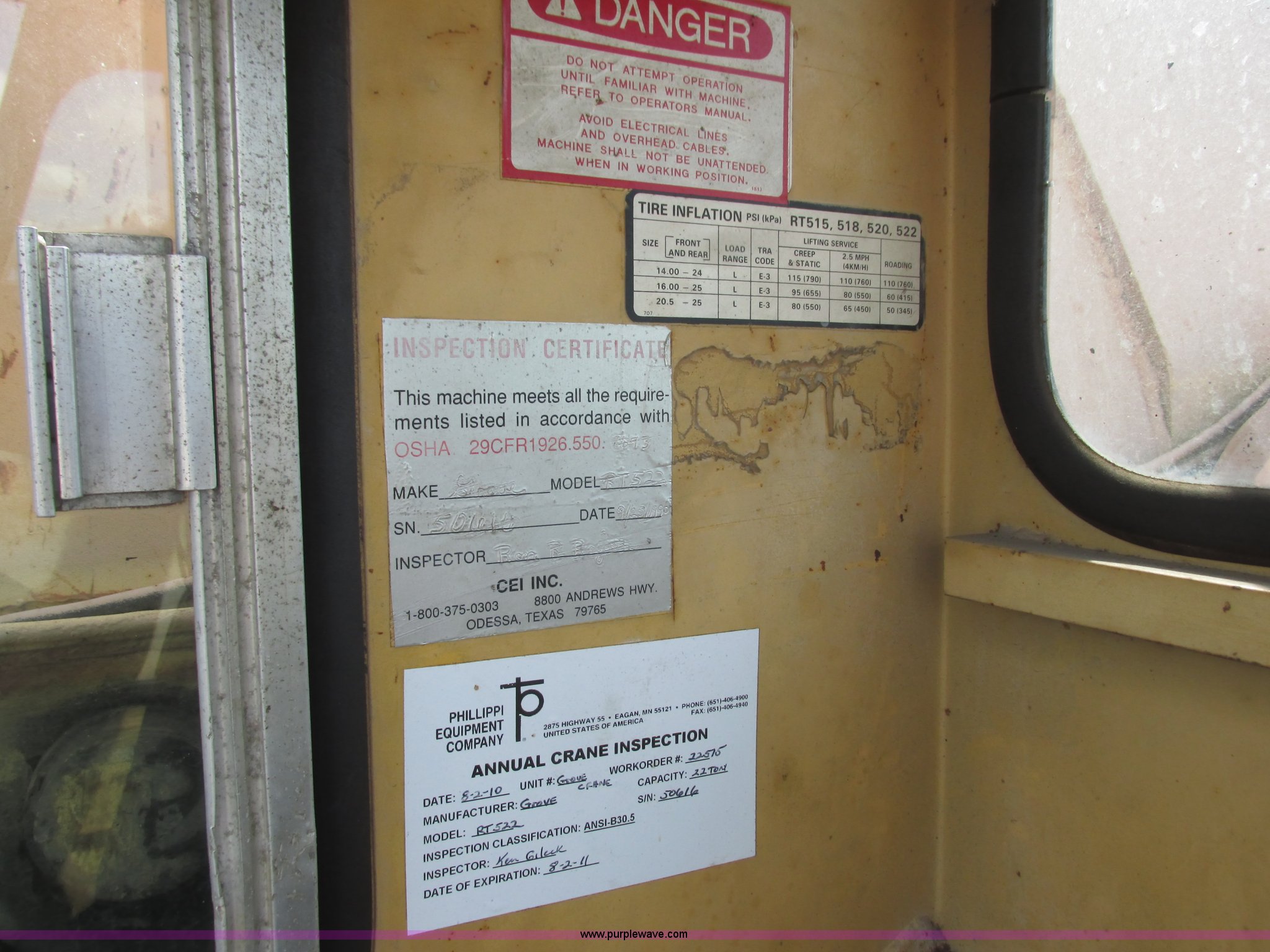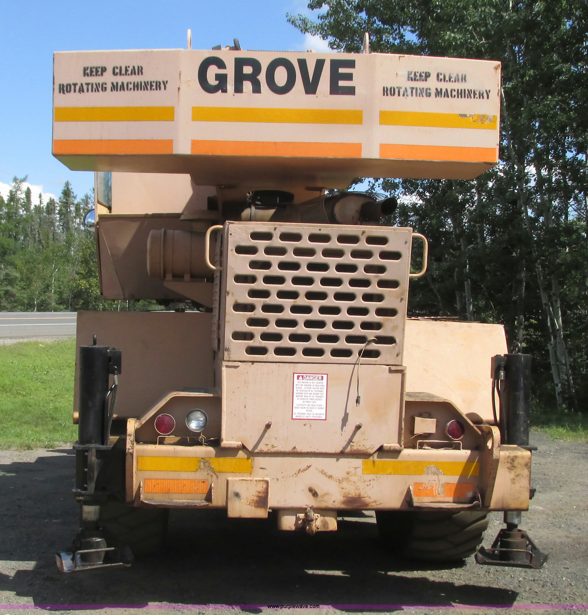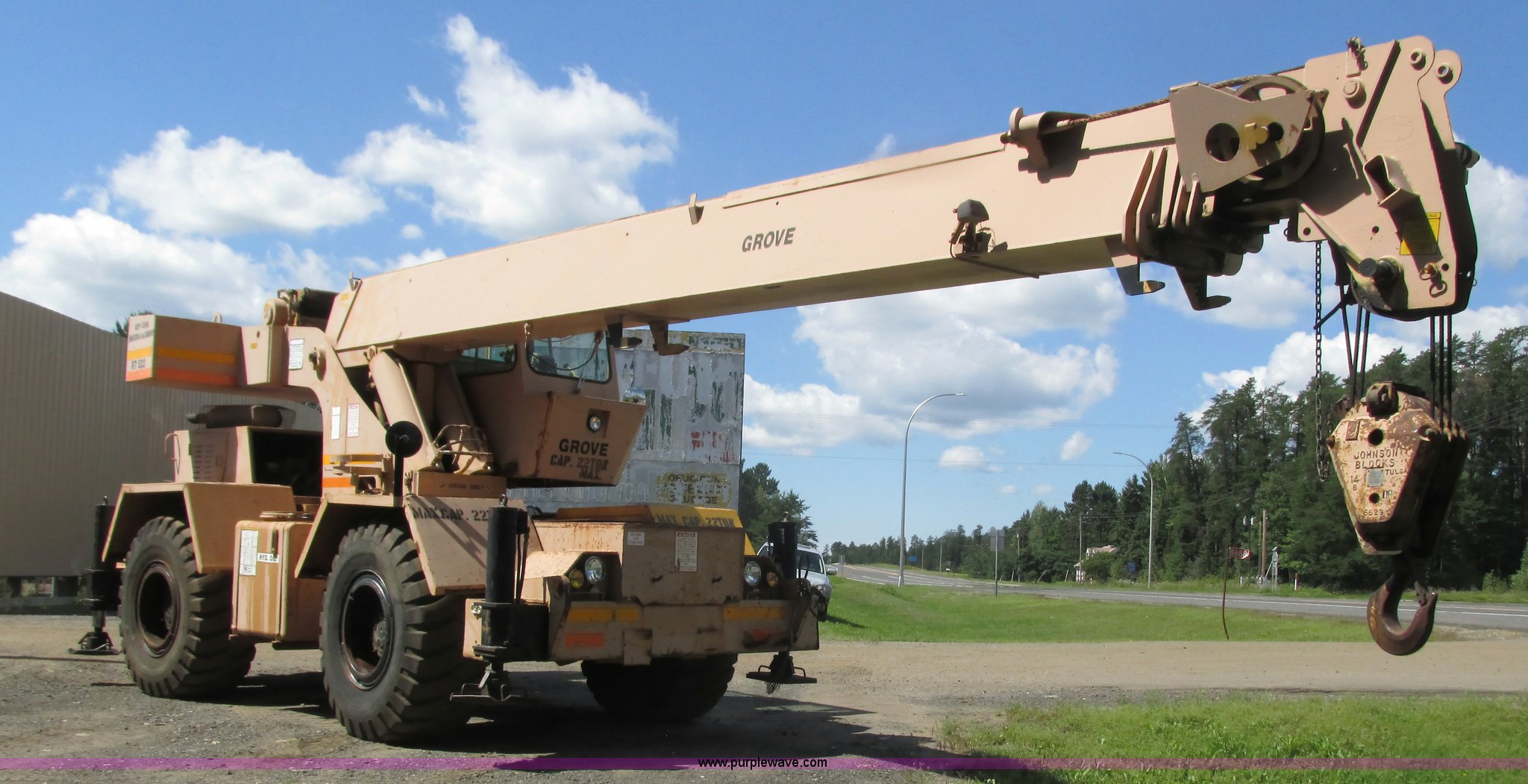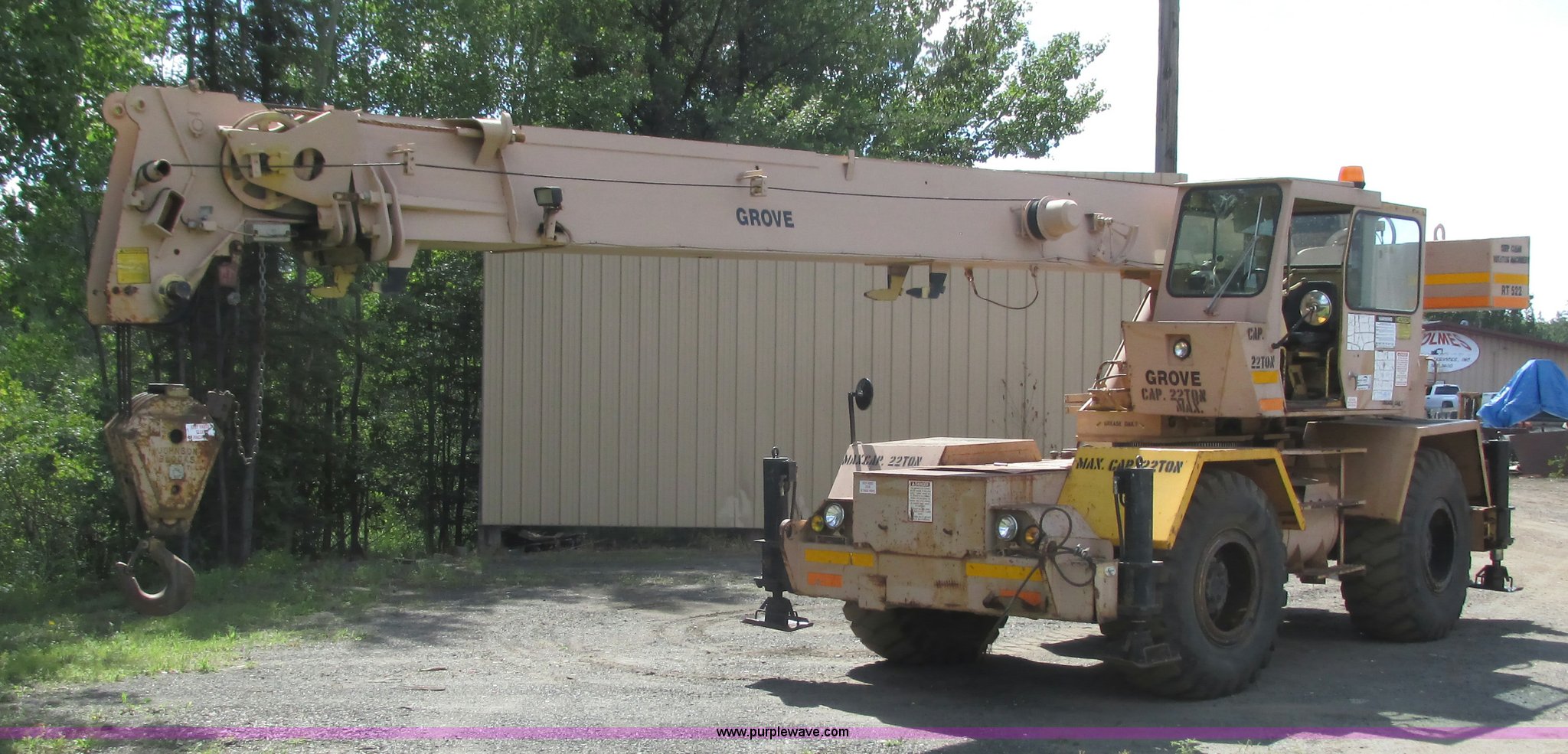 Purple Wave is selling a used Rough or All Terrain Crane in Minnesota. This item is a Grove RT522 crane with the following: 2,940 hours on meter, Detroit four cylinder turbo diesel enigne, Powershift transmission, 3F-3R gears, Heat, Stick crane controls, Work lights, Tandem axles, Telescopic Hydraulic crane, 70' boom length, 44,000 lbs maximum lift capacity, Single winch, In-cab boom controls, Crane block, (3) sheaves, Swing brake, Propane heater, (4) stabilizers, Air brakes, Tandem axle, (4) drive wheels, (2) steering wheels, 20.5-25 tires, Serial 50616