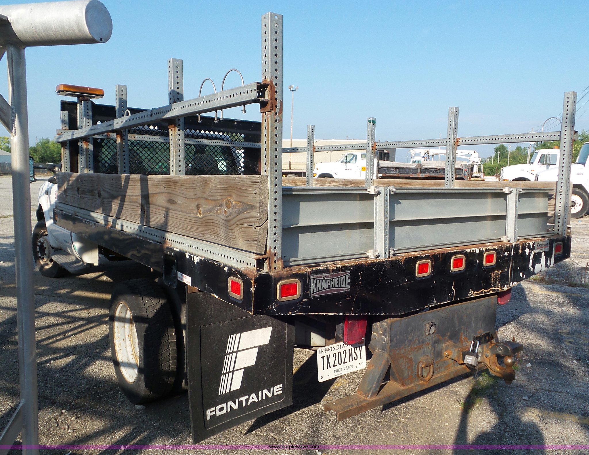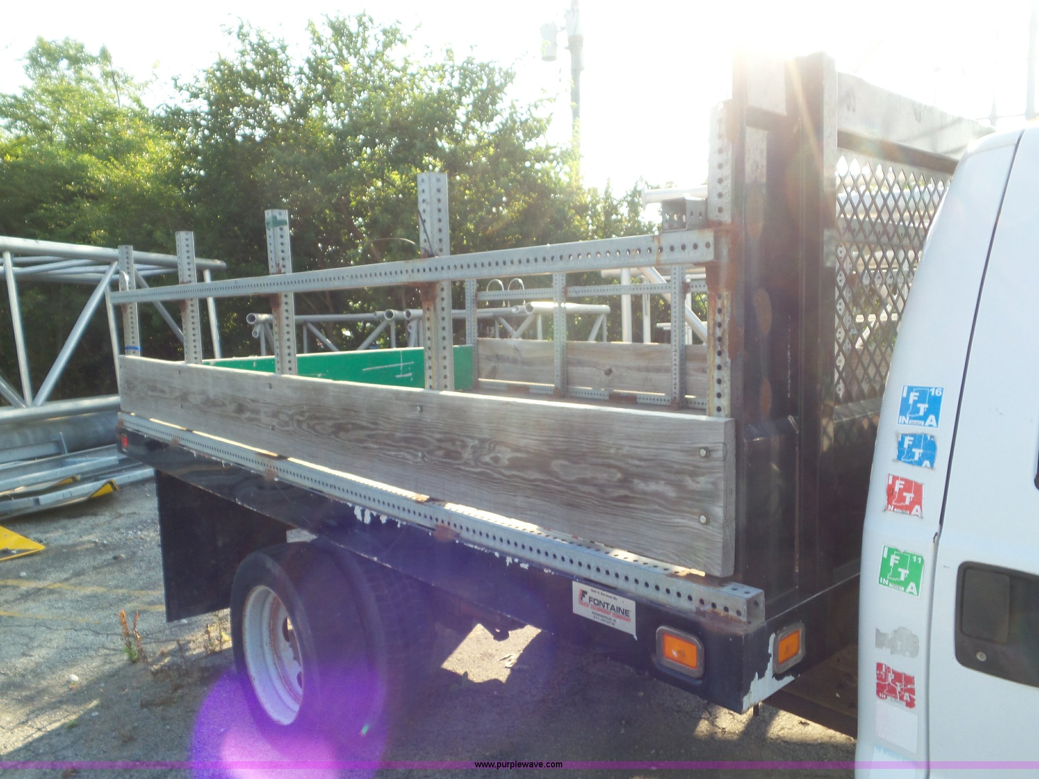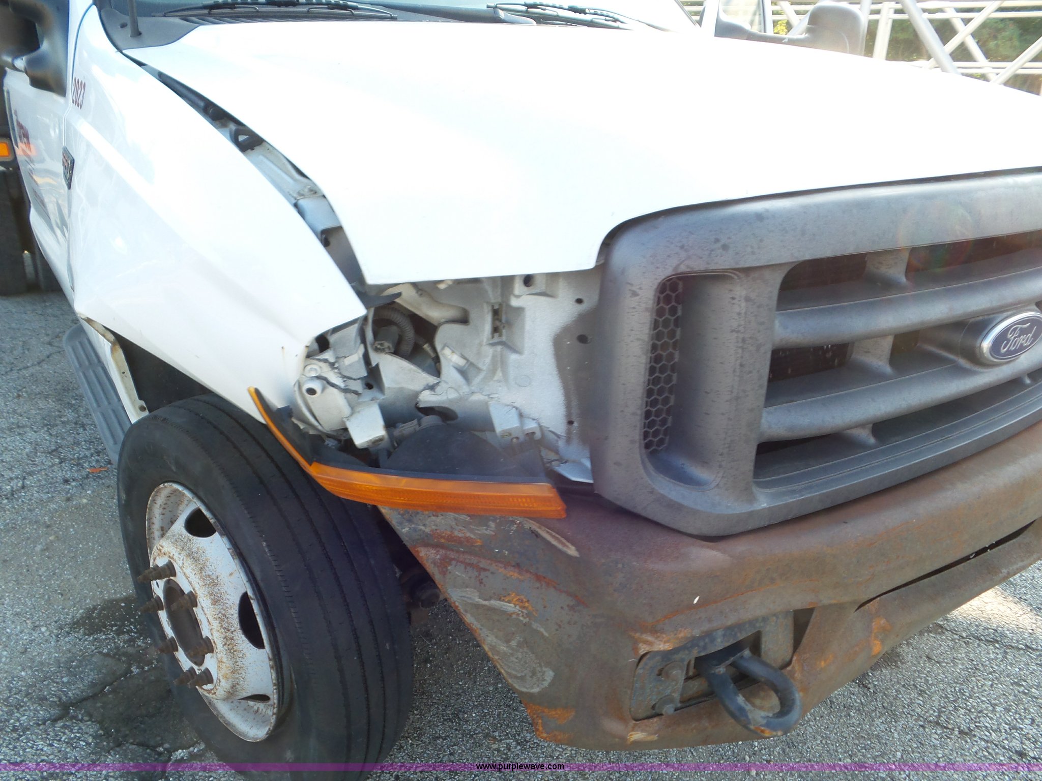 Purple Wave is selling a used Flat Bed Truck in Indiana. This item is a 2000 Ford F550 Super Duty flatbed truck with the following: 207,476 miles on odometer, 7.3L V8 OHV 16V diesel engine, Five speed manual transmission, AC and heat, Tilt, Cruise, AM/FM, Manual windows and locks, Vinyl interior, 12'L x 8'W flatbed, 3'H sideboards, Front tow hooks, Running boards, Receiver hitch, 225/70R19.5 tires, Windshield cracked, Seat torn, Tire flat, Front end damage, Non-operational vehicle, U-joint may need replaced, Unit# 2023