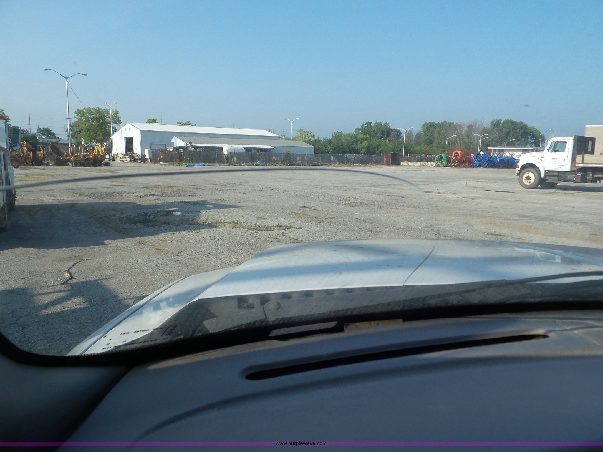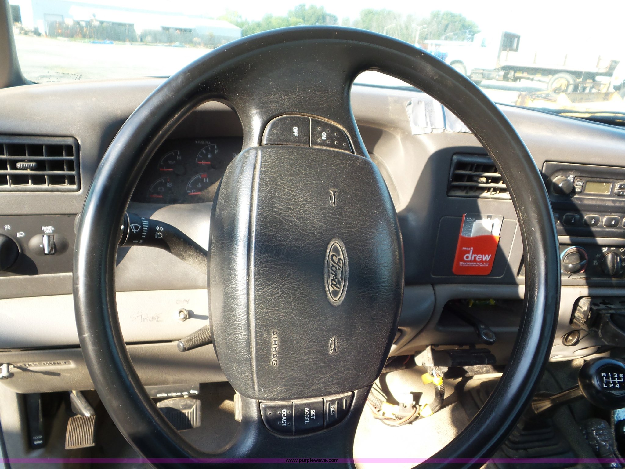 2000 Ford F550 Super Duty flatbed truck. 207,476 miles on odometer, 7.3L V8 OHV 16V diesel engine, Five speed manual transmission, AC and heat, Tilt, Cruise, AM/FM, Manual windows and locks, Vinyl interior, 12'L x 8'W flatbed 3'H sideboards, Front tow hooks, Running boards, Receiver hitch, 225/70R19.5 tires, Windshield cracked, Seat torn, Tire flat, Front end damage, Non-operational vehicle U-joint may need replaced, Unit# 2023. Indiana title. 1FDAF56F1YED33555. James H. Drew Corp.. 8701 Zionville Road. Indianapolis, IN 46268
