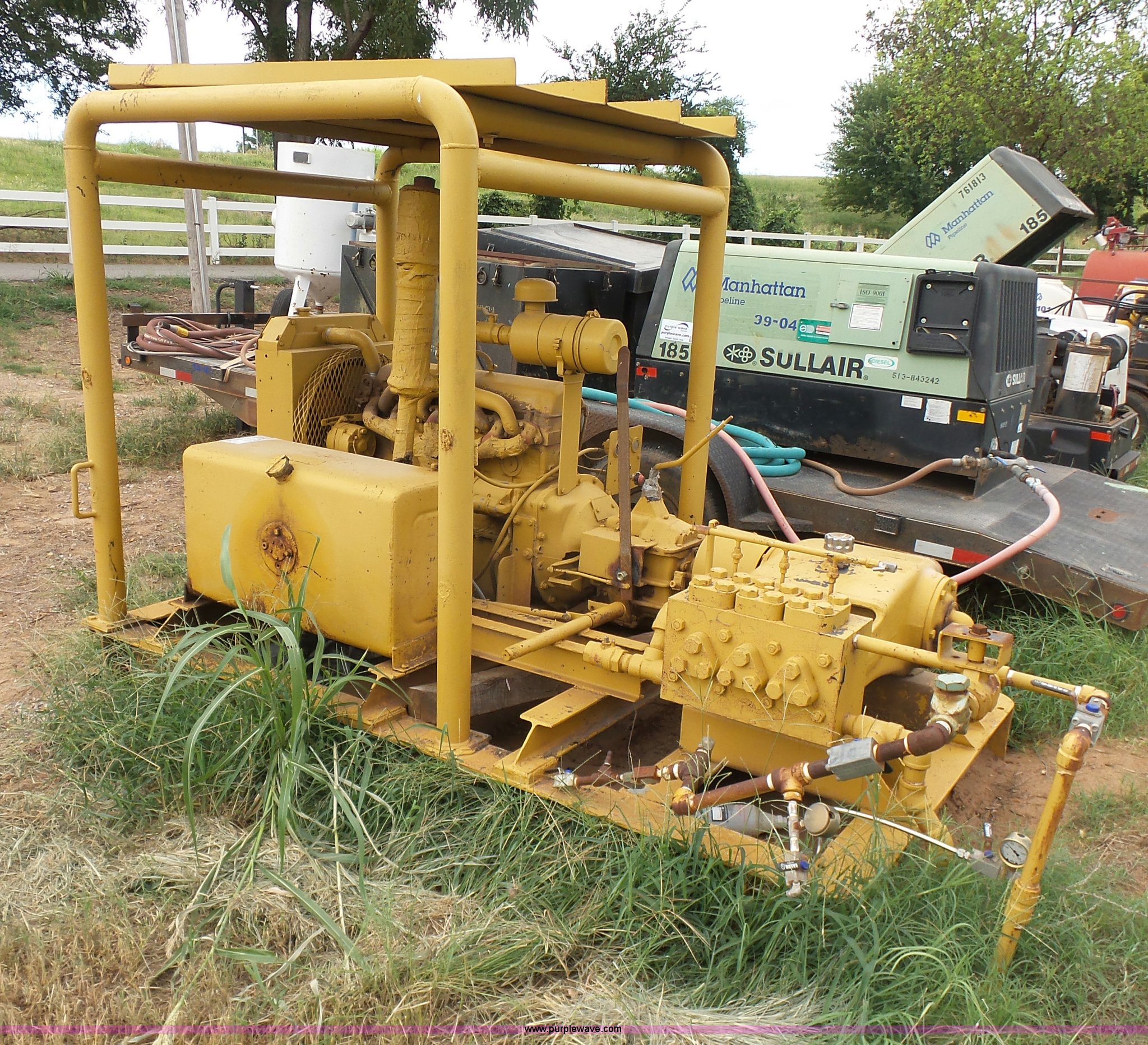 Shop built pressure testing pump station. Detroit Ford six cylinder diesel engine, 10'L x 5'W x 7'H, 50 gallon fuel tank, Assorted valves and plumbing, (3) pump cylinders. Manhattan Pipeline - Open inspection Wednesday, September 14. 31200 I-40 Service Road. Hinton, OK 73047