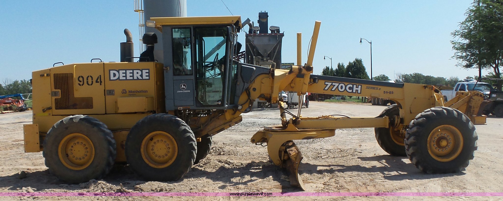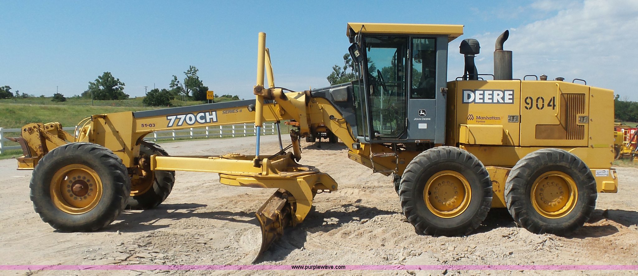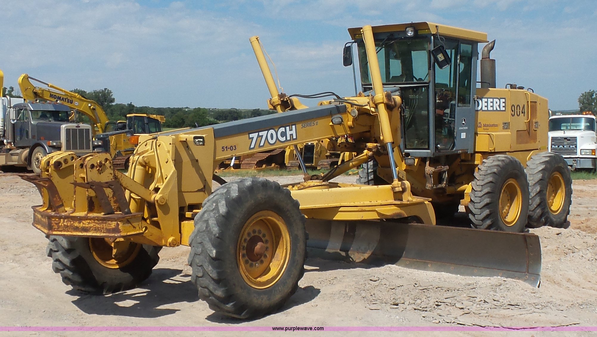 Purple Wave is selling a used Motor Grader in Oklahoma. This item is a 2002 John Deere 770CH Series II motor grader with the following: 10,328 hours on meter, John Deere 6081HDW10 six cylinder turbo diesel engine, Serial RG6081H156212, Powershift transmission, 8F-8R gears, Differential lock, EROPS, AC and heat, AM/FM, Air suspension seat, Nine hydraulic control valves, Front and rear wipers, Front work lights, 16' moldboard, Tip control, Side shift, Front mounted scarifier, (9) teeth capacity, (6) teeth, 14.00-24TG tires, 31,500 lbs. base operating weight, Serial DW770CH584904, Unit# 51-03