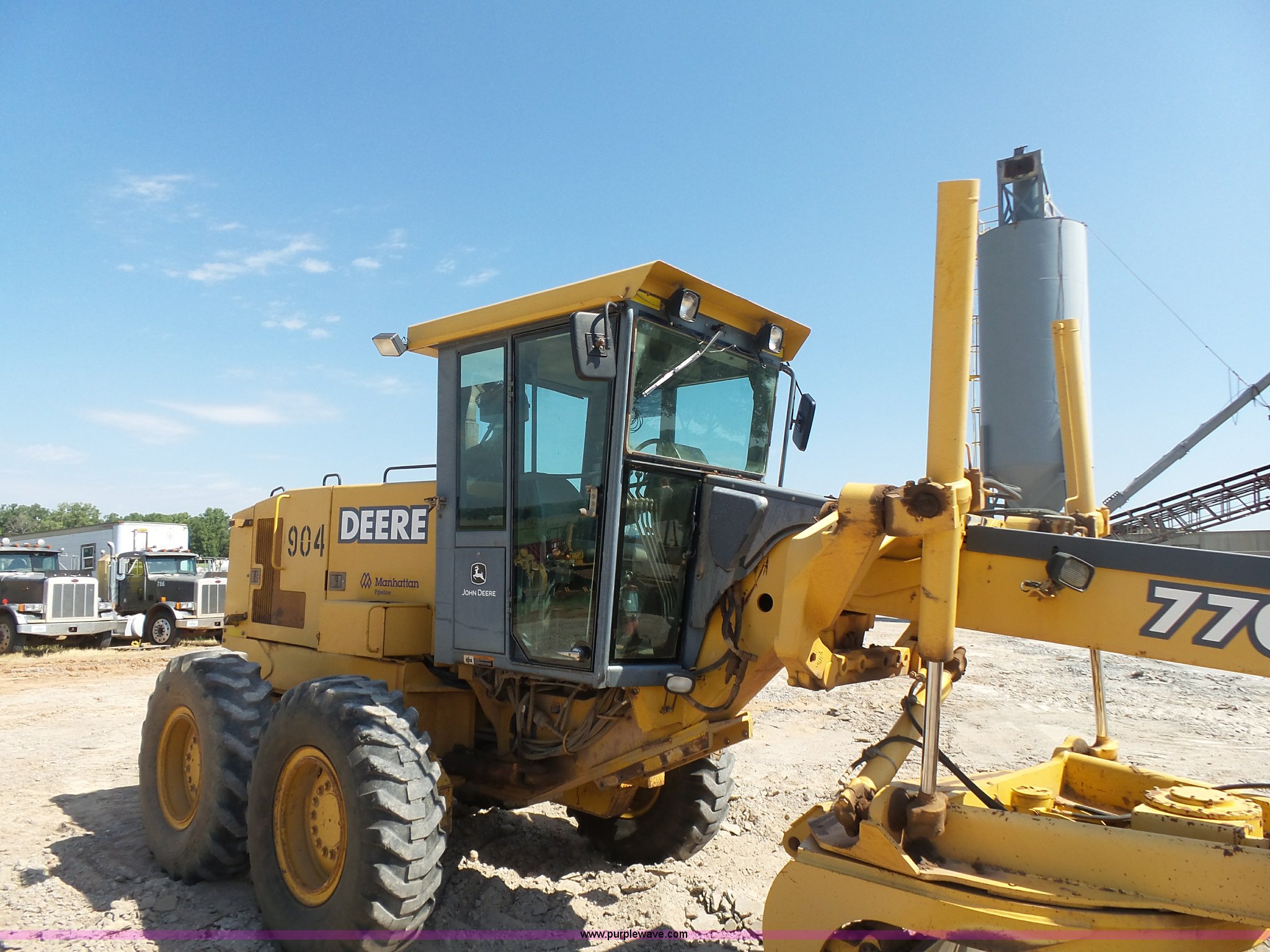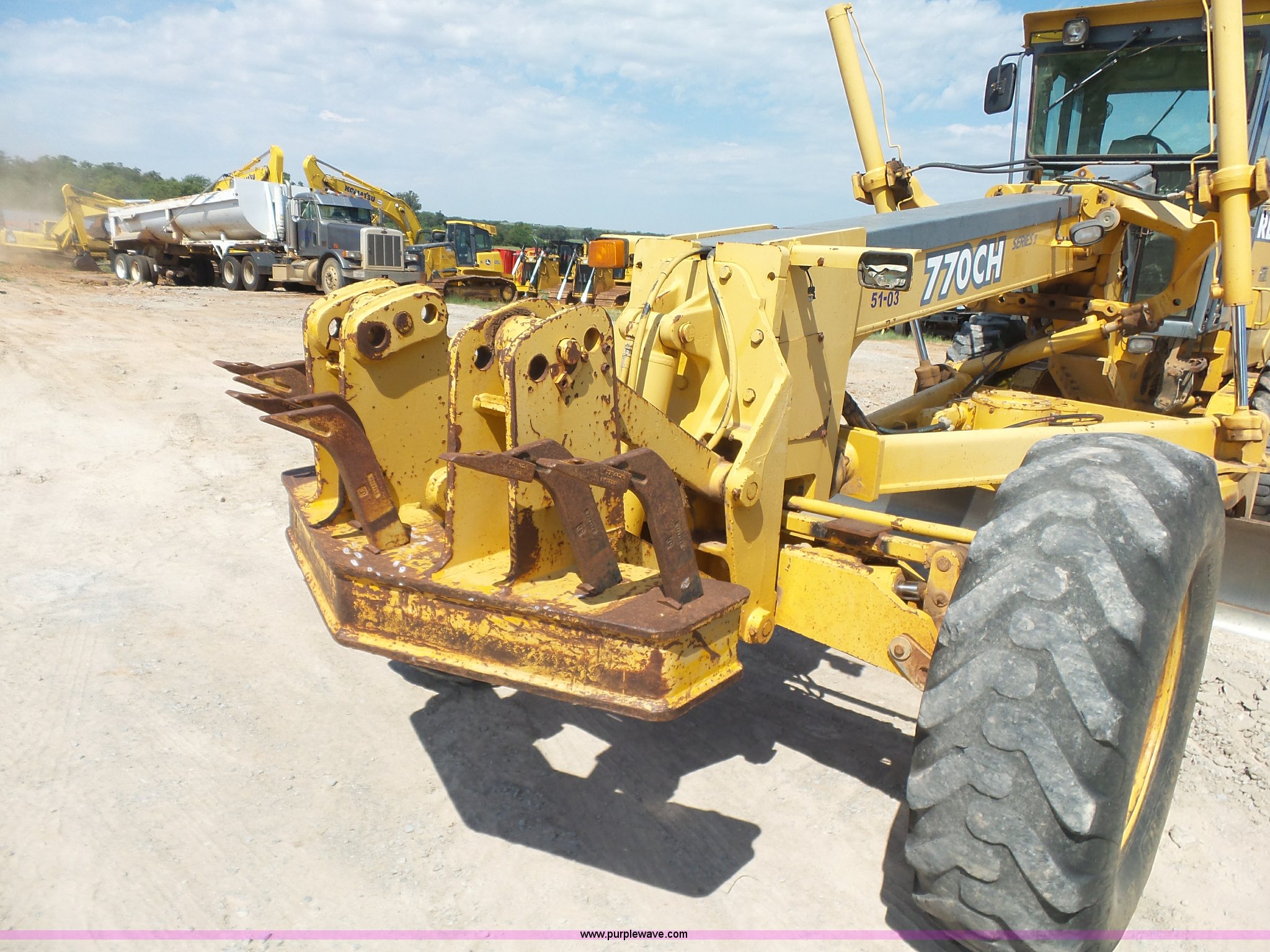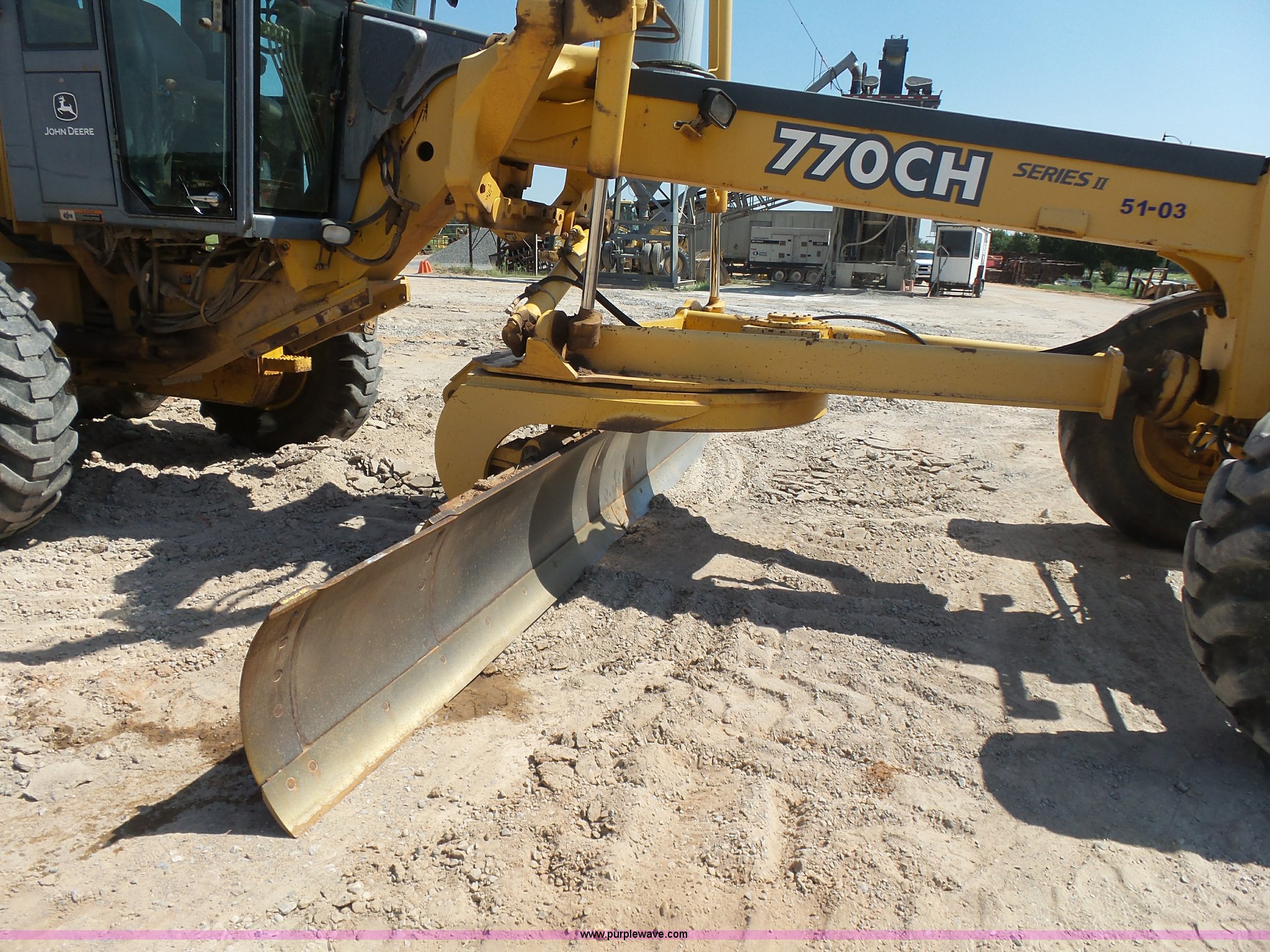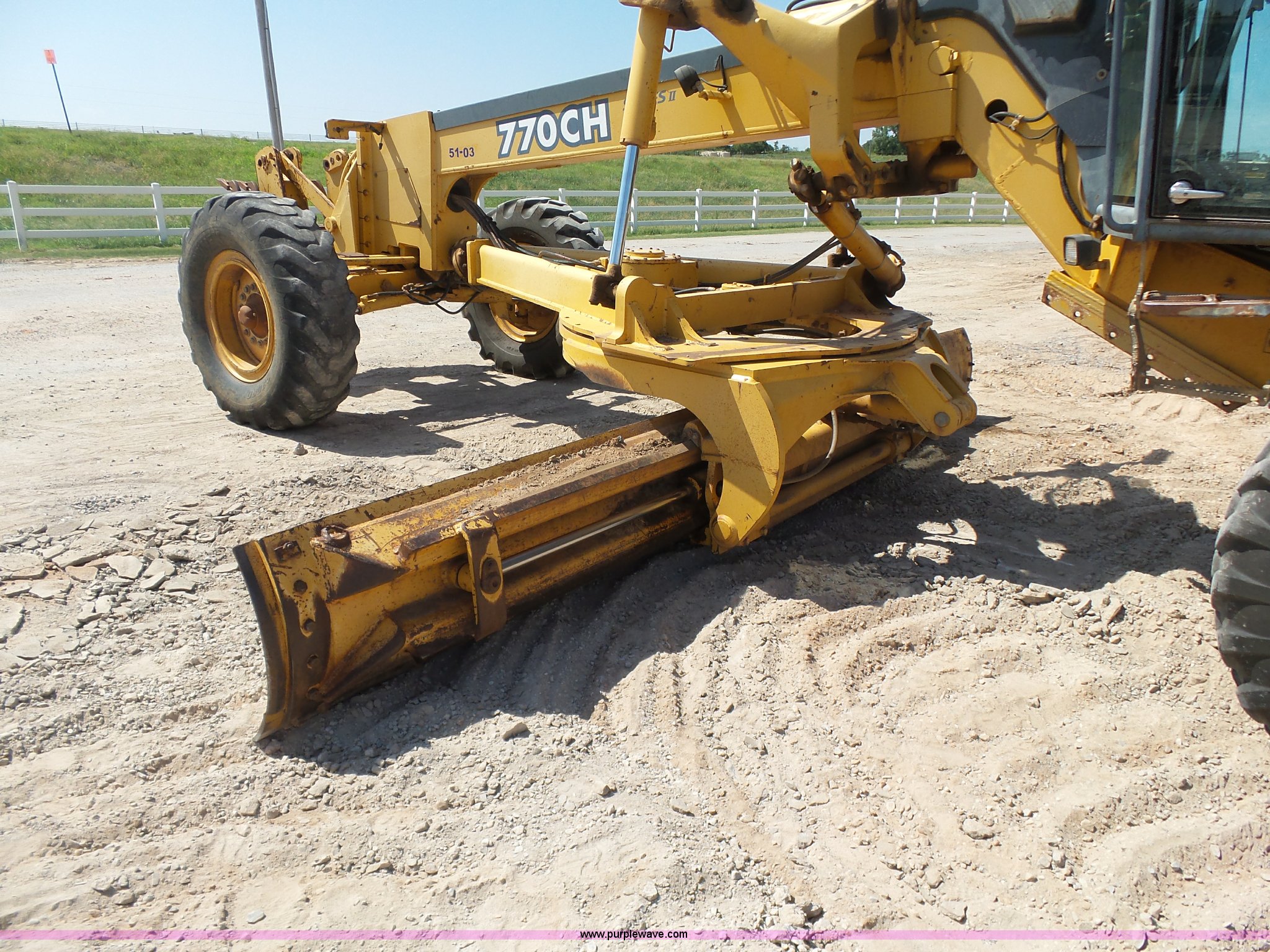 Purple Wave is selling a used Motor Grader in Oklahoma. This item is a 2002 John Deere 770CH Series II motor grader with the following: 10,328 hours on meter, John Deere 6081HDW10 six cylinder turbo diesel engine, Serial RG6081H156212, Powershift transmission, 8F-8R gears, Differential lock, EROPS, AC and heat, AM/FM, Air suspension seat, Nine hydraulic control valves, Front and rear wipers, Front work lights, 16' moldboard, Tip control, Side shift, Front mounted scarifier, (9) teeth capacity, (6) teeth, 14.00-24TG tires, 31,500 lbs. base operating weight, Serial DW770CH584904, Unit# 51-03