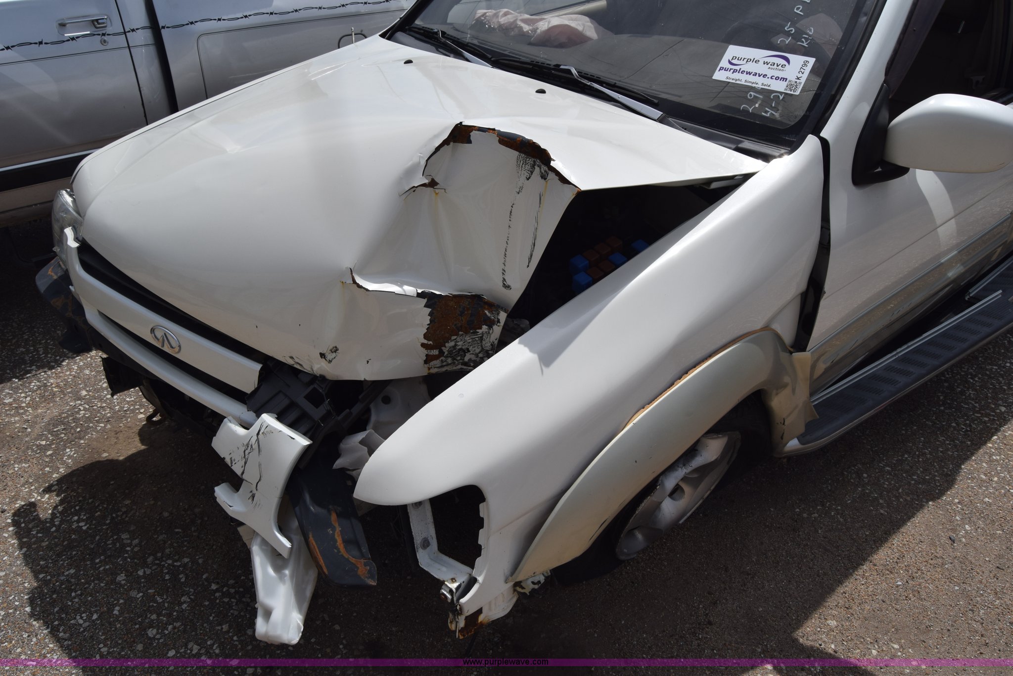 1998 Infiniti QX4. Unknown miles on odometer, 3.3L V6 SOHC 12V gas engine, Automatic transmission, AC and heat, Tilt, Cruise, AM/FM/CD/cassette, Power windows, locks, mirrors, and seat, Leather interior, Key, 245/75R16 tires, Dead battery, Major body damage, Air bags deployed, Case# 16C027732. Vehicle is abandoned. Condition and history are unknown. No additional information is available. Vehicle does not have keys unless notated otherwise in the item listing.. View City Of Wichita Terms for title acquisition and item removal requirements.. JNRAR05YXWW032873. Bud Roat Towing. 310 N Handley St. Wichita, KS 67203