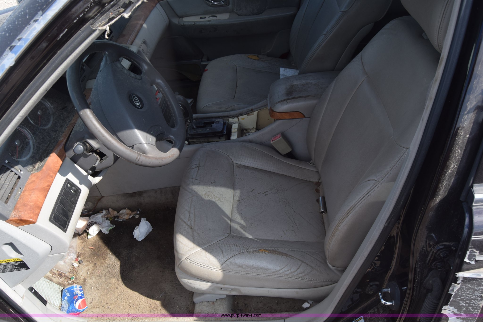 Purple Wave is selling a used Passenger Vehicle in Kansas. This item is a 2004 Kia Amanti with the following: Unknown miles on odometer, 3.5L V6 DOHC 16V gas engine, Automatic transmission, AC and heat, Tilt, Cruise, Power windows, locks, and mirrors, Leather interior, 225/60R16 tires, Body damage, Stereo removed, Case# 16C036958