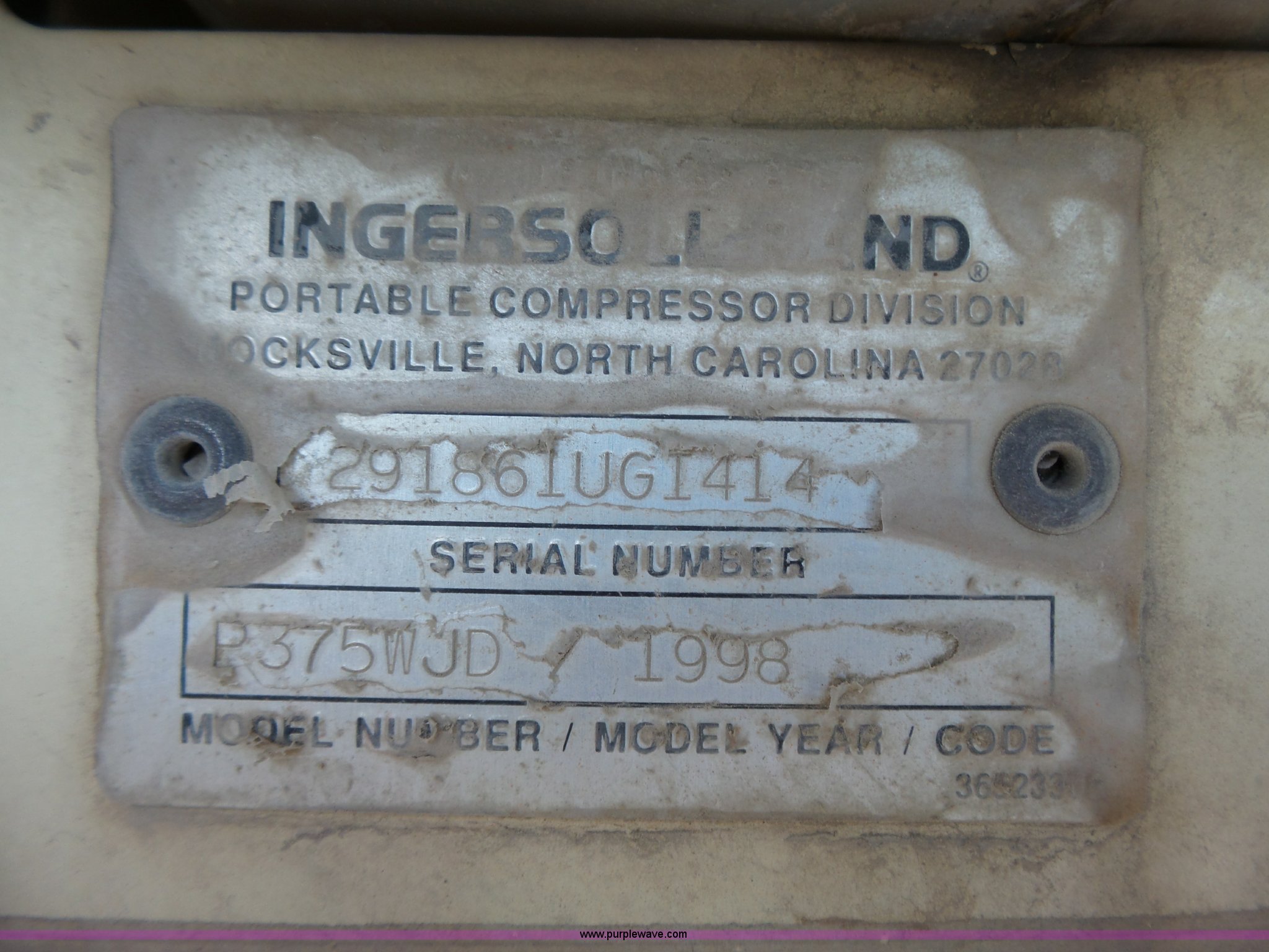 1998 Ingersoll Rand 375 air compressor. 1,520 hours on meter, John Deere 4045 4.5L four cylinder turbo diesel engine, 375 cfm, Pintle hitch, 225/75R15 tires, Equip ID NF025, Serial 291861U6I414, Asset# 330072. Transfer of ownership documentation will be a bill of sale. South Dakota Property Management. Mitchell, SD 57301