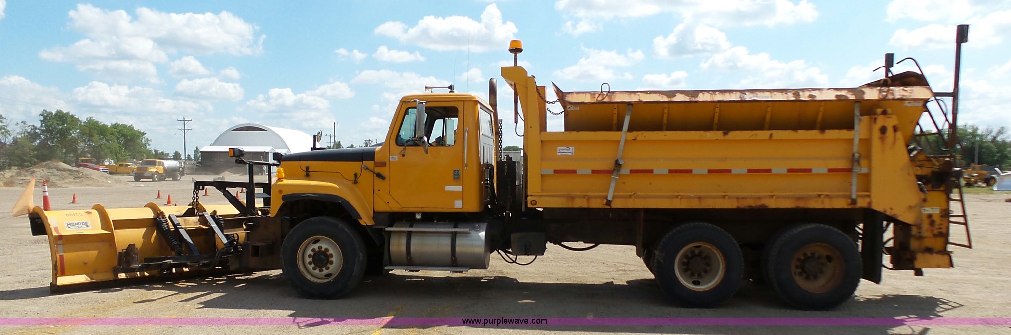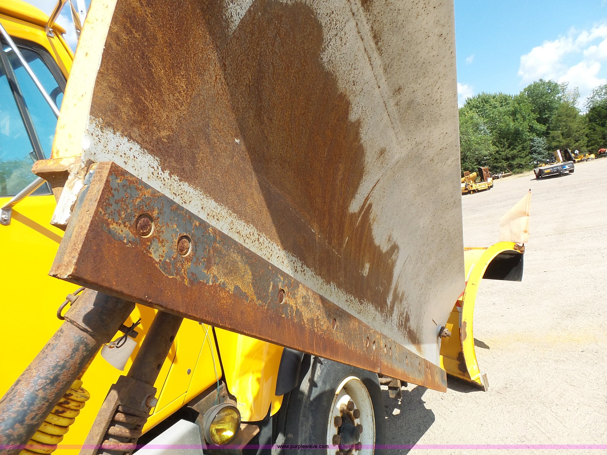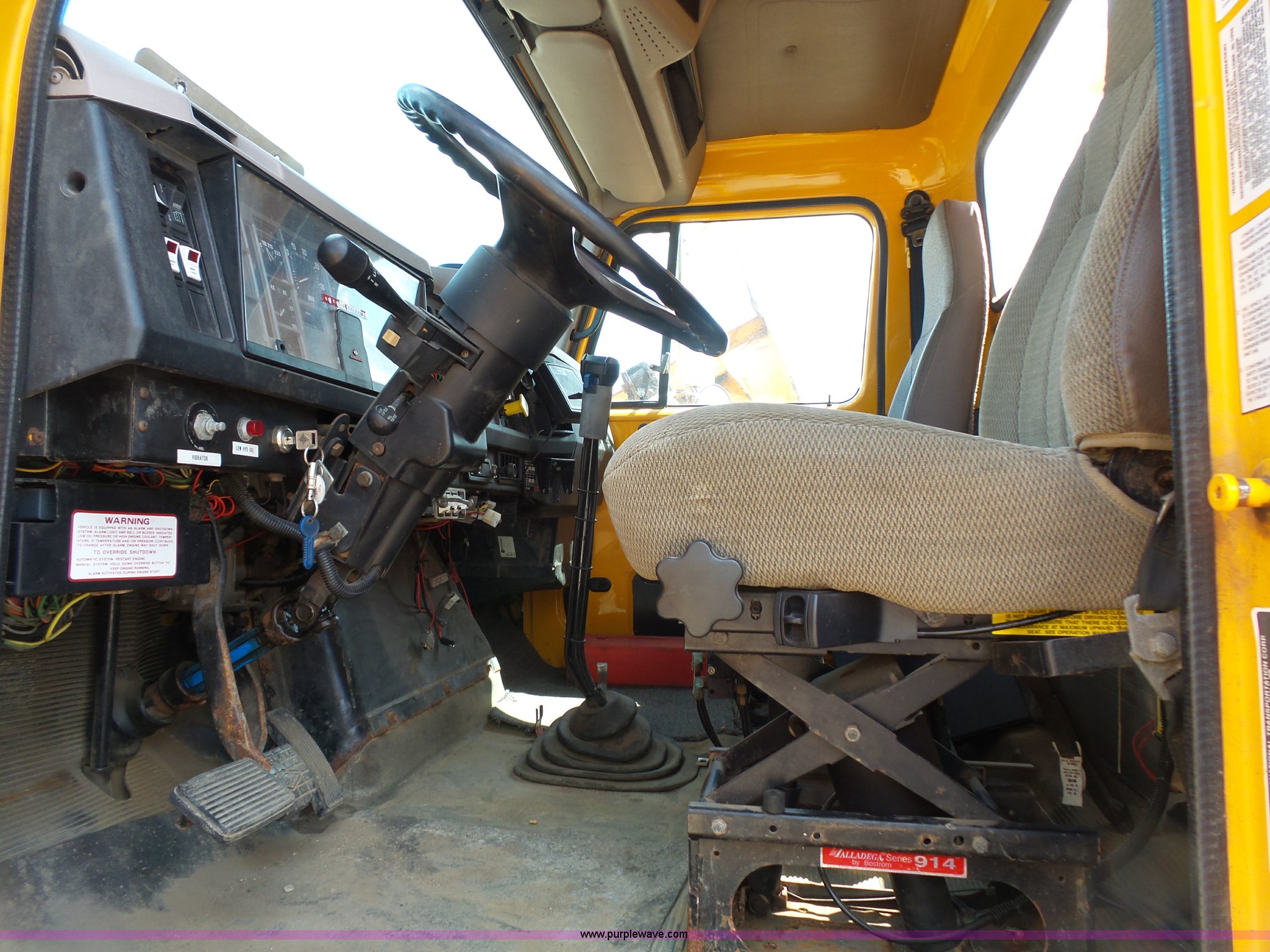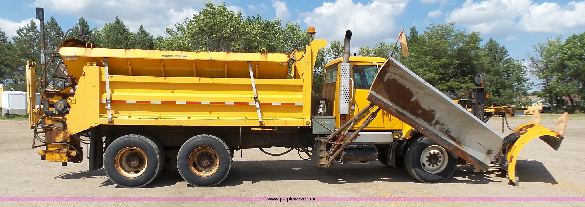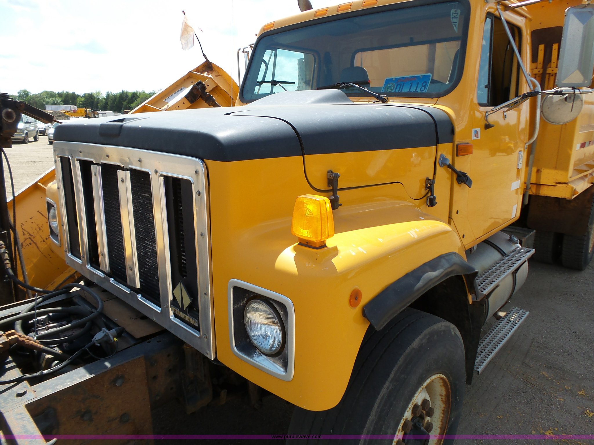 Purple Wave is selling a used Construction Dump Truck in South Dakota. This item is a 1996 International 2554 dump truck with the following: 118,641 miles on odometer, 5,406 hours on meter, International DT530 8.7L L6 turbo diesel engine, Eight speed manual transmission, Tandem axle, Heat, AM/FM, Air suspension seat, Plow and spreader controls, Front mount PTO, 15'L x 8'W steel dump bed, 30.5" side height, Monroe plow, 12'W, Equip ID RD152, Monroe leveling wing, 10'W, Worn, Equip ID RR322, Monroe MSV168-84 spreader, 15'L x 8'W, Equip ID RN285, Asset# 344349, Single fuel tank, Spring over walking beam suspension, Air brakes, 210" wheelbase, 385/65R22.5 front tires, 11R22.5 rear tires, Rust, Headlights work intermittently, Coolant leaks, Fuel shut-off issues, Hydraulic leaks, Weak batteries, Air leaks, Electrical issues, Frog on plow bent, Equip ID DL118, Asset# 320040