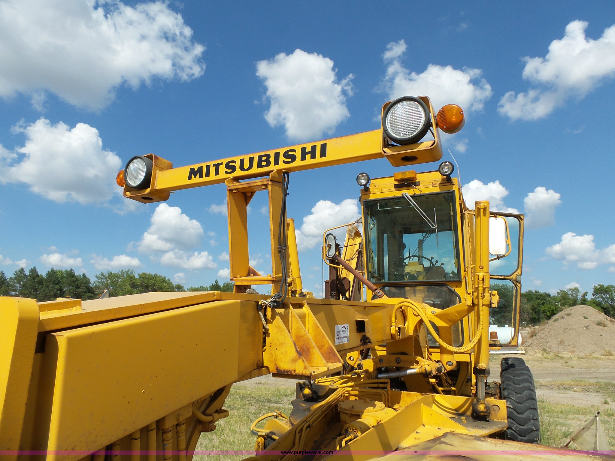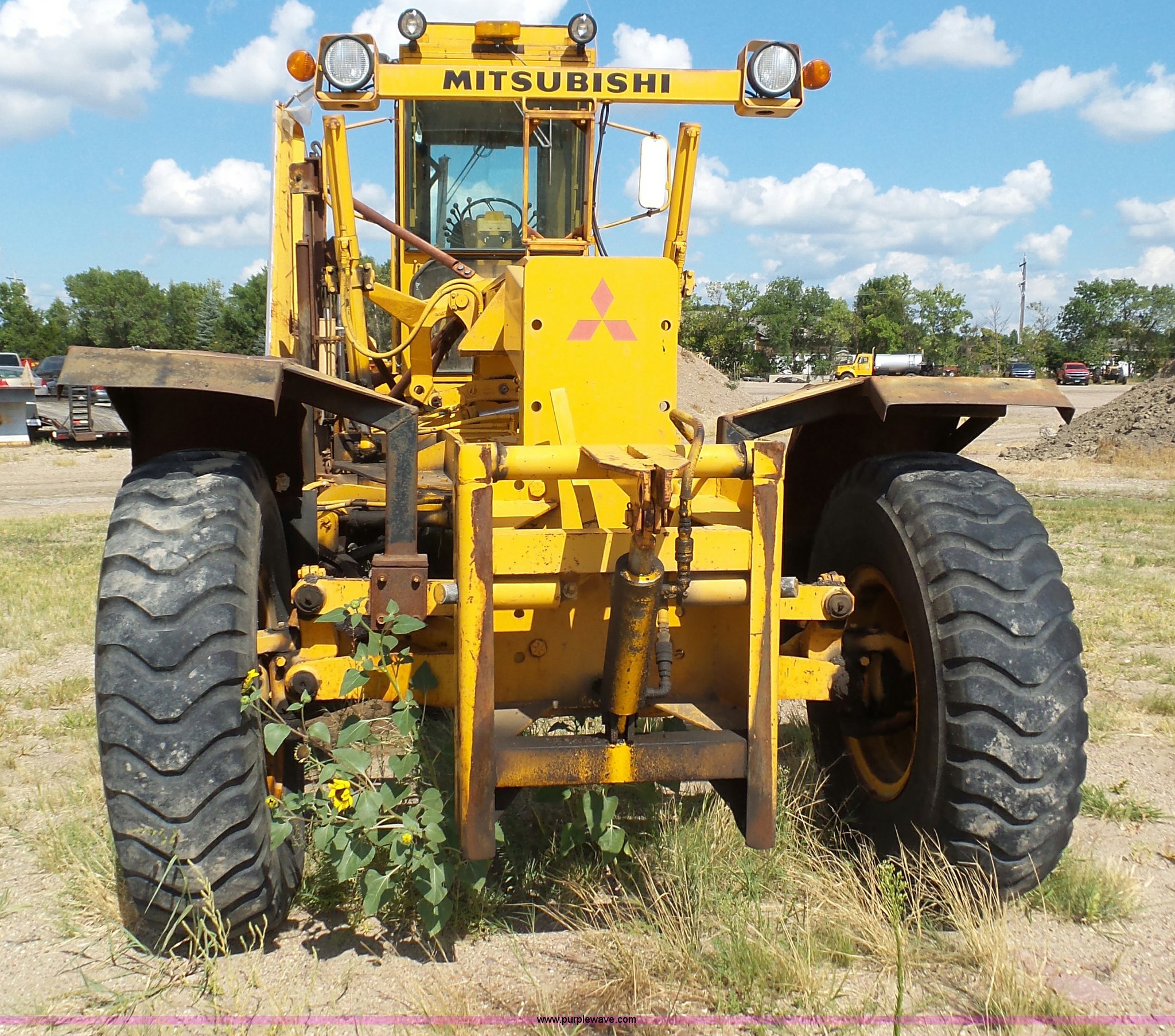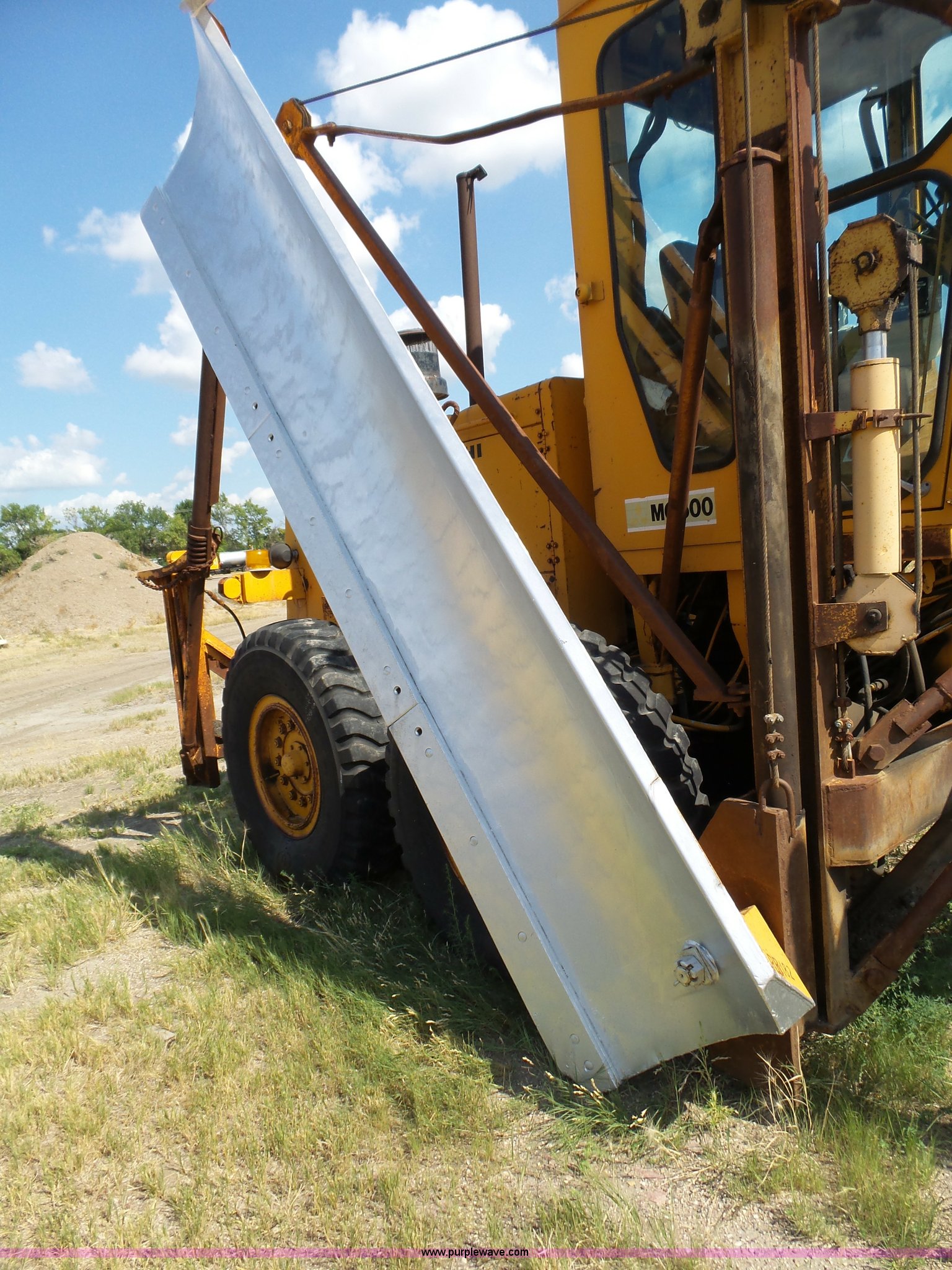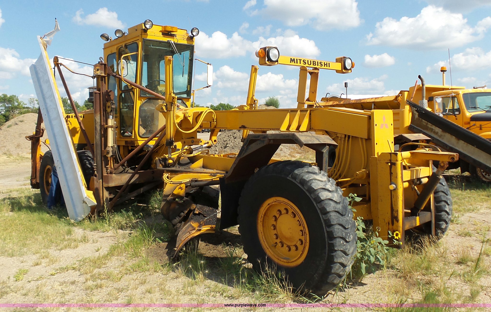 Purple Wave is selling a used Motor Grader in South Dakota. This item is a 1985 Mitsubishi MG500 motor grader with the following: 1,495 hours on meter, Six cylinder turbo diesel engine, Powershift transmission, 6F-6R gears, Differential lock, EROPS, Heat, Suspension seat, Front work lights, 14'W moldboard, Tip control, Side shift, Falls V-90 snow plow, 12'W, Equip ID RE606, Falls W12 snow wing, 12'W, Equip ID RR182, 14.00R24 tires, Differential lock leaks and is broken, Rust, Transmission issues, will not move forward, Unknown operating condition, Equip ID FJ645, Serial 5G000205, Asset# 303309