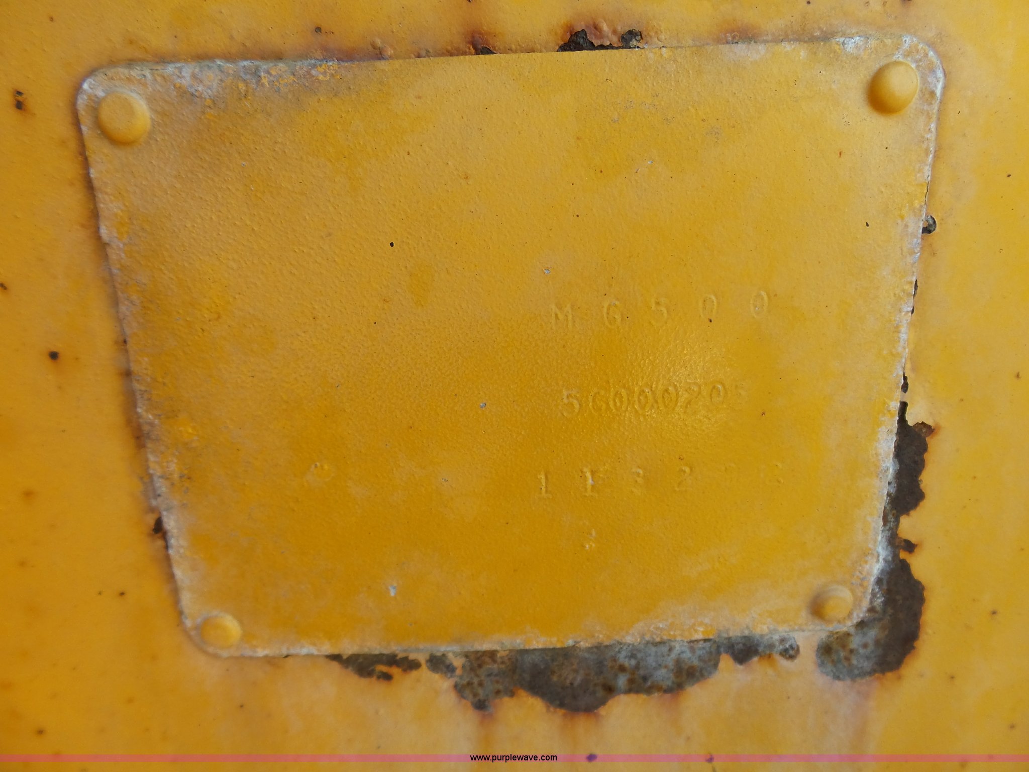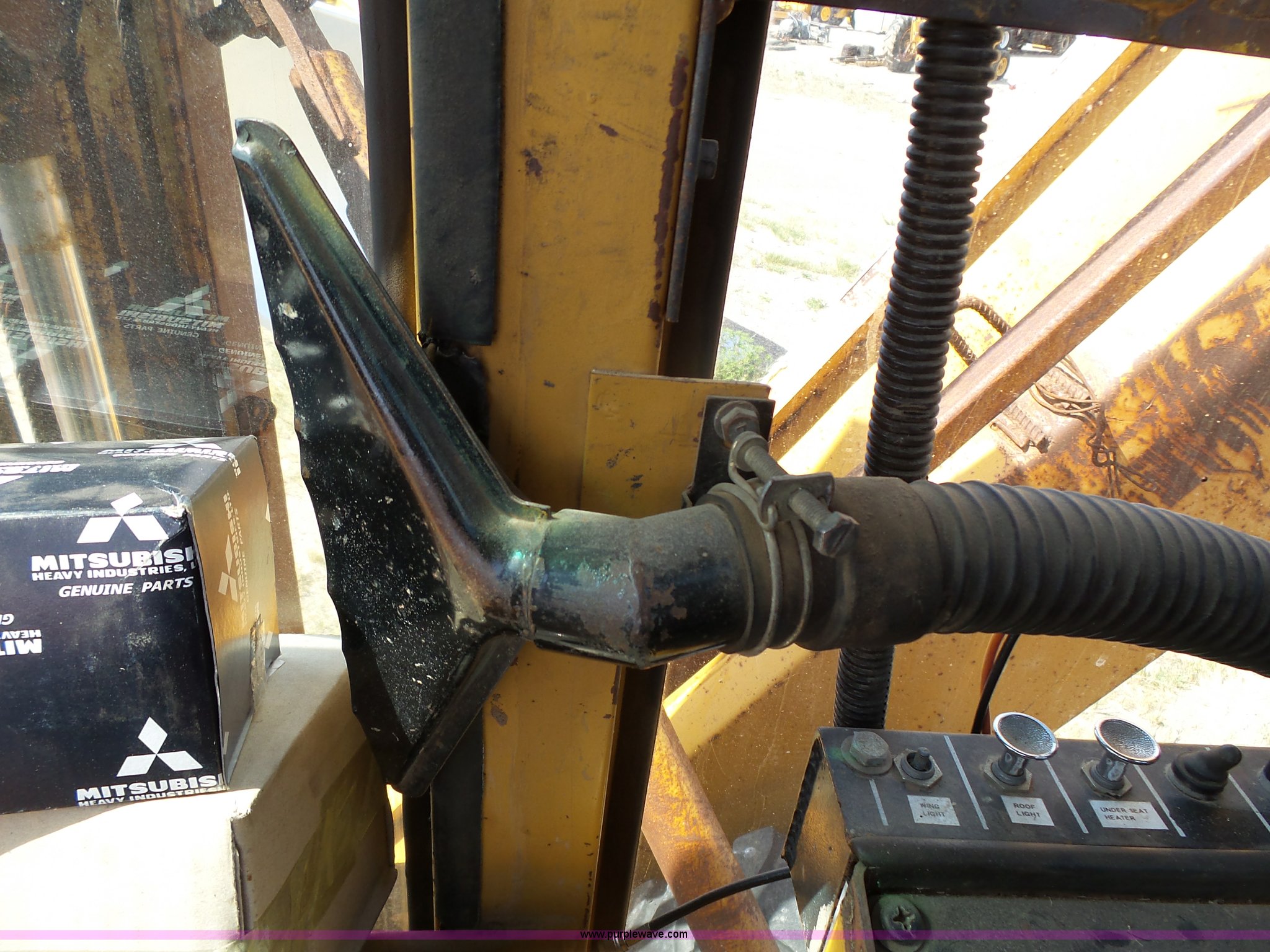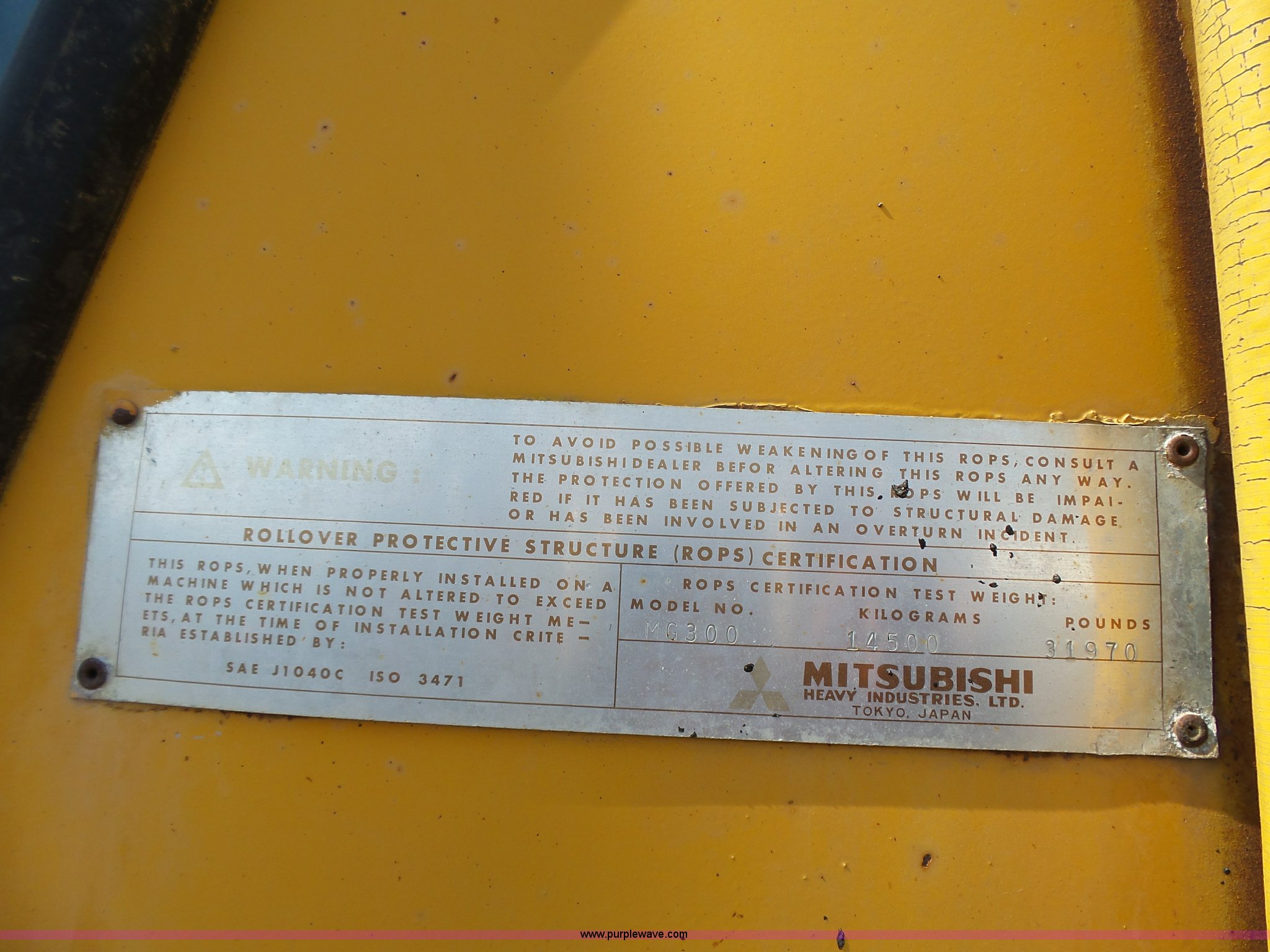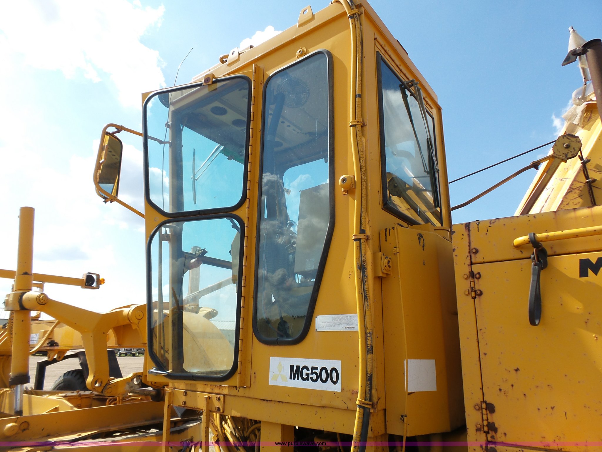 Purple Wave is selling a used Motor Grader in South Dakota. This item is a 1985 Mitsubishi MG500 motor grader with the following: 1,495 hours on meter, Six cylinder turbo diesel engine, Powershift transmission, 6F-6R gears, Differential lock, EROPS, Heat, Suspension seat, Front work lights, 14'W moldboard, Tip control, Side shift, Falls V-90 snow plow, 12'W, Equip ID RE606, Falls W12 snow wing, 12'W, Equip ID RR182, 14.00R24 tires, Differential lock leaks and is broken, Rust, Transmission issues, will not move forward, Unknown operating condition, Equip ID FJ645, Serial 5G000205, Asset# 303309