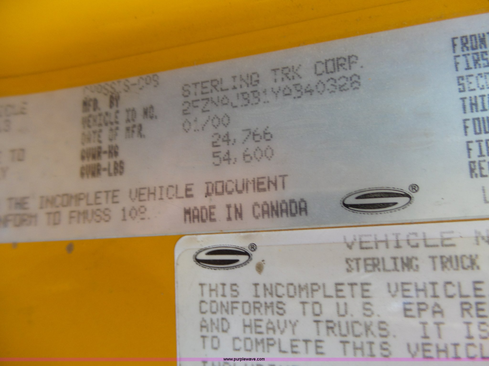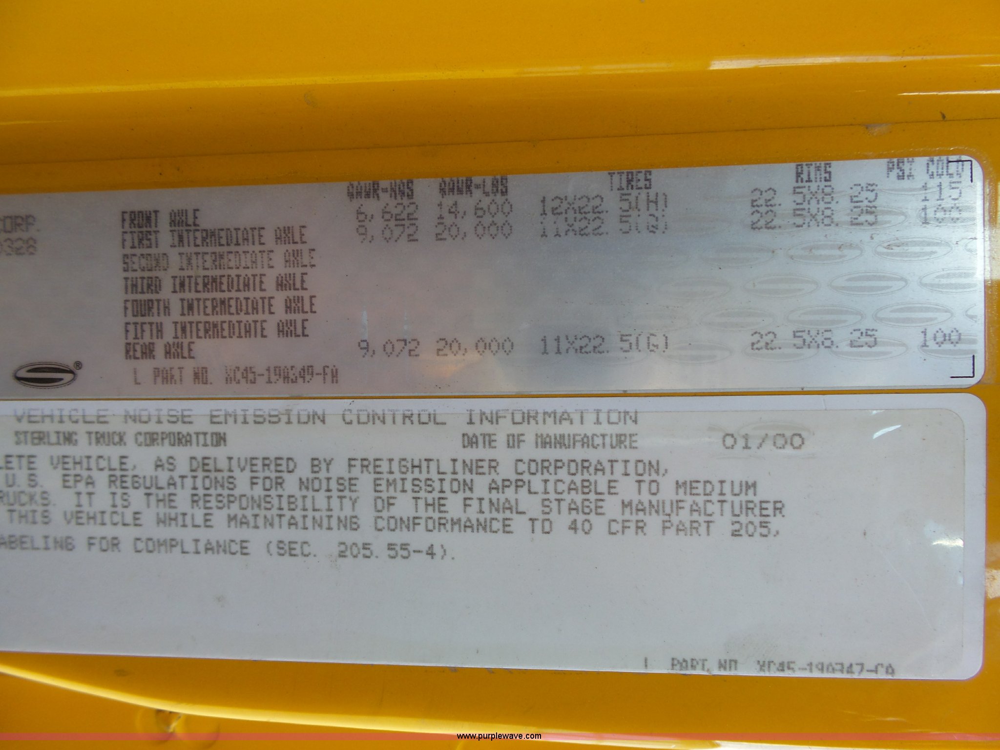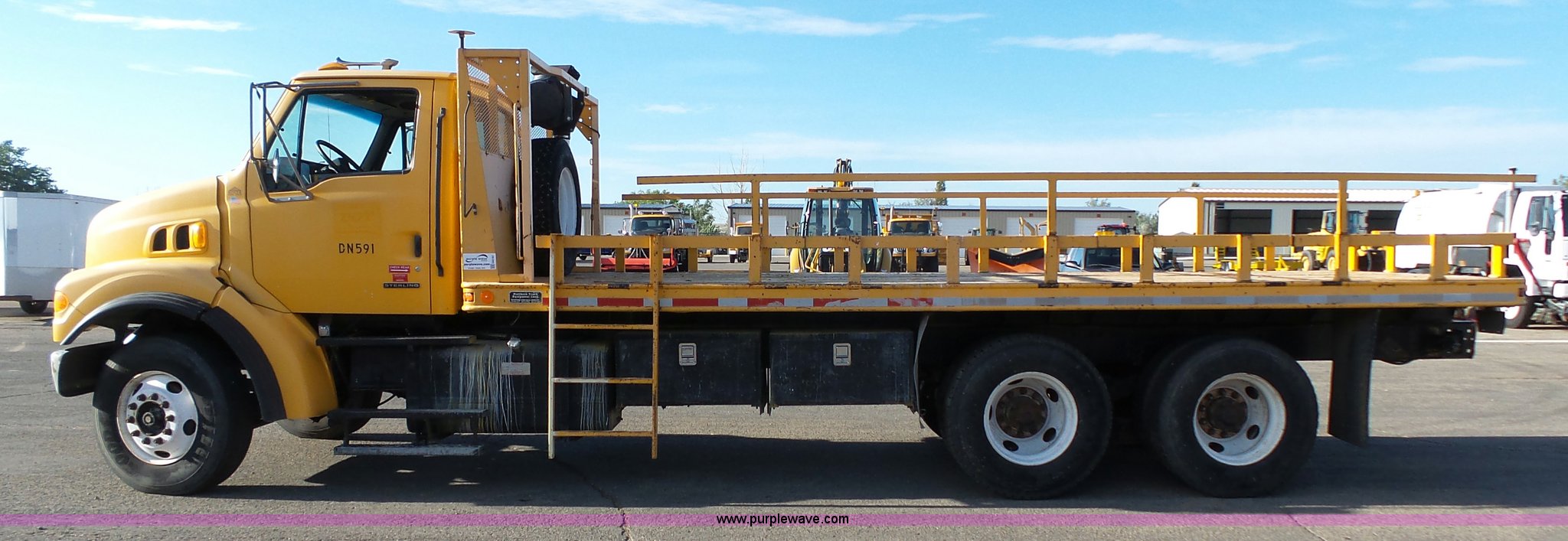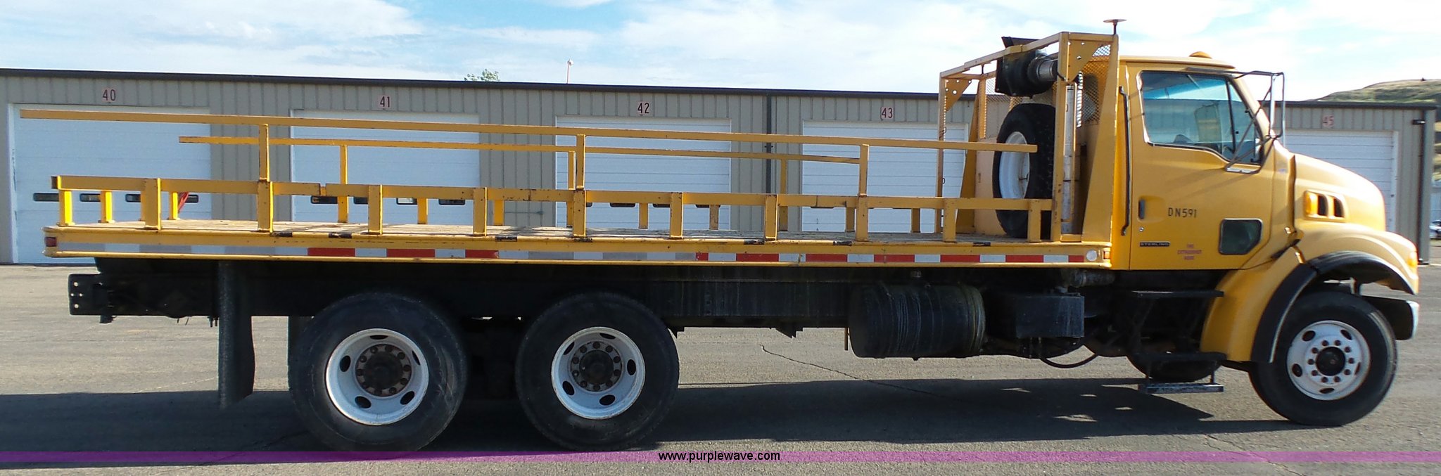 Purple Wave is selling a used Flat Bed Truck in South Dakota. This item is a 2000 Sterling L7501 flatbed truck with the following: 159,692 miles on odometer, 10,147 hours on meter, Caterpillar 7.2L L6 diesel engine, Automatic transmission, Tandem axle, Heat, AM/FM, Air suspension seat, Hydraulics, 22'L x 8.5'W flatbed, 2'2"H sides, Wood deck, Toolbox, Single fuel tank, Spring over walking beam suspension, Air brakes, 264" wheelbase, 11R22.5 tires, GVWR 54,600 lbs, Oil leaks, Equip ID DN591, Asset# 335689