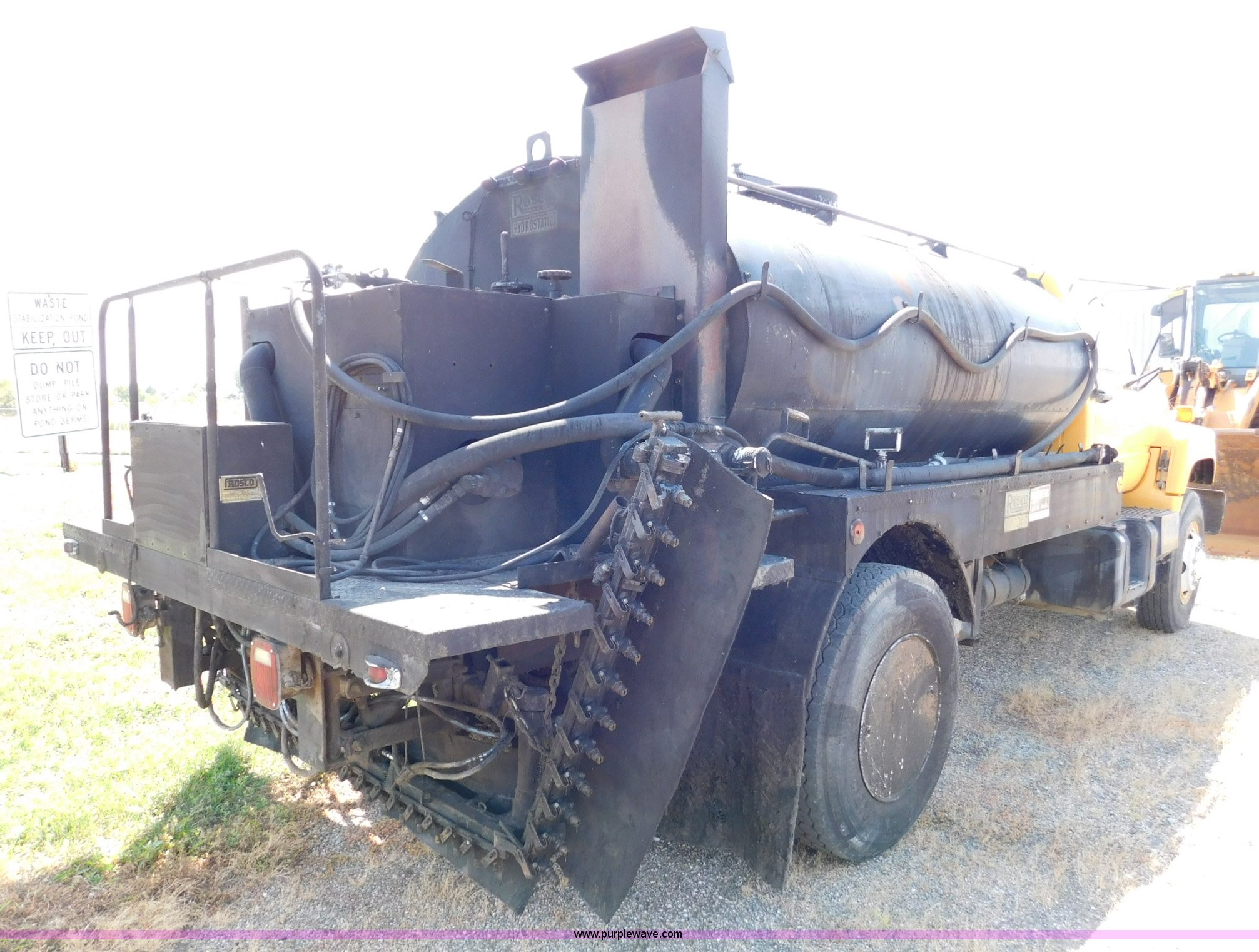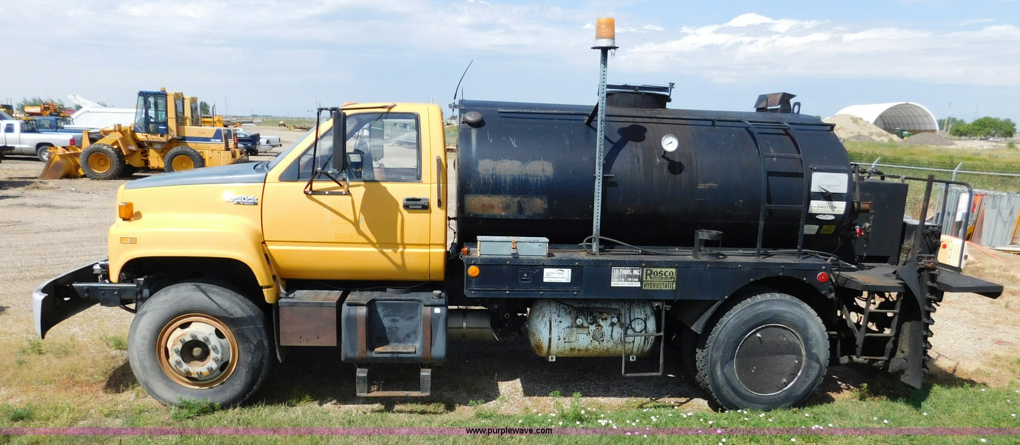 Purple Wave is selling a used Oil Distributor Truck in South Dakota. This item is a 1990 GMC TopKick oil distributor truck with the following: 55,418 miles on odometer, Caterpillar 3116 6.6L six cylinder diesel engine, Automatic transmission, Single axle, Heat, AM/FM, Suspension seat, Front mount PTO, Roscoe RRH oil distributor bed, 14.5'L x 8'W, 1,250 gallon capacity, 49 x 74 x 120 tank, Propane burner, In-cab controls, Spray wand, 12'W folding spray boom, (42) nozzles, Equip Id SF829, Asset # 288310, Spring suspension, Air brakes, 176" wheelbase, 10R20 tires, GVWR approx. 33,000 lbs, Equip Id DB187, Asset# 288311