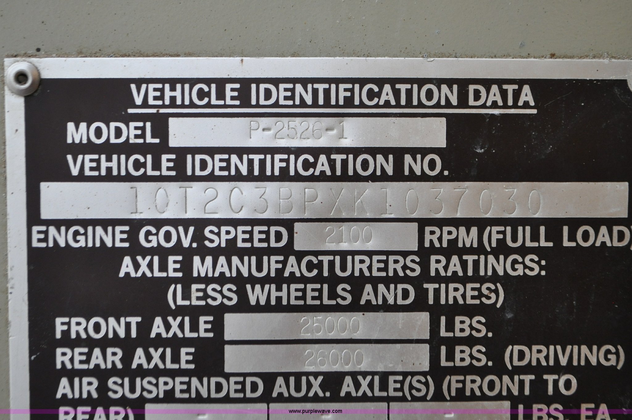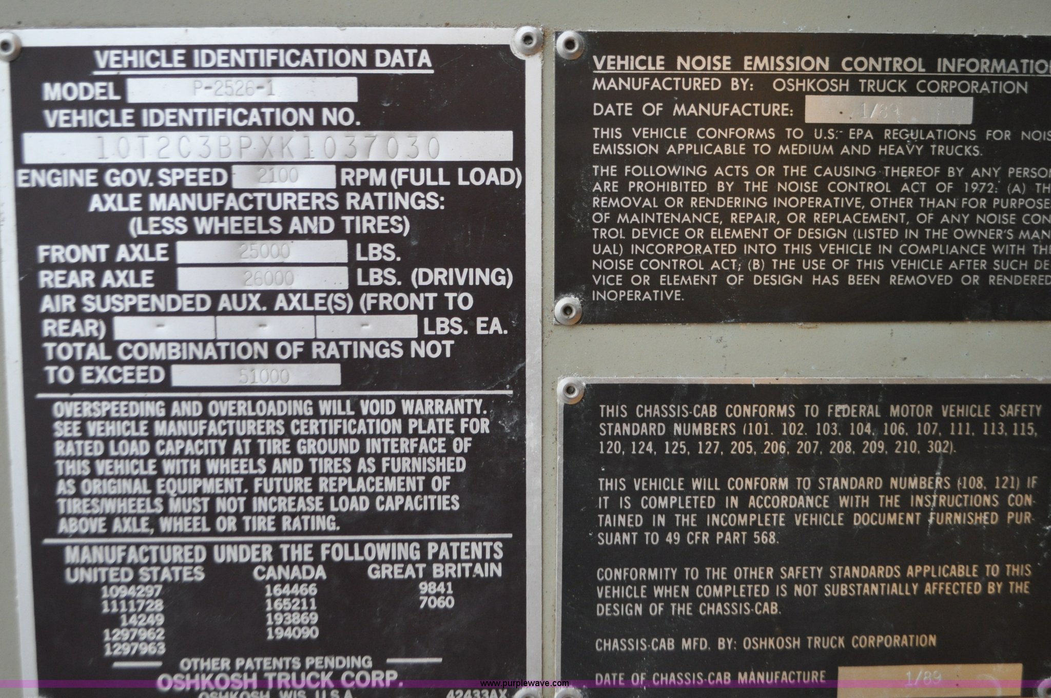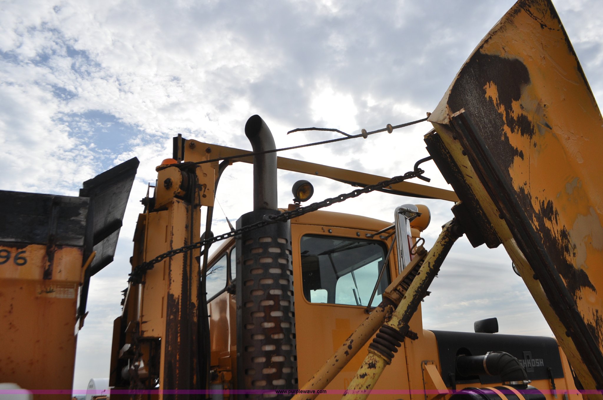 1989 Oshkosh P25261 plow/spreader truck. 104,965 miles on odometer, 4,915 hours on meter, Caterpillar 3306B 10.5L L6 turbo diesel engine, Eaton Fuller 13 speed manual transmission, Four wheel drive, Single axle, Air suspension seat, Front and rear auxiliary hydraulics, Front mount quick attach, Monroe spreader 9'W, Equip ID RM196, Schmidt-Wausau reversible plow 12'W, Asset# 330917, Equip ID RD146, Schmidt-Wausau snow wing 11'W, Asset# 280366, Equip ID RR145, Schimidt-Wausau snow v-plow Asset# 280365, Equip ID RE006, Dual fuel tanks, 445/65R22.5 tires, Equip ID DH041, Asset# 280367. South Dakota title. 10T2C3BPXK1037030. South Dakota Property Management. Rapid City, SD 57703