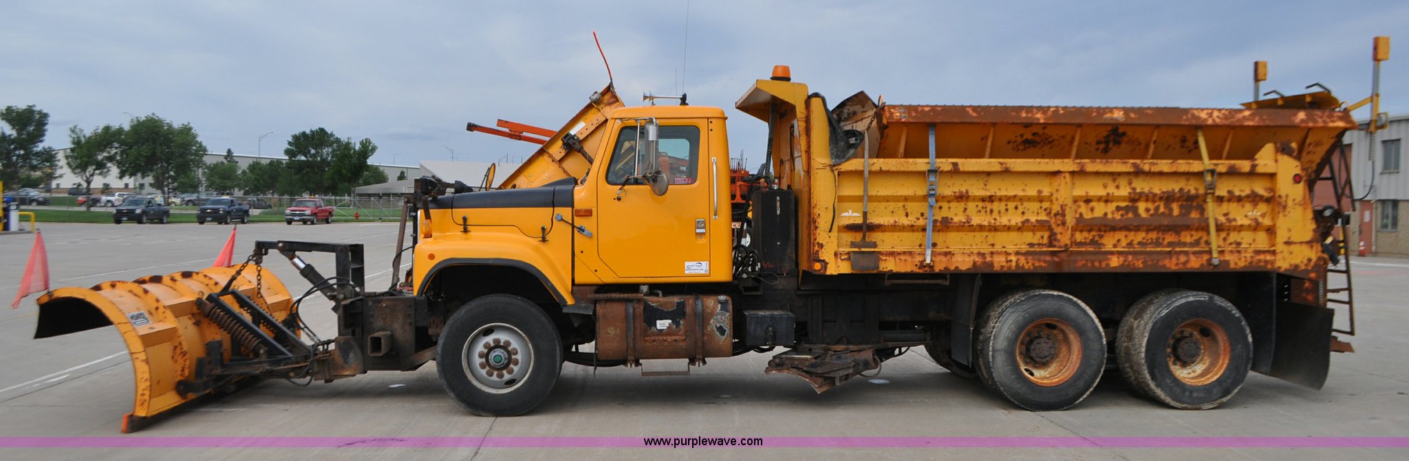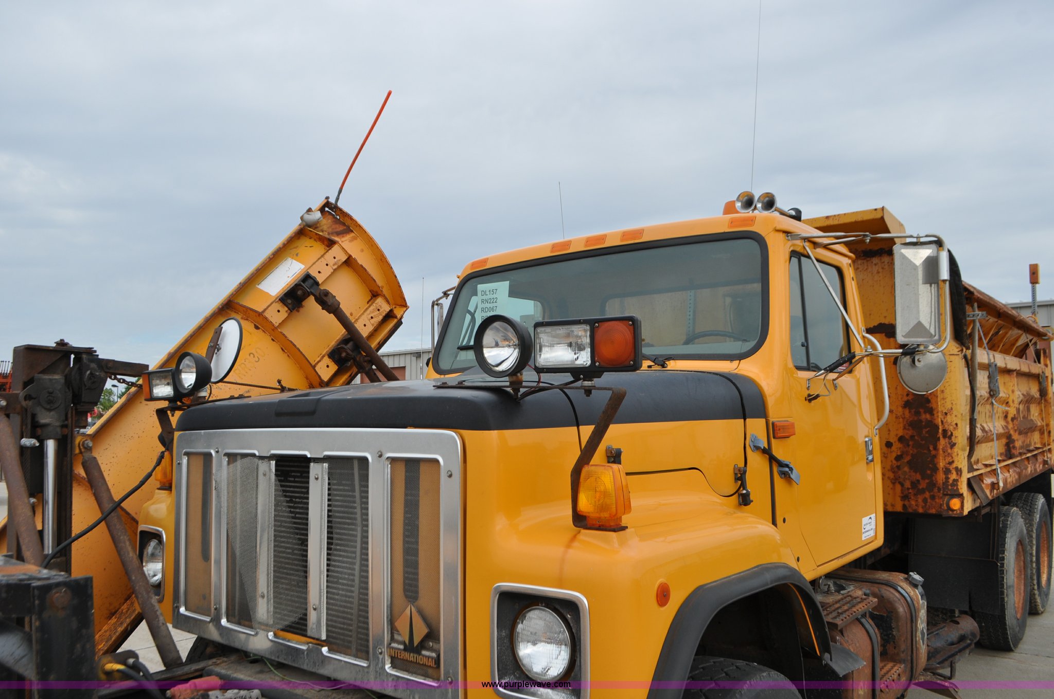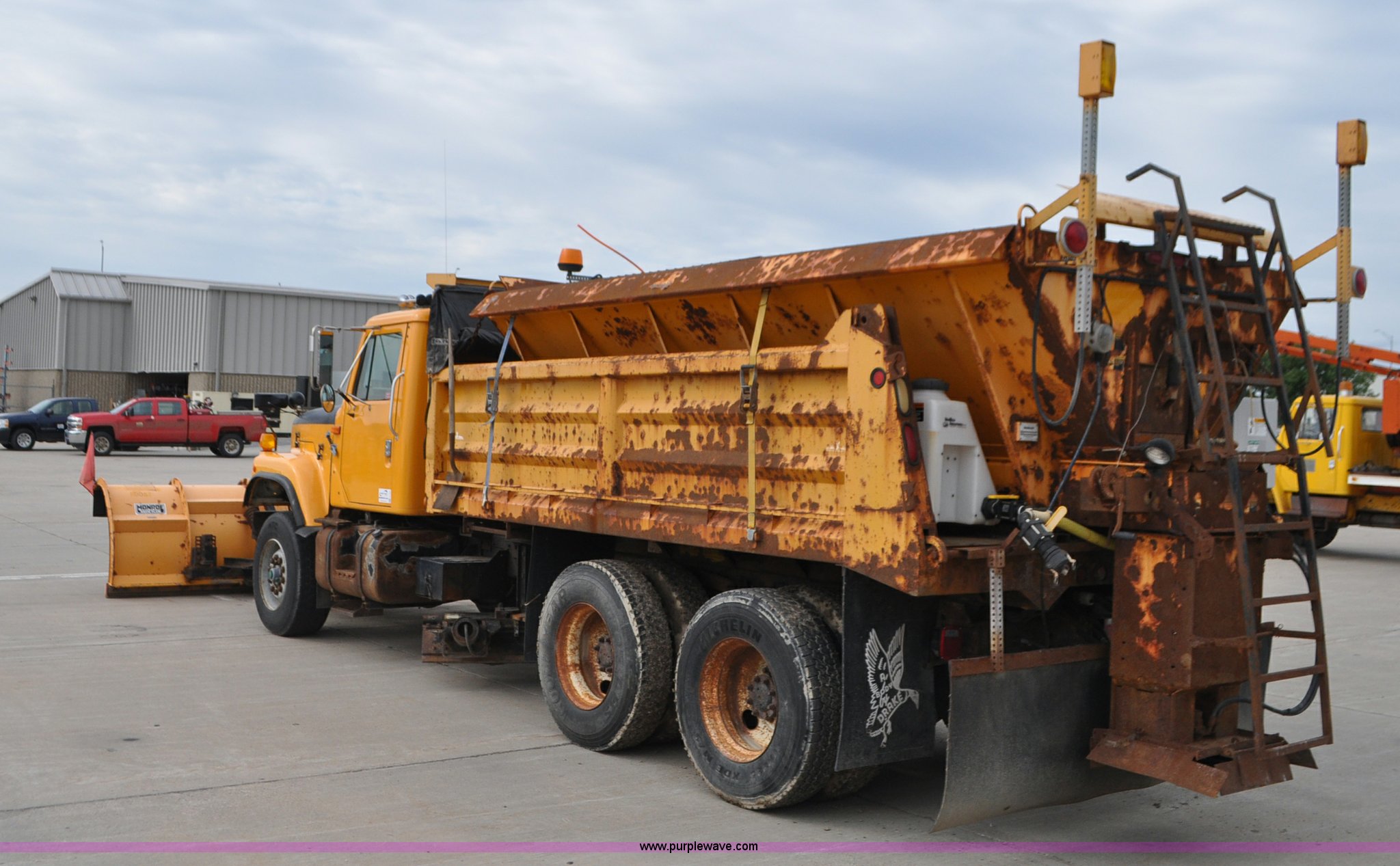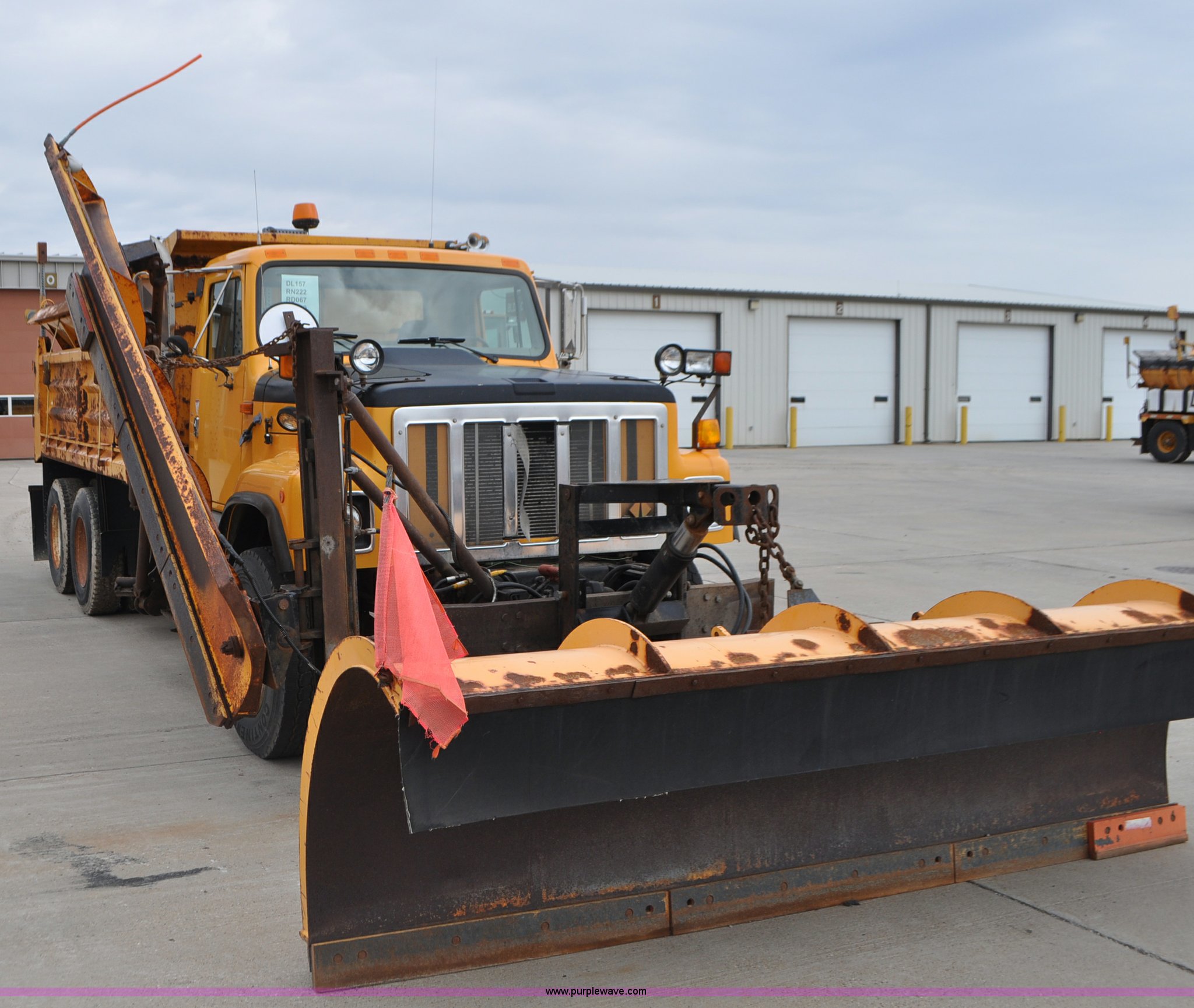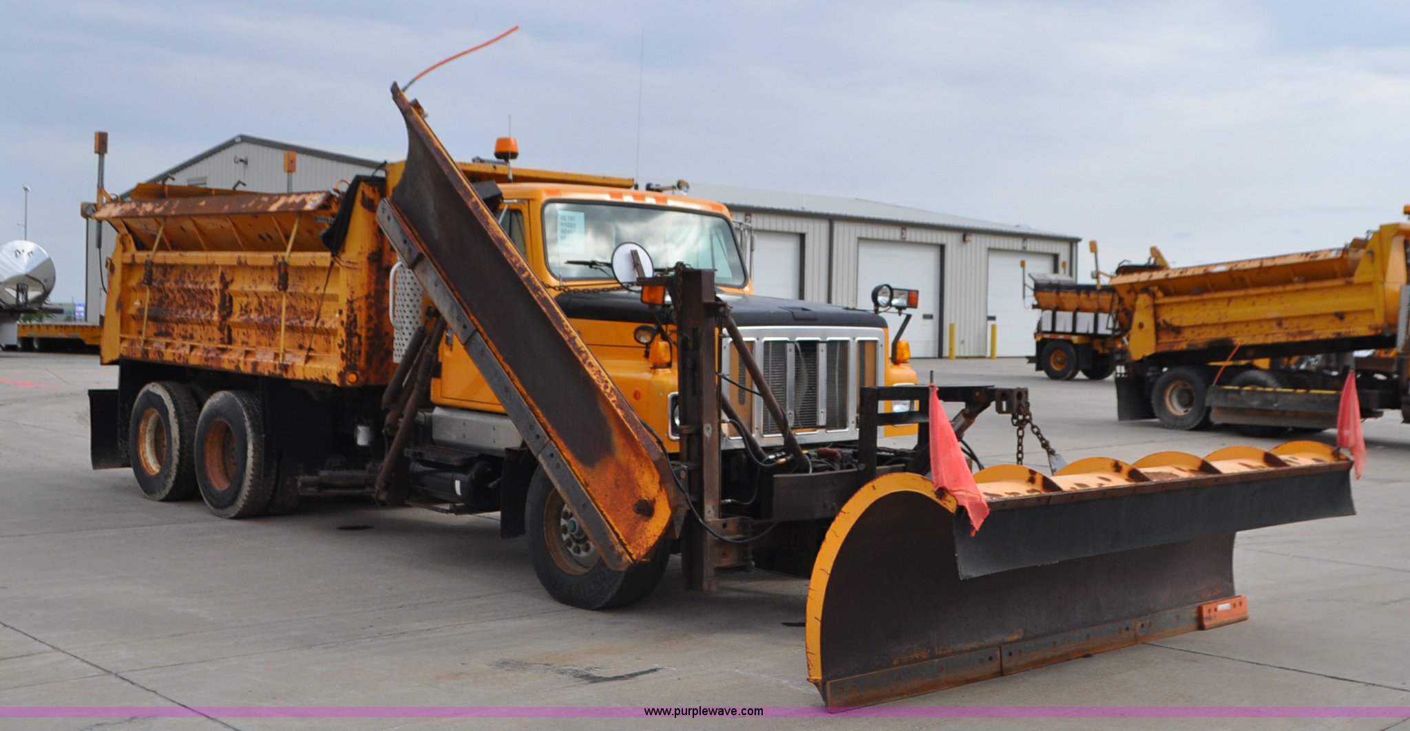 Purple Wave is selling a used Construction Dump Truck in South Dakota. This item is a 1998 International 2554 dump truck with the following: 97,275 miles on odometer, 5,102 hours on meter, International DT530 8.7L L6 turbo diesel engine, Eaton Fuller 10 speed manual transmission, Tandem axle, Inter-axle differential lock, Tilt, Telescoping steering wheel, AM/FM, Air suspension seat, Front mount PTO, 15'L 96"W steel dump bed, 35" side height, Single ram hoist, Air operated end gate, Monroe MP48R12-ISCT plow, 12'W, Equip ID RD067, Henderson WSHX14X50 spreader, 14'L, Equip ID RN222, Monroe snow wing, 10'W, Equip ID RR330, Tennco underbody scraper, 8'W, Equip ID RA069, Single fuel tank, Pintle hitch, Spring over walking beam suspension, Air brakes, 210" wheelbase, 385/65R22.5 front tires, 11R22.5 rear tires, GVWR 54,500 lbs, FAWR 14,500 lbs, IAWR 20,000 lbs, RAWR 20,000 lbs, Equip ID DL157, Asset# 0325987