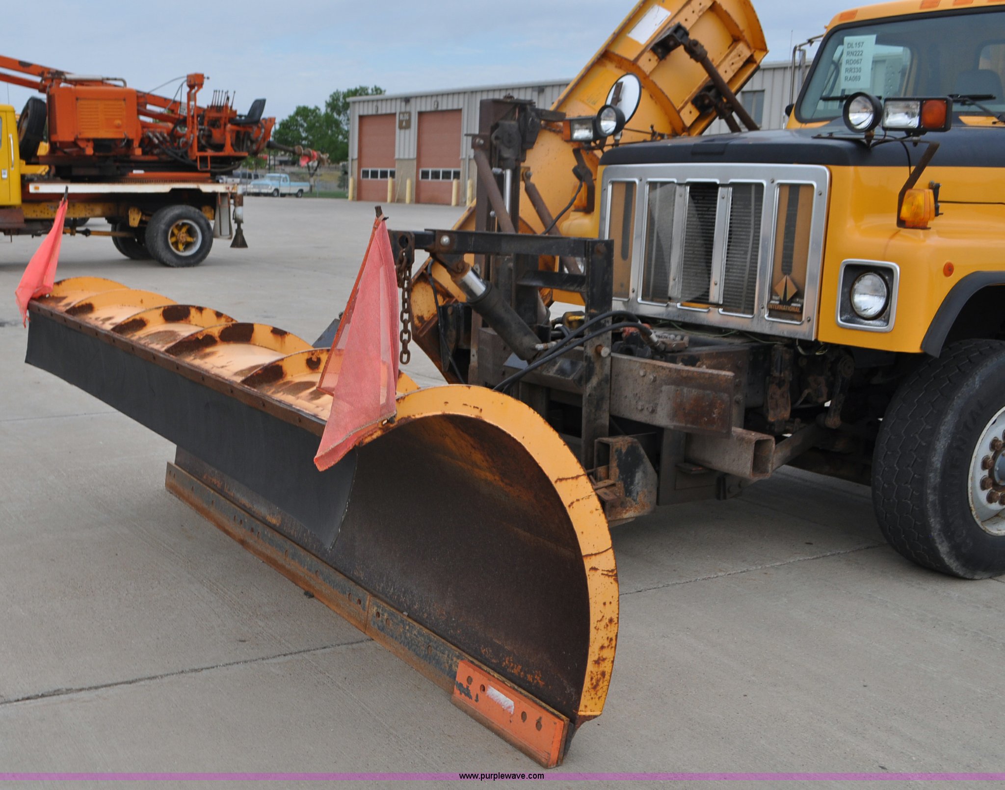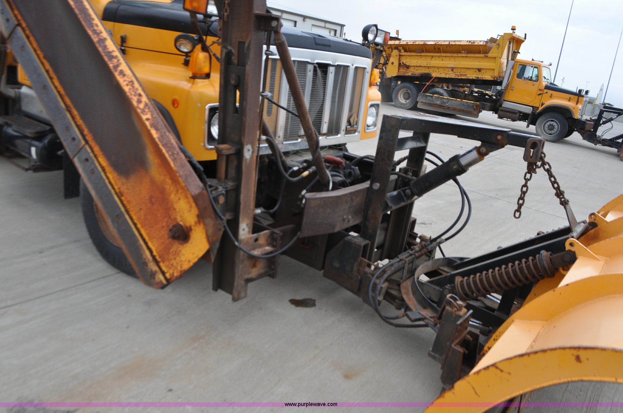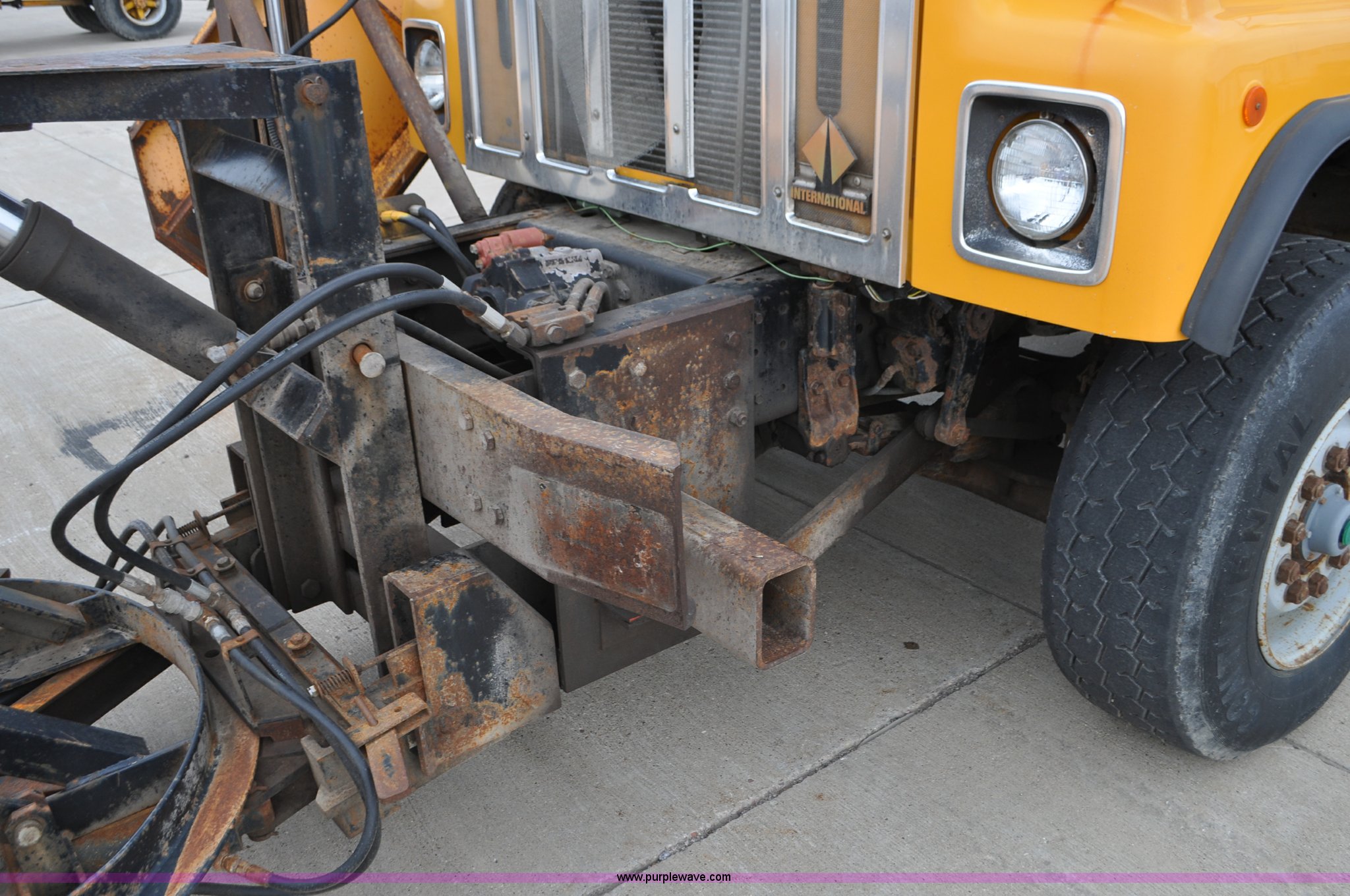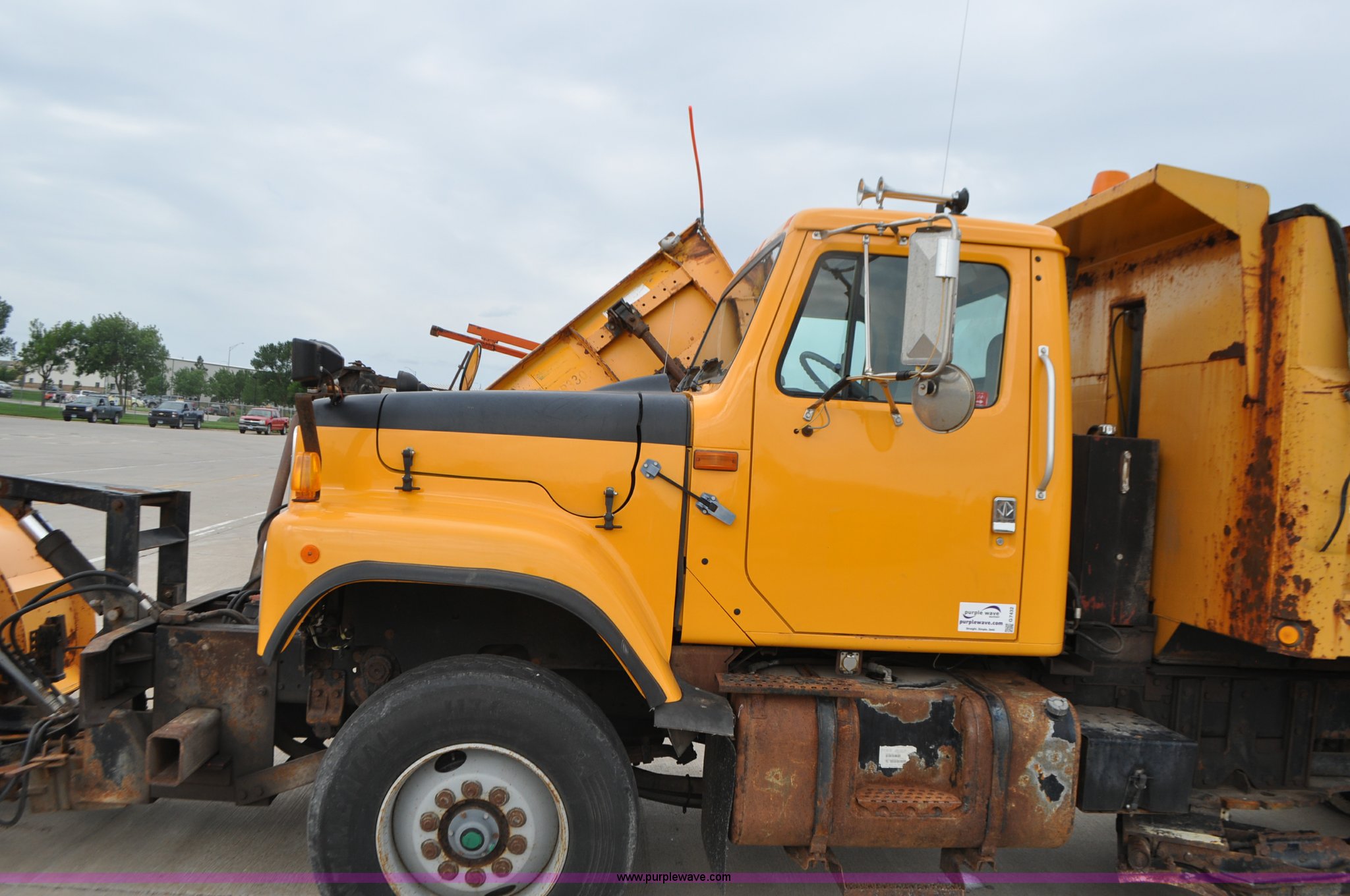 Purple Wave is selling a used Construction Dump Truck in South Dakota. This item is a 1998 International 2554 dump truck with the following: 97,275 miles on odometer, 5,102 hours on meter, International DT530 8.7L L6 turbo diesel engine, Eaton Fuller 10 speed manual transmission, Tandem axle, Inter-axle differential lock, Tilt, Telescoping steering wheel, AM/FM, Air suspension seat, Front mount PTO, 15'L 96"W steel dump bed, 35" side height, Single ram hoist, Air operated end gate, Monroe MP48R12-ISCT plow, 12'W, Equip ID RD067, Henderson WSHX14X50 spreader, 14'L, Equip ID RN222, Monroe snow wing, 10'W, Equip ID RR330, Tennco underbody scraper, 8'W, Equip ID RA069, Single fuel tank, Pintle hitch, Spring over walking beam suspension, Air brakes, 210" wheelbase, 385/65R22.5 front tires, 11R22.5 rear tires, GVWR 54,500 lbs, FAWR 14,500 lbs, IAWR 20,000 lbs, RAWR 20,000 lbs, Equip ID DL157, Asset# 0325987