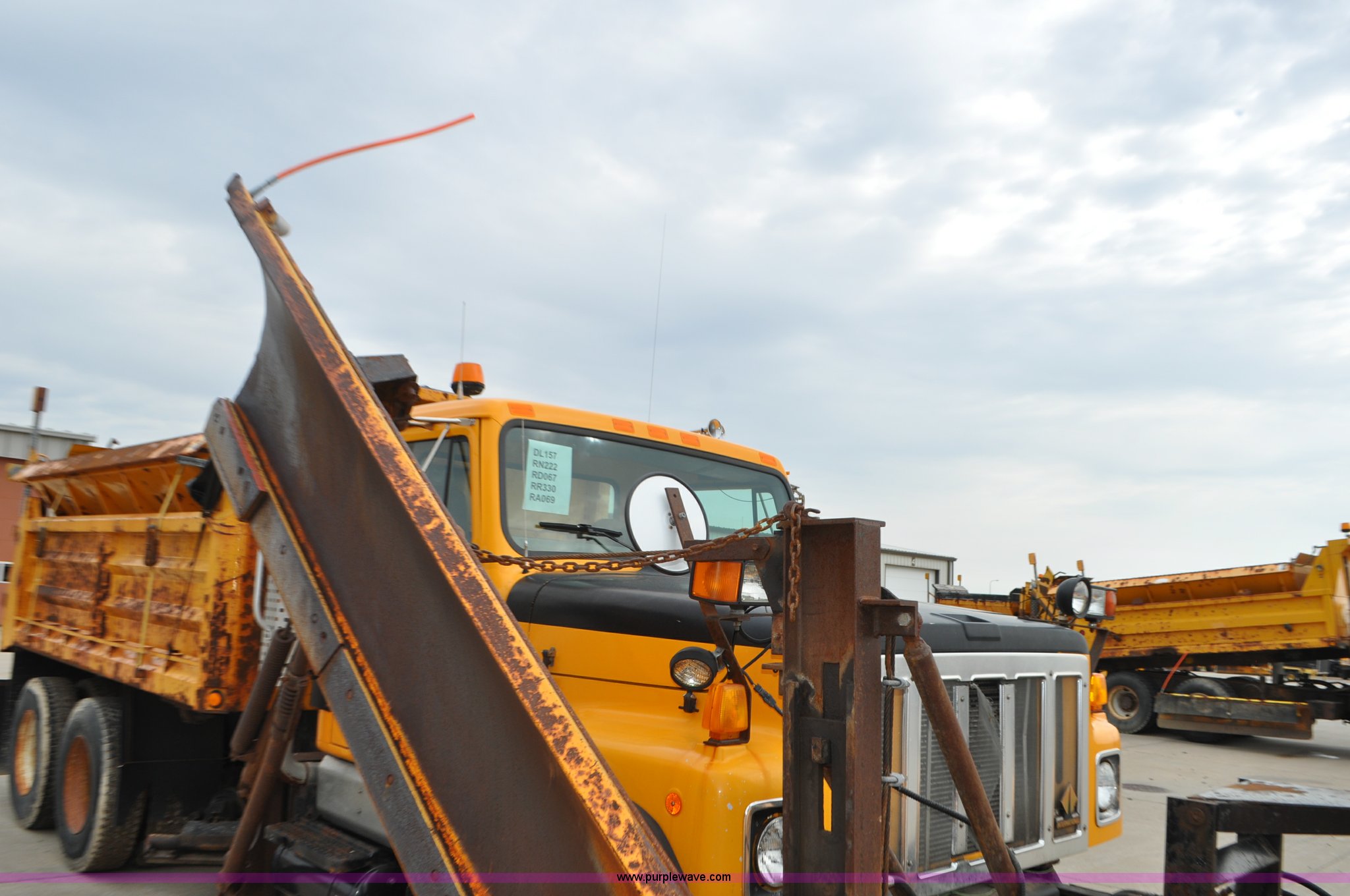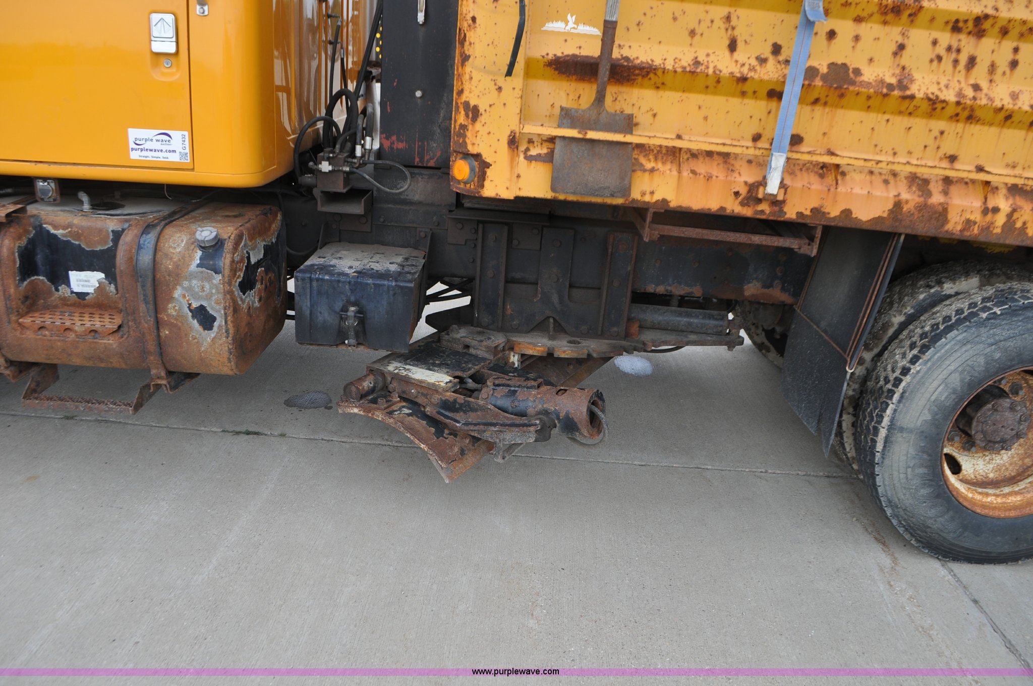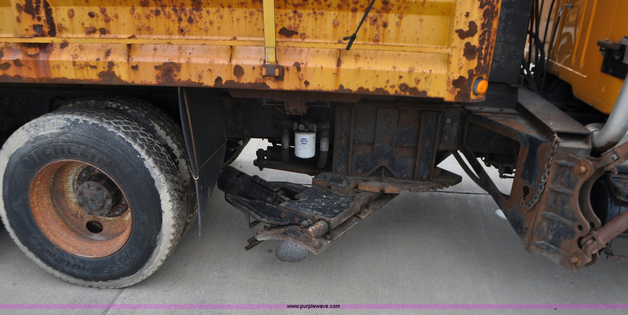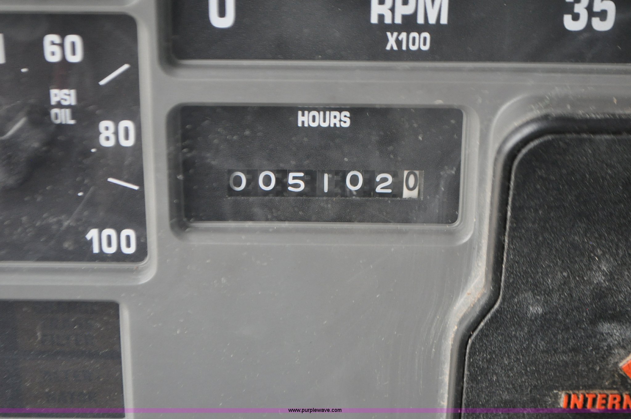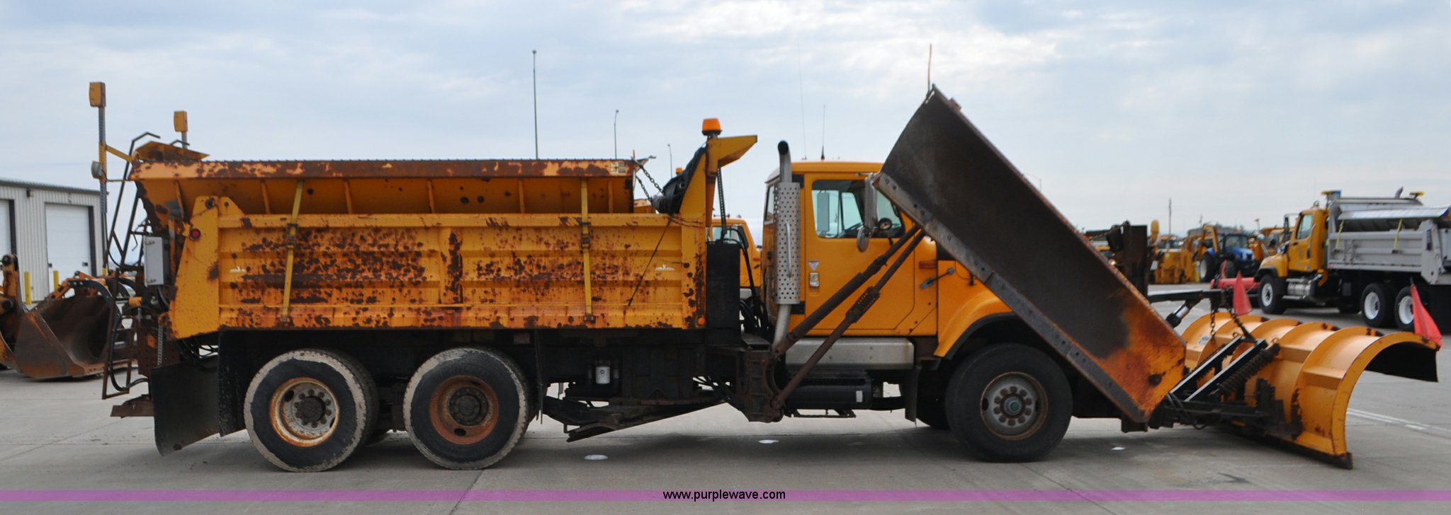 Purple Wave is selling a used Construction Dump Truck in South Dakota. This item is a 1998 International 2554 dump truck with the following: 97,275 miles on odometer, 5,102 hours on meter, International DT530 8.7L L6 turbo diesel engine, Eaton Fuller 10 speed manual transmission, Tandem axle, Inter-axle differential lock, Tilt, Telescoping steering wheel, AM/FM, Air suspension seat, Front mount PTO, 15'L 96"W steel dump bed, 35" side height, Single ram hoist, Air operated end gate, Monroe MP48R12-ISCT plow, 12'W, Equip ID RD067, Henderson WSHX14X50 spreader, 14'L, Equip ID RN222, Monroe snow wing, 10'W, Equip ID RR330, Tennco underbody scraper, 8'W, Equip ID RA069, Single fuel tank, Pintle hitch, Spring over walking beam suspension, Air brakes, 210" wheelbase, 385/65R22.5 front tires, 11R22.5 rear tires, GVWR 54,500 lbs, FAWR 14,500 lbs, IAWR 20,000 lbs, RAWR 20,000 lbs, Equip ID DL157, Asset# 0325987