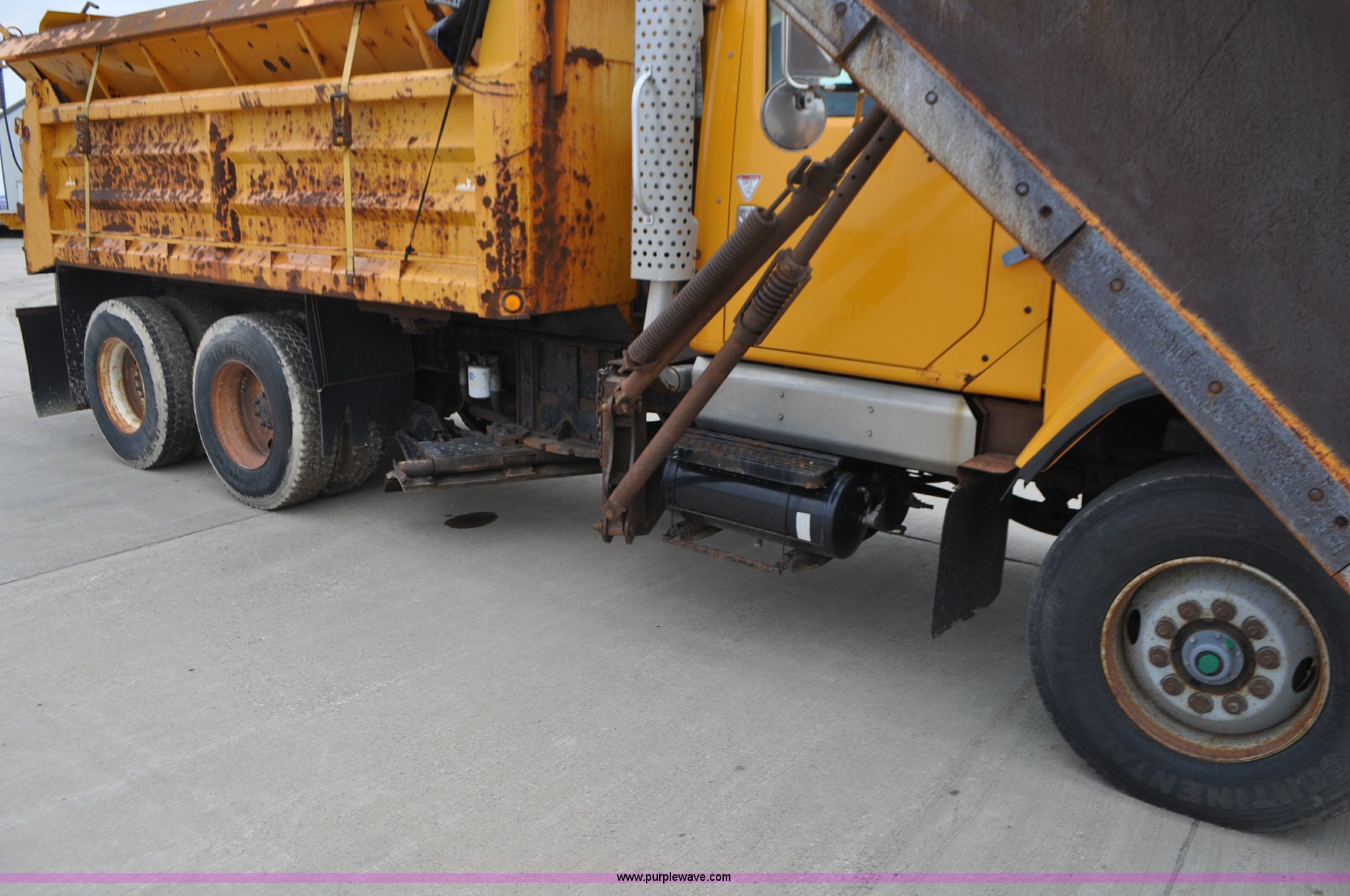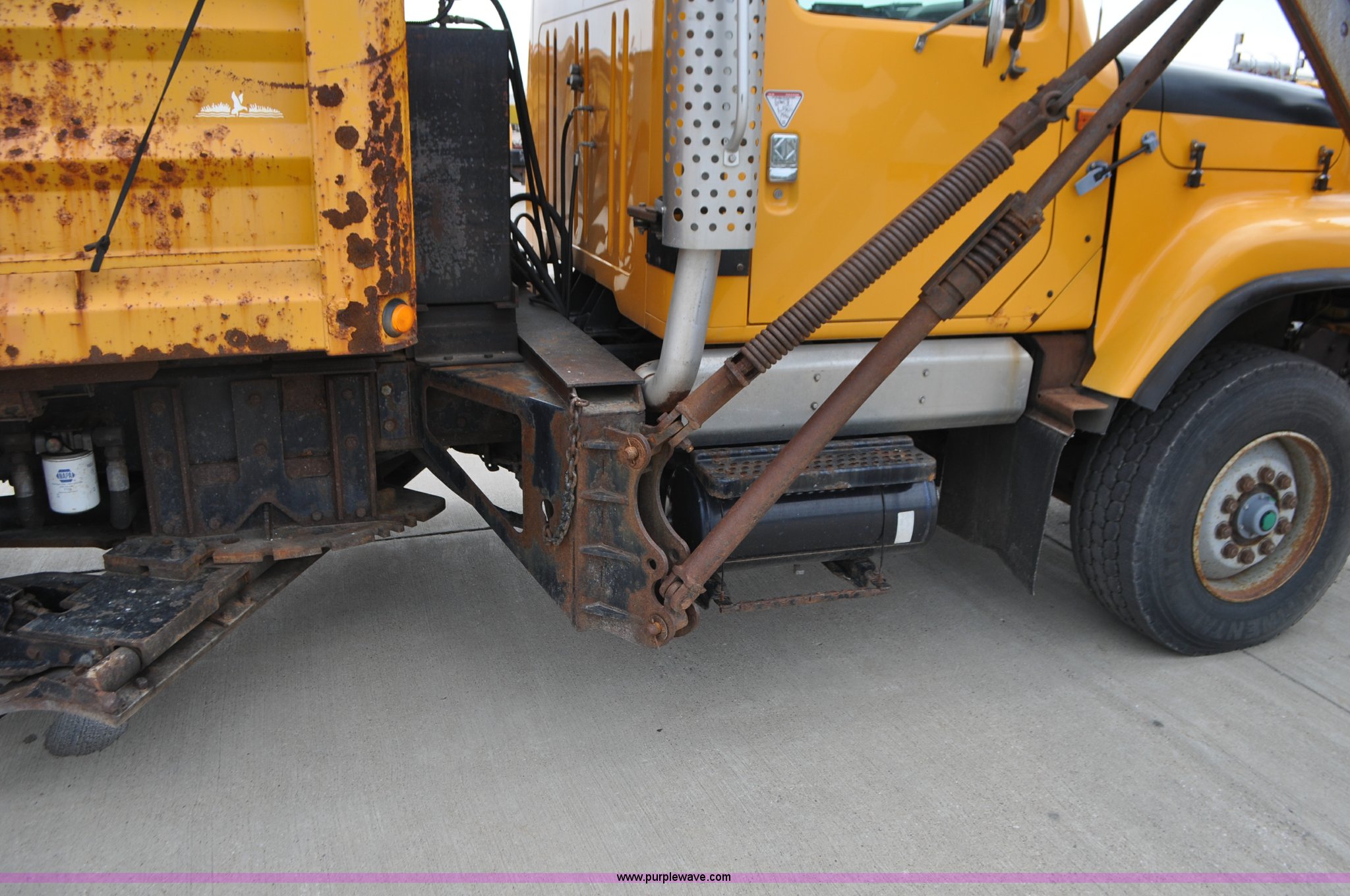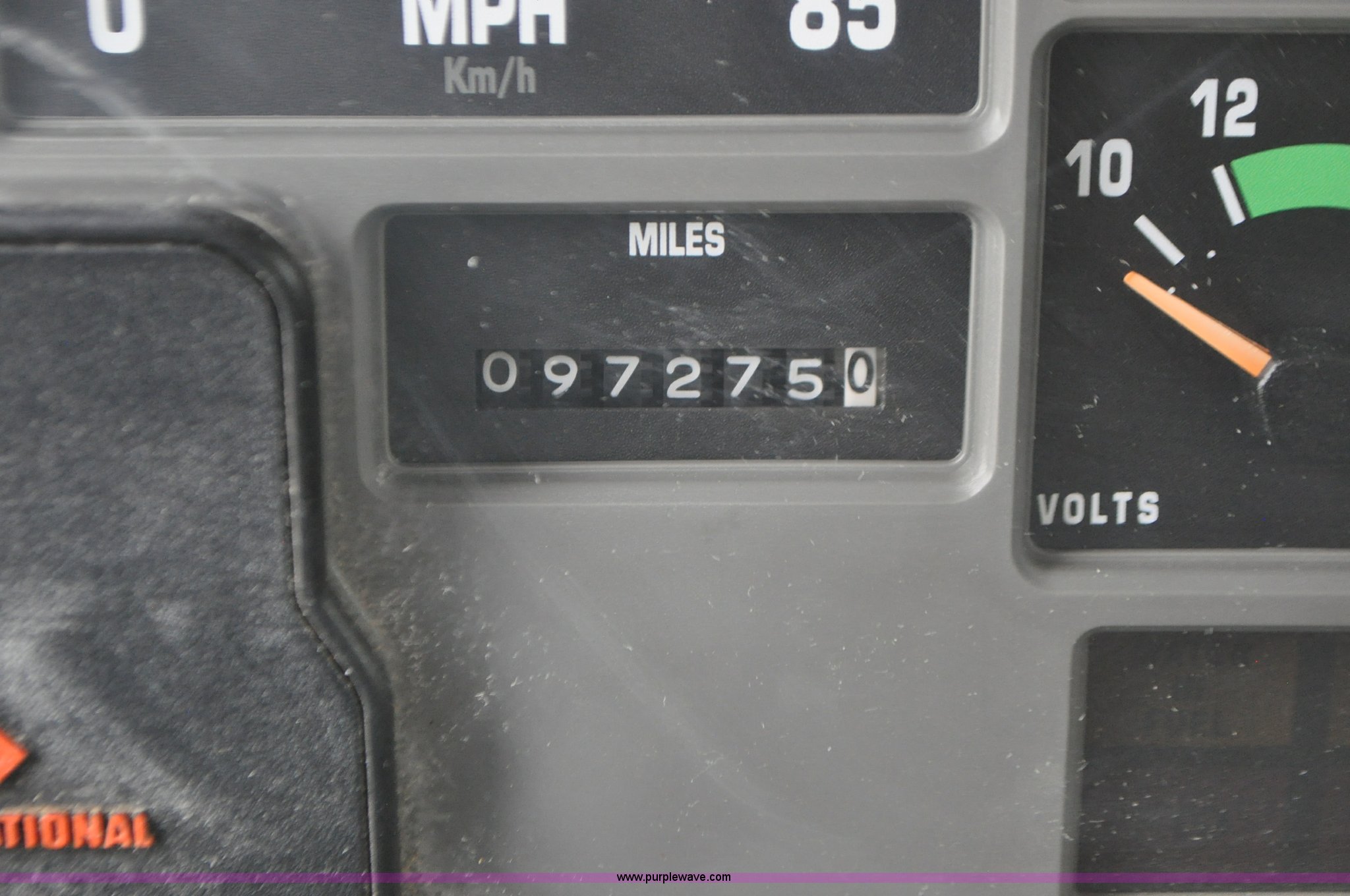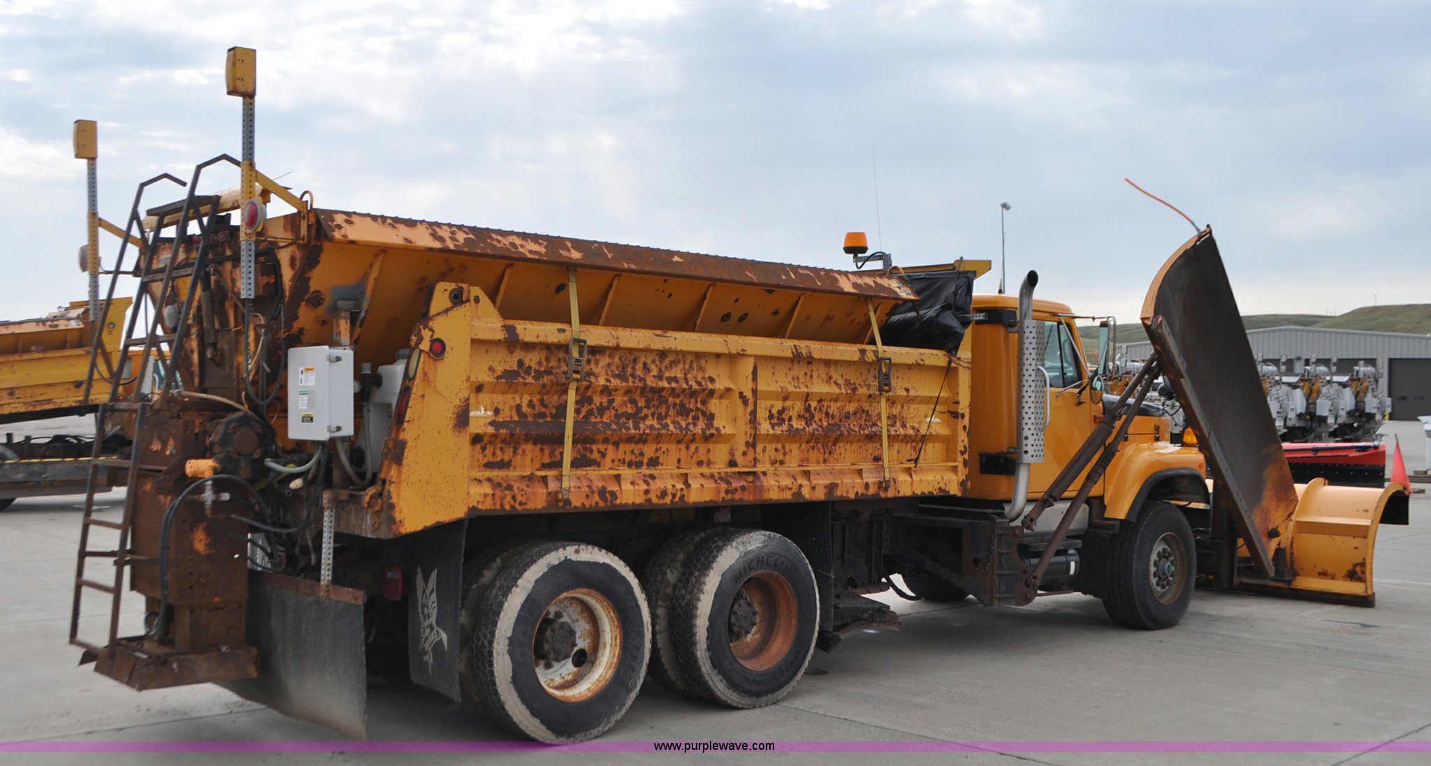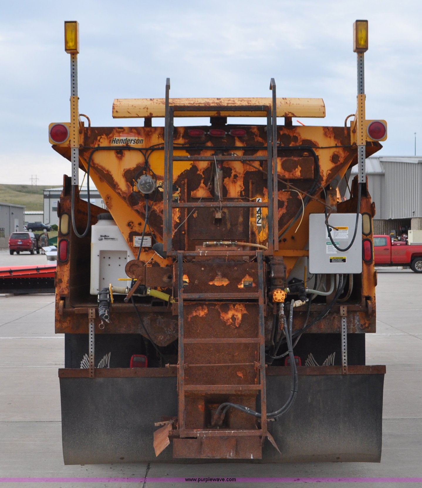 Purple Wave is selling a used Construction Dump Truck in South Dakota. This item is a 1998 International 2554 dump truck with the following: 97,275 miles on odometer, 5,102 hours on meter, International DT530 8.7L L6 turbo diesel engine, Eaton Fuller 10 speed manual transmission, Tandem axle, Inter-axle differential lock, Tilt, Telescoping steering wheel, AM/FM, Air suspension seat, Front mount PTO, 15'L 96"W steel dump bed, 35" side height, Single ram hoist, Air operated end gate, Monroe MP48R12-ISCT plow, 12'W, Equip ID RD067, Henderson WSHX14X50 spreader, 14'L, Equip ID RN222, Monroe snow wing, 10'W, Equip ID RR330, Tennco underbody scraper, 8'W, Equip ID RA069, Single fuel tank, Pintle hitch, Spring over walking beam suspension, Air brakes, 210" wheelbase, 385/65R22.5 front tires, 11R22.5 rear tires, GVWR 54,500 lbs, FAWR 14,500 lbs, IAWR 20,000 lbs, RAWR 20,000 lbs, Equip ID DL157, Asset# 0325987