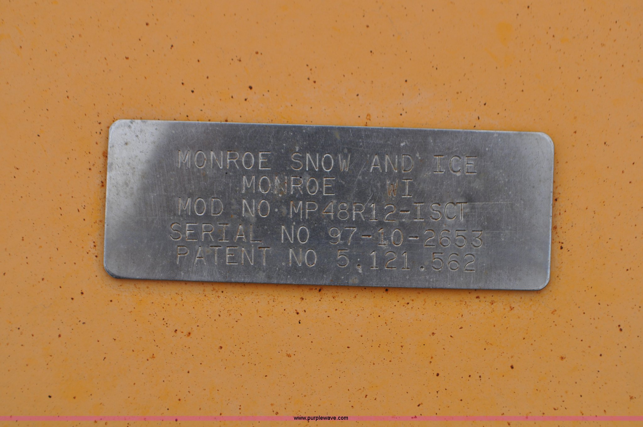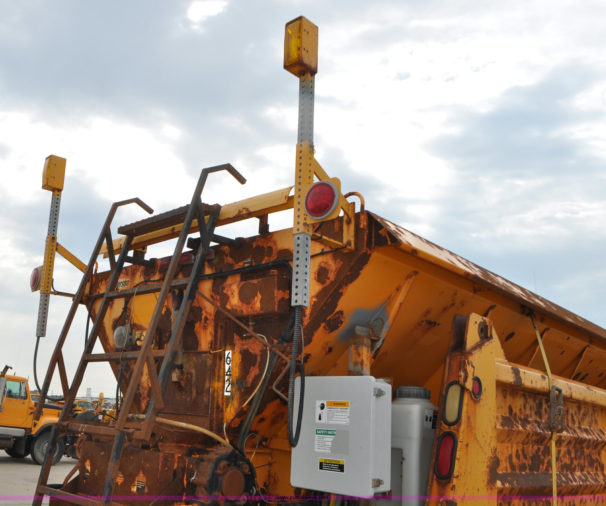 1998 International 2554 dump truck. 97,275 miles on odometer, 5,102 hours on meter, International DT530 8.7L L6 turbo diesel engine, Eaton Fuller 10 speed manual transmission, Tandem axle, Inter-axle differential lock, Tilt, Telescoping steering wheel, AM/FM, Air suspension seat, Front mount PTO, 15'L 96"W steel dump bed 35" side height, Single ram hoist, Air operated end gate, Monroe MP48R12-ISCT plow 12'W, Equip ID RD067, Henderson WSHX14X50 spreader 14'L, Equip ID RN222, Monroe snow wing 10'W, Equip ID RR330, Tennco underbody scraper 8'W, Equip ID RA069, Single fuel tank, Pintle hitch, Spring over walking beam suspension, Air brakes, 210" wheelbase, 385/65R22.5 front tires, 11R22.5 rear tires, GVWR 54,500 lbs, FAWR 14,500 lbs, IAWR 20,000 lbs, RAWR 20,000 lbs, Equip ID DL157, Asset# 0325987. South Dakota title. 1HTGCADR9WH498393. South Dakota Property Management. Rapid City, SD 57703