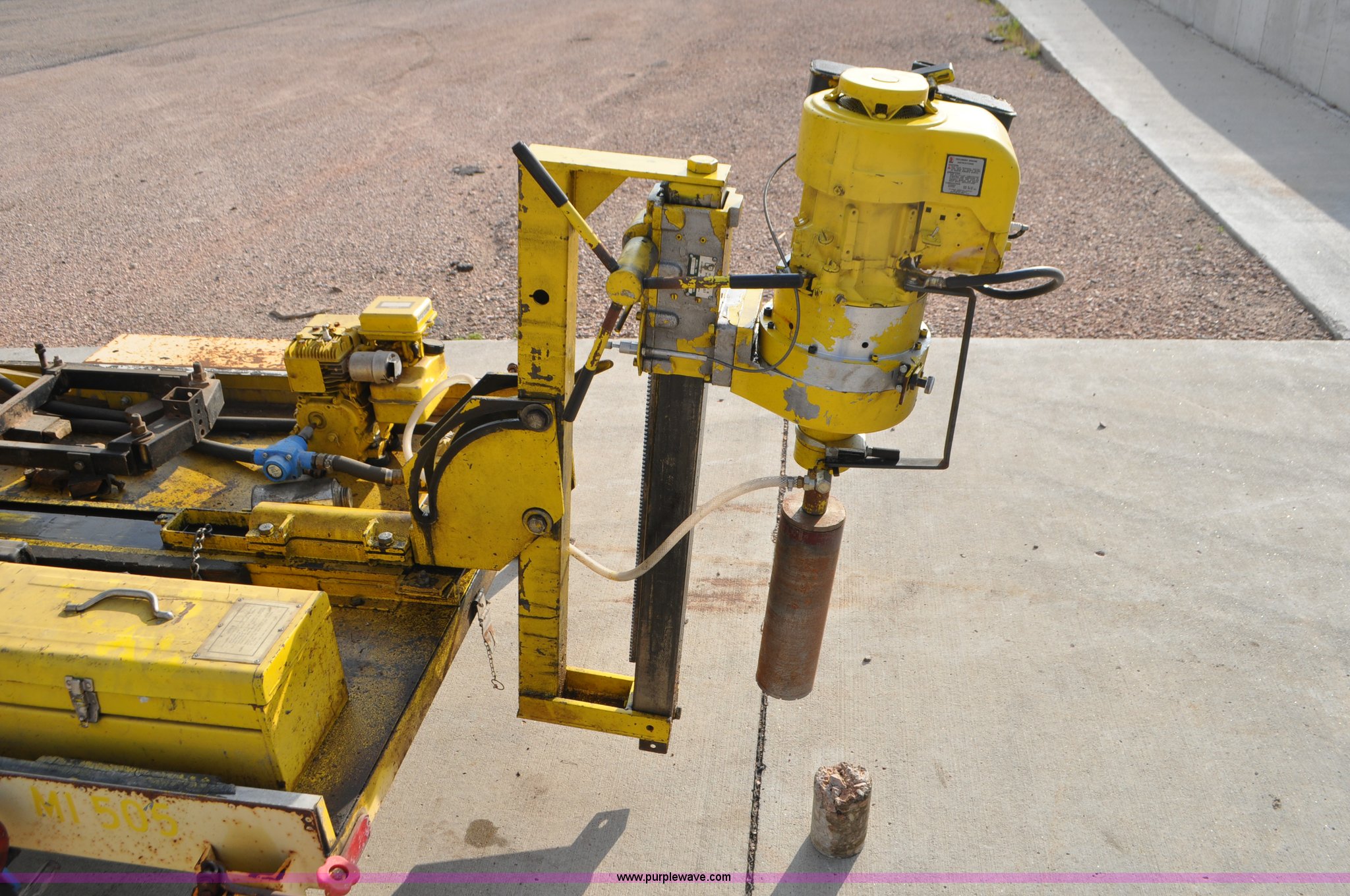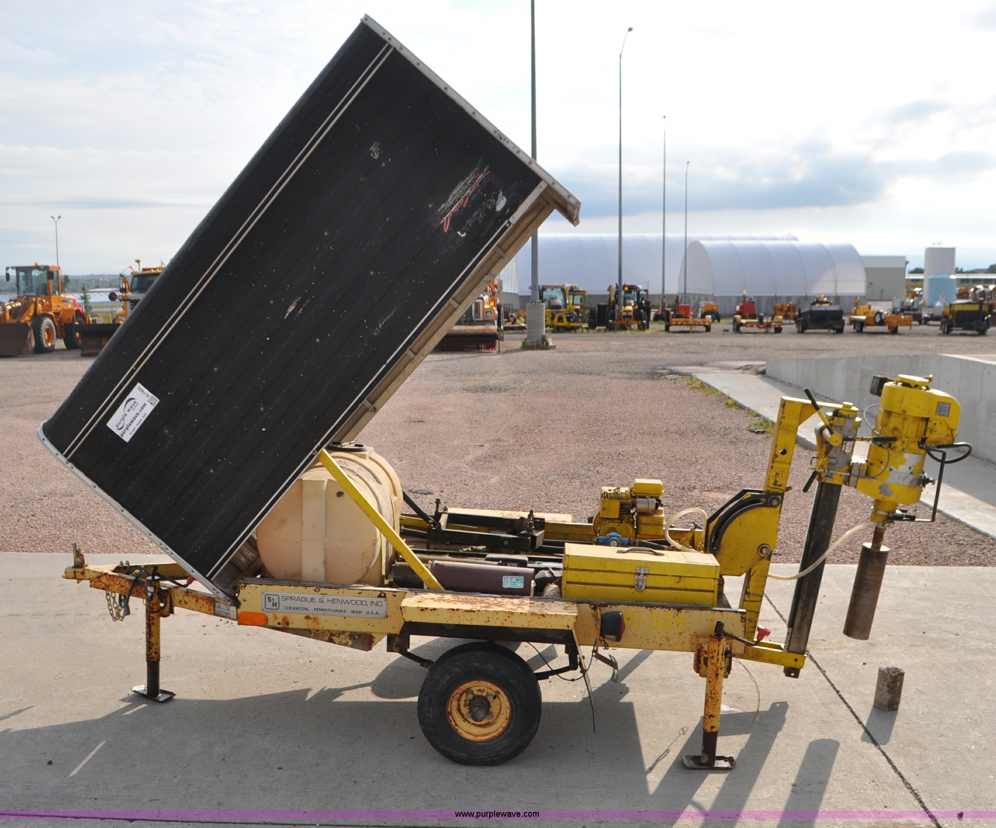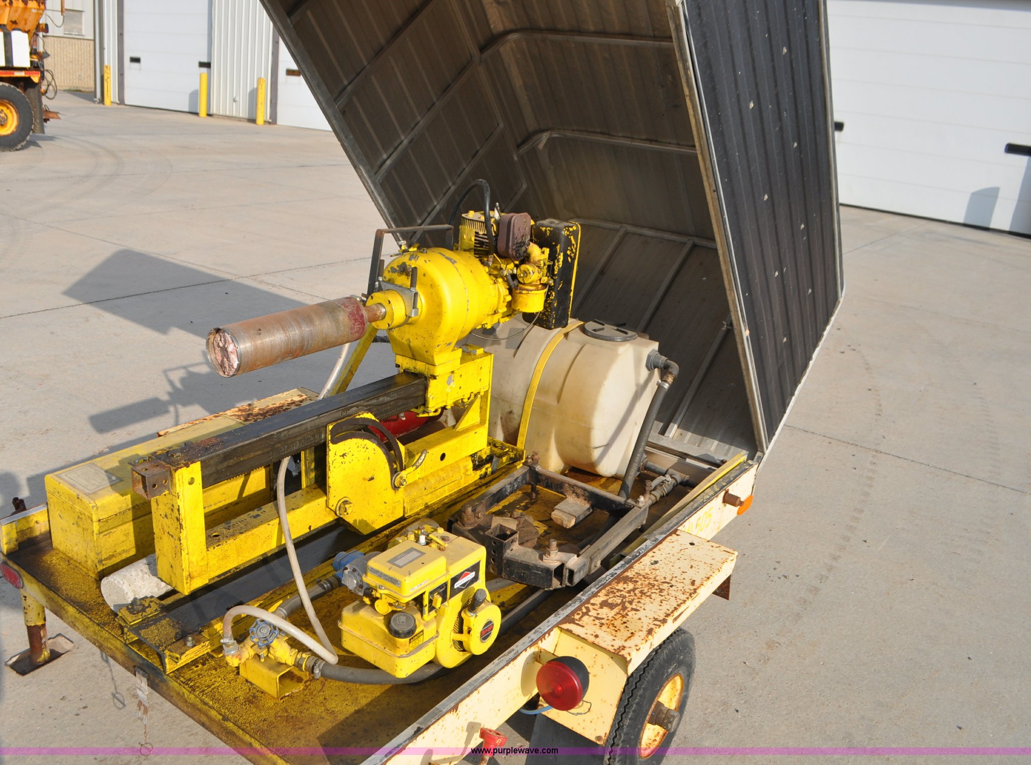 Purple Wave is selling a used Core Drill in South Dakota. This item is a Sprague & Henwood core drill with enclosed trailer with the following: Model MDS780, Tecumseh gas engine for drill, Briggs & Stratton gas engine for cooling and lubrication pump, Lubrication pump is stuck, 6" and 4" bits, 30" travel, 75" x 51" enclosed trailer, 1 7/8" ball, Stabilizer jacks, 5.70-8 tires, Equip ID MI505, Serial 388, Asset# 281387