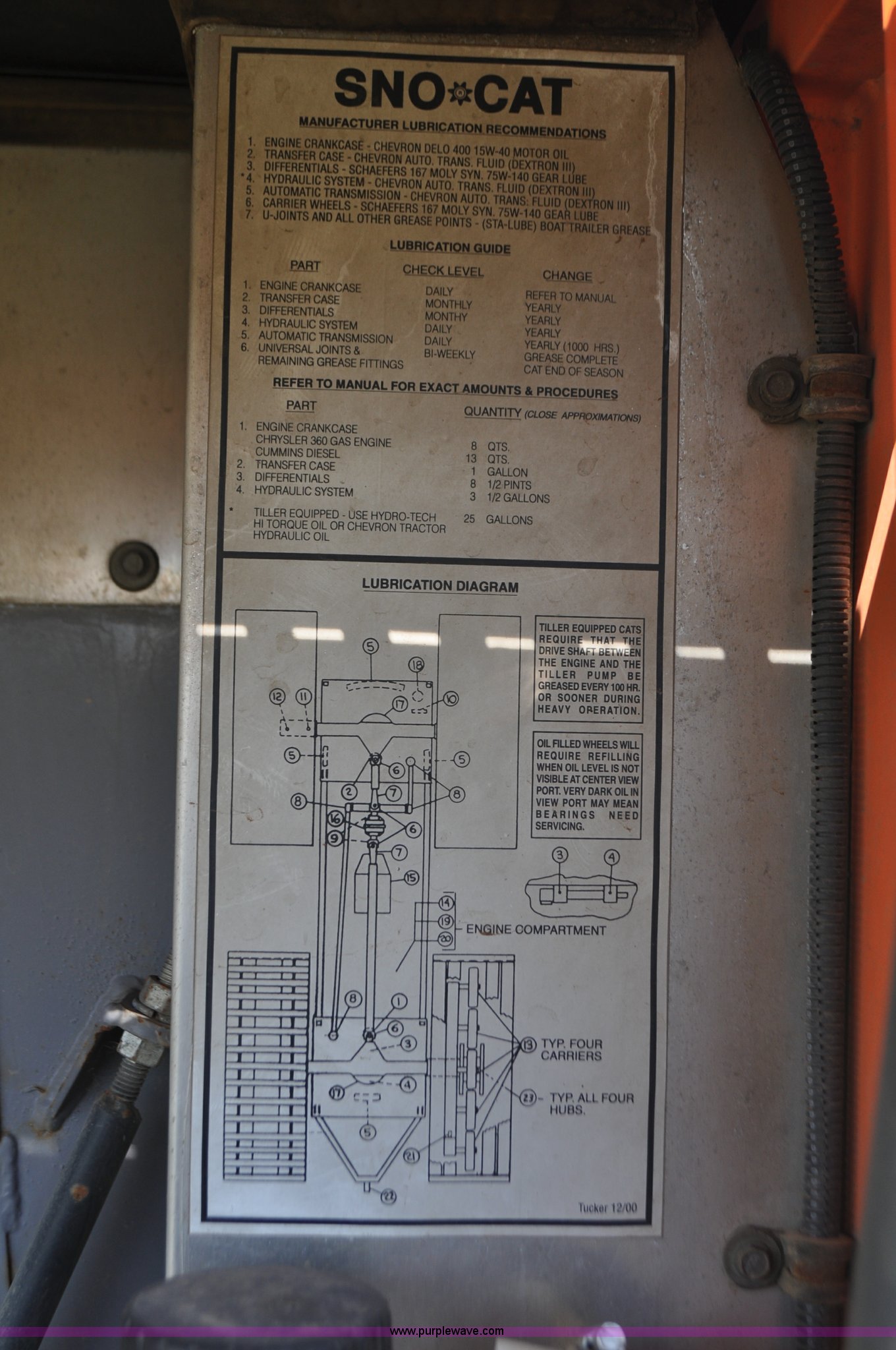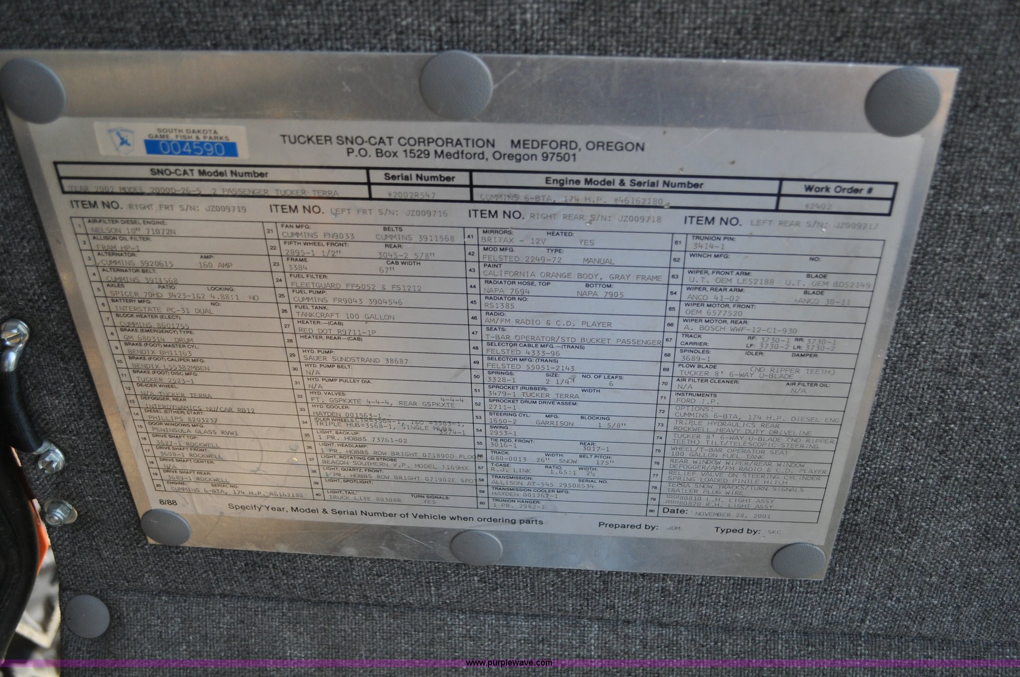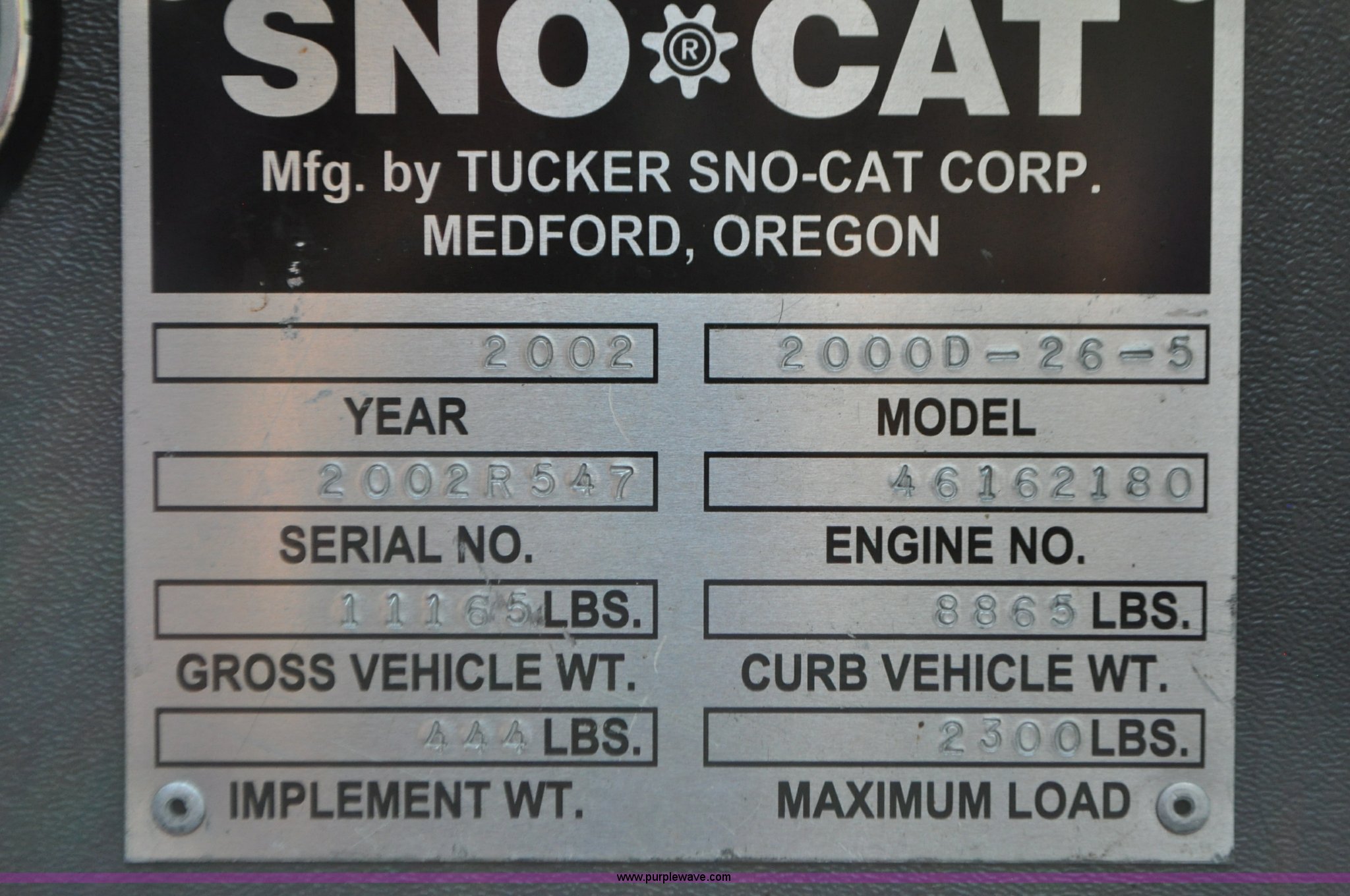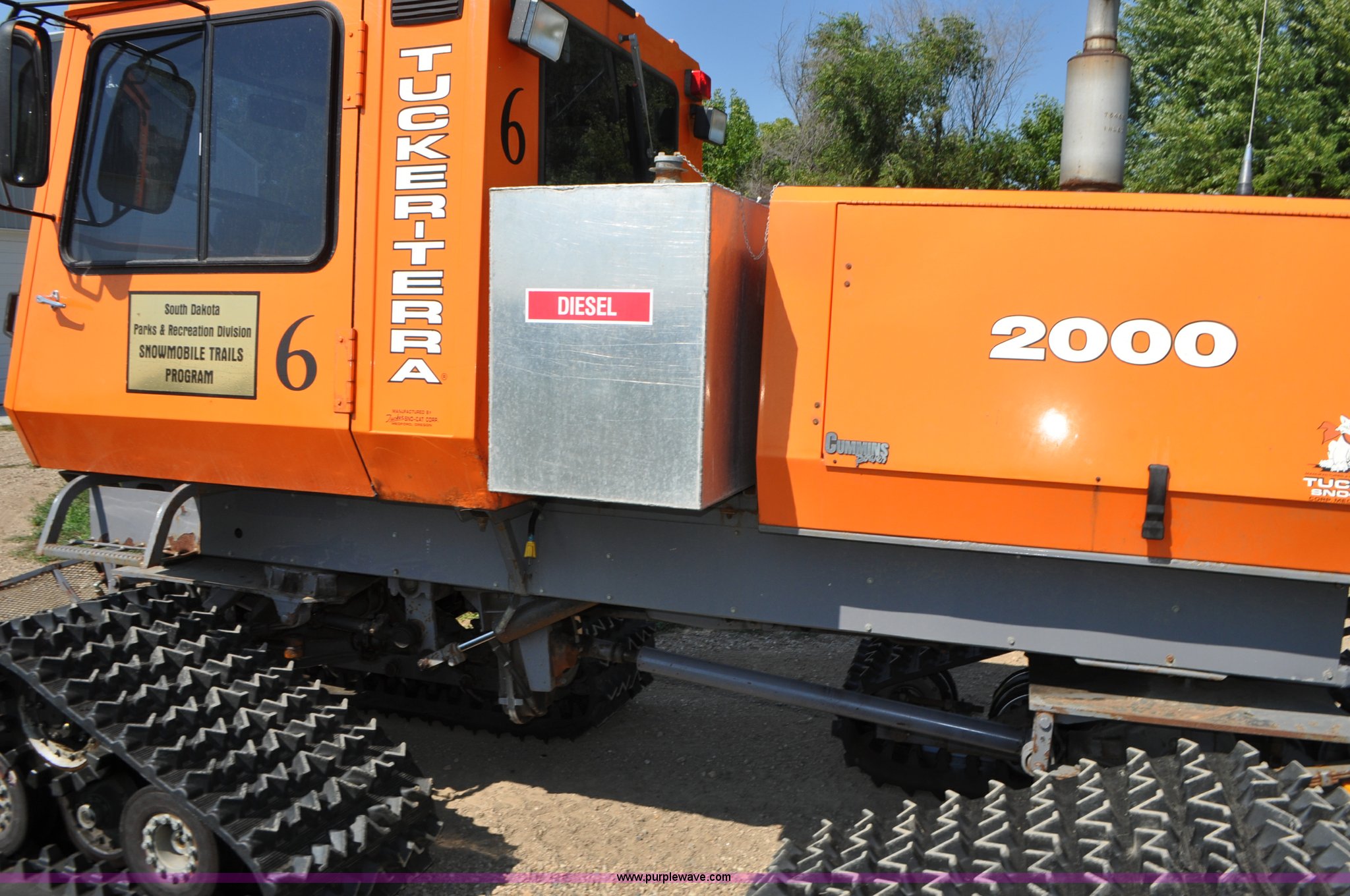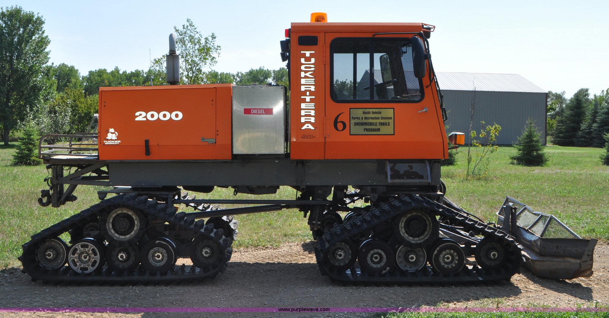 Purple Wave is selling a used Other Industrial or Business in South Dakota. This item is a 2002 Tucker Terra 2000D-26-5 Sno-Cat trail groomer with the following: 4,033 hours on meter, Cummins six cylinder diesel engine, 174 HP, Allison AT-545 automatic transmission, Enclosed cab, Two passenger capacity, Heat, AM/FM/CD, Tucker 103" six way U-blade, (3) rear auxiliary hydraulics, 100 gallon fuel tank, Pintle hitch, Seven pin trailer wiring, 26"W tracks, Slow oil leak from left drive wheel, Bogie wheels showing damage, Equip ID 004590, Serial 2002R547, Asset# 0339003