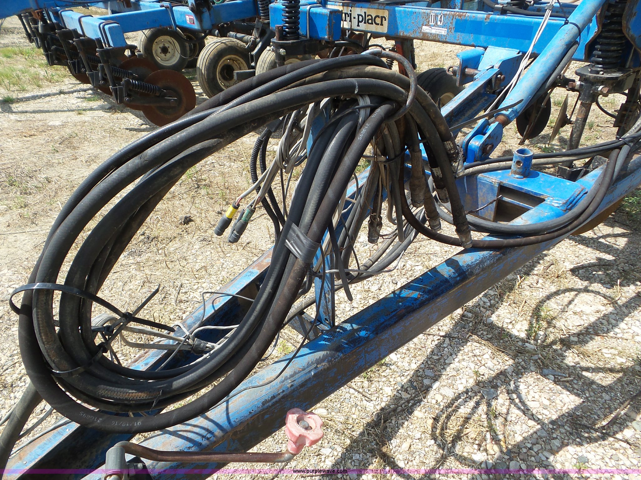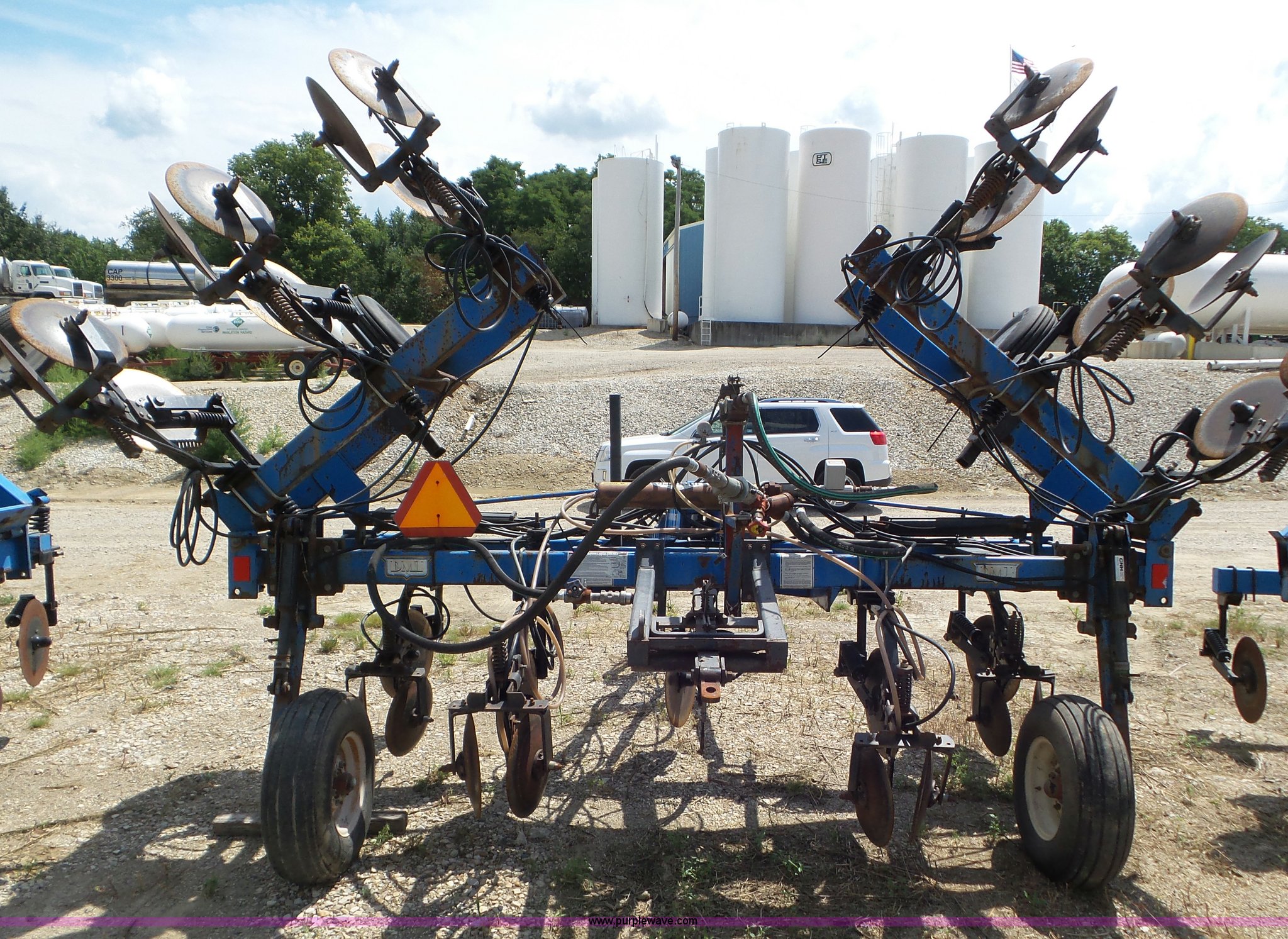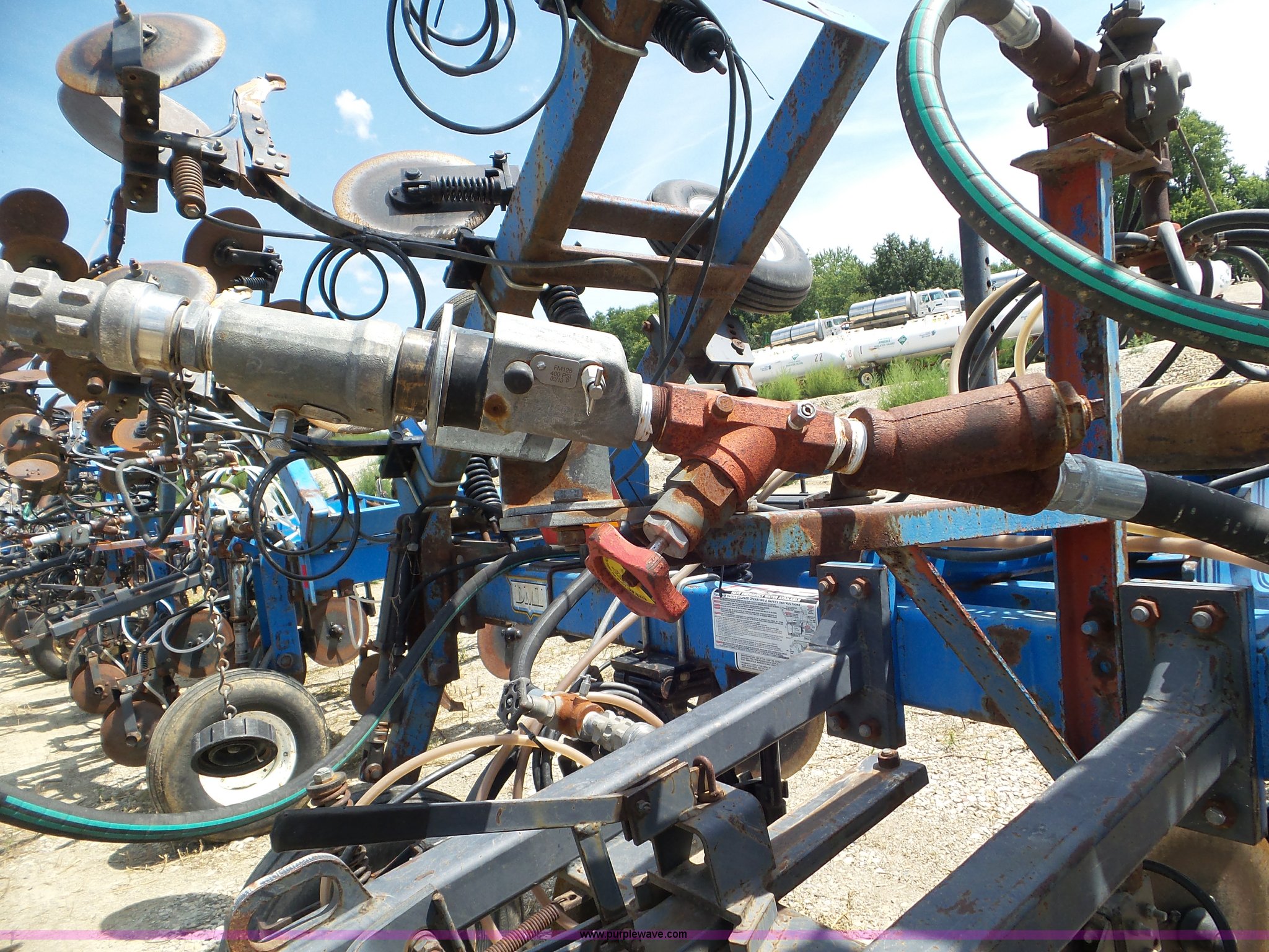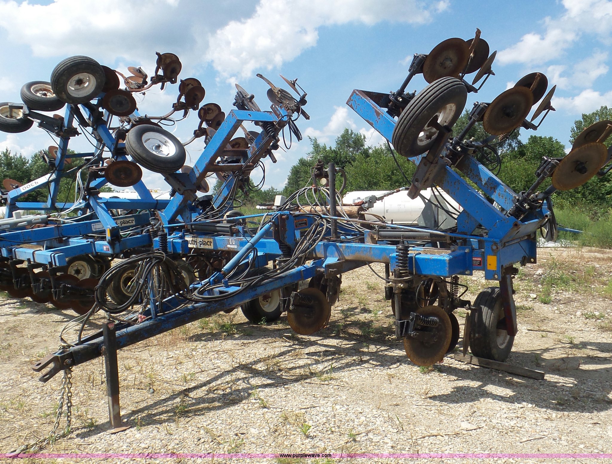 Purple Wave is selling a used Applicator Pull Type in Indiana. This item is a DMI Nutri-Placr 3250 applicator with the following: Approximately 24'W, (11) shanks, Openers, Yetter closing wheels, B9500 Continental Metermatic anhydrous pump with hydraulic shut off, Hydraulic fold and lift, Front and rear pin hitches, 11-15 tires, Serial 823343, Unit# 11-4