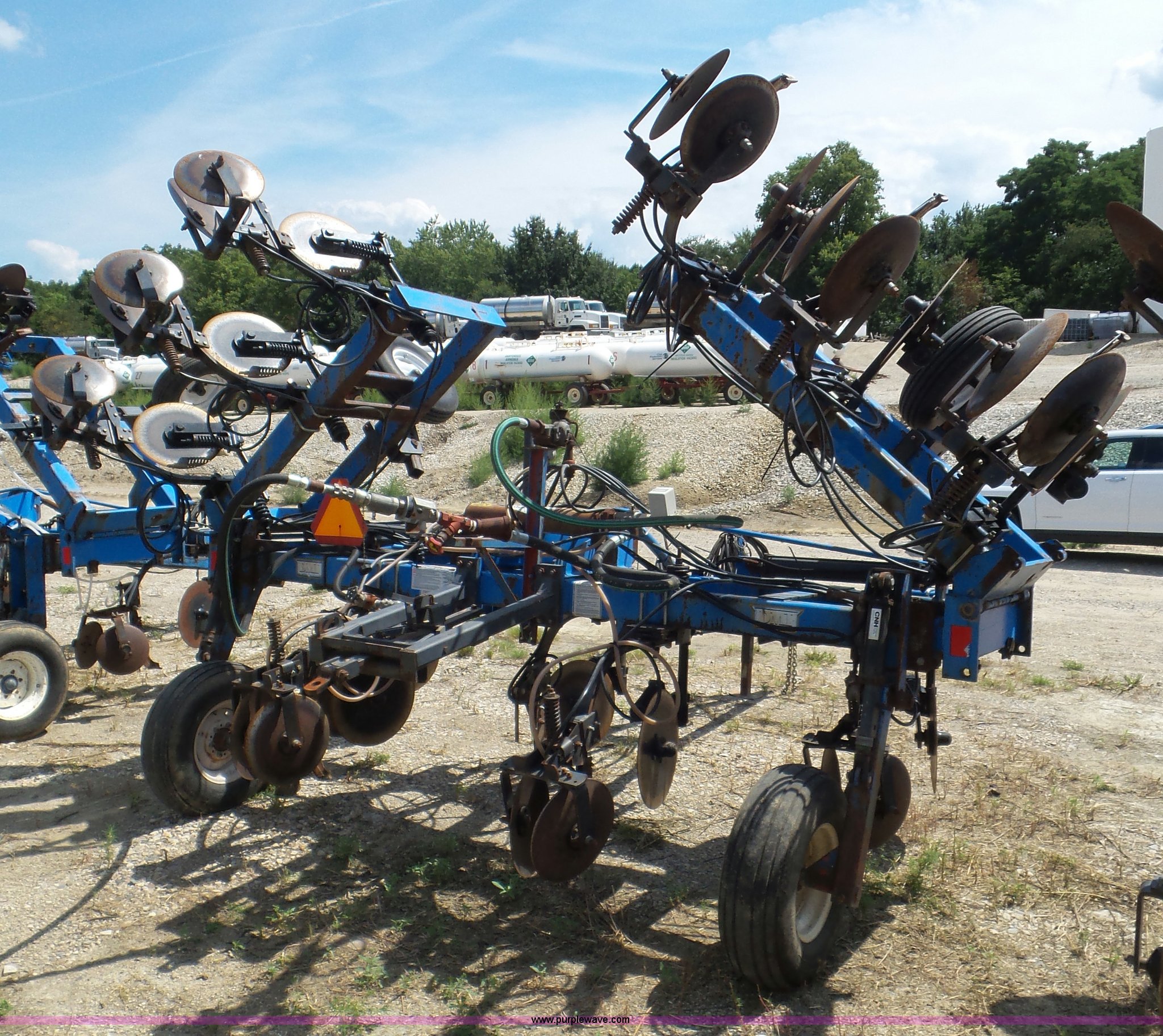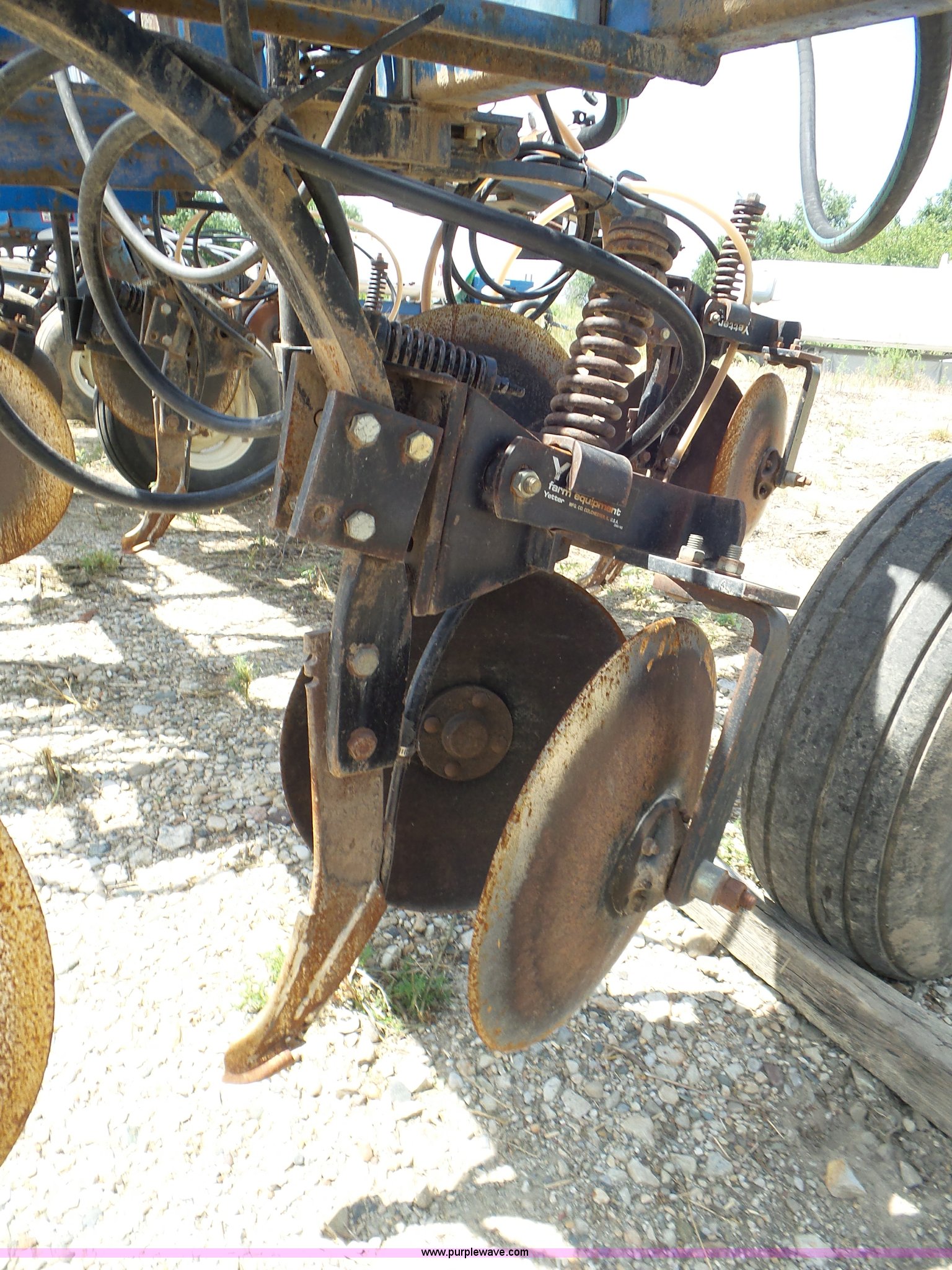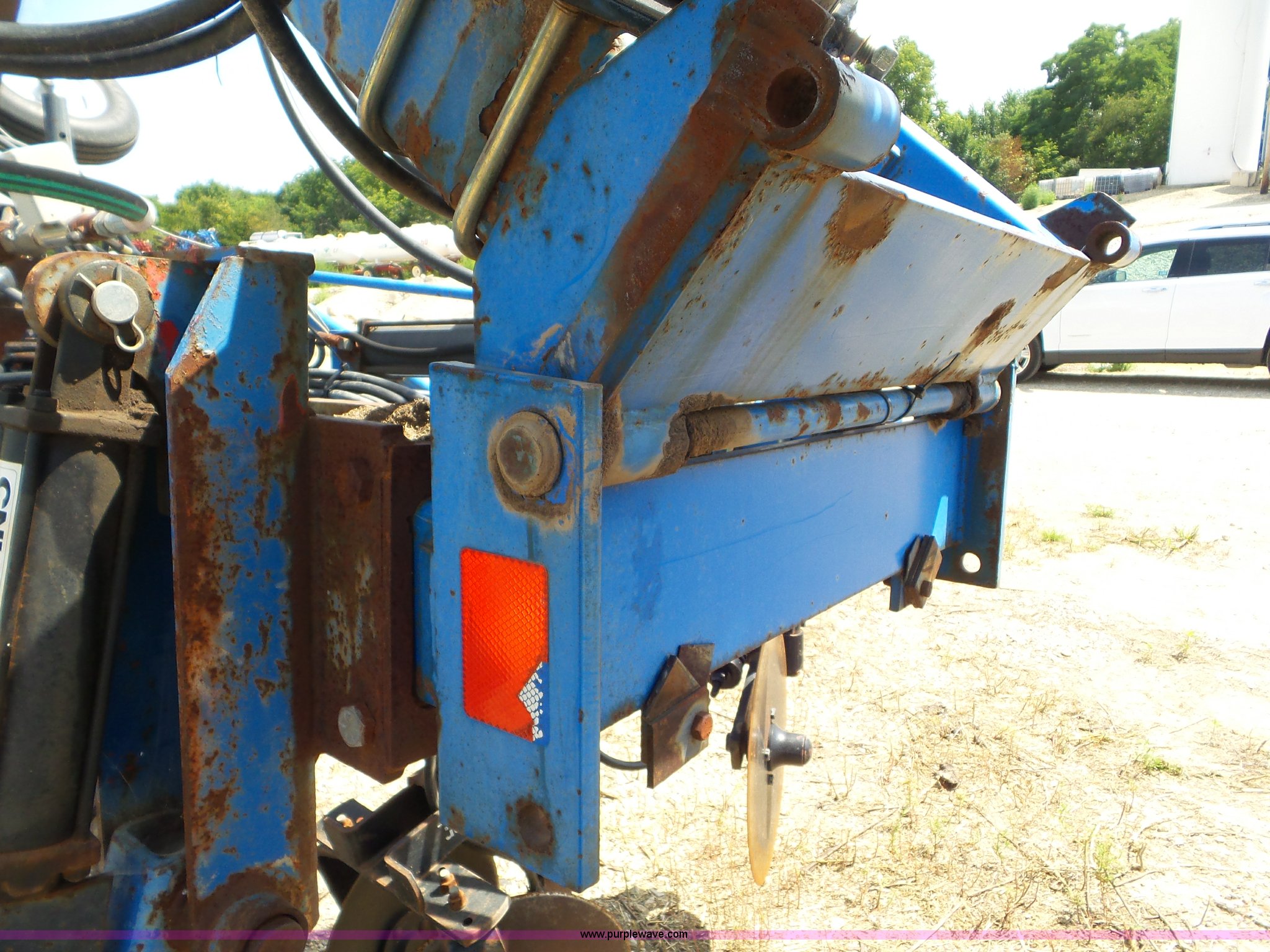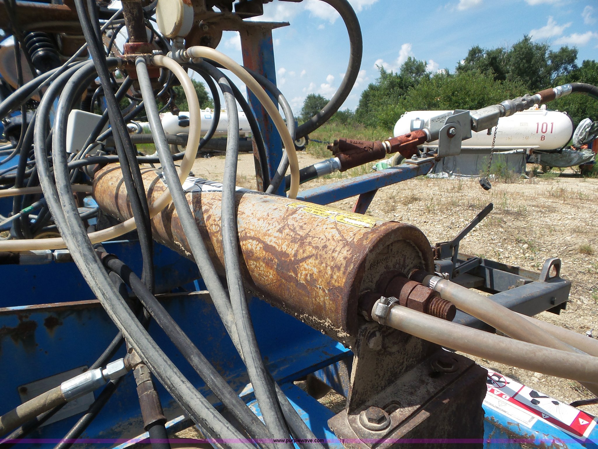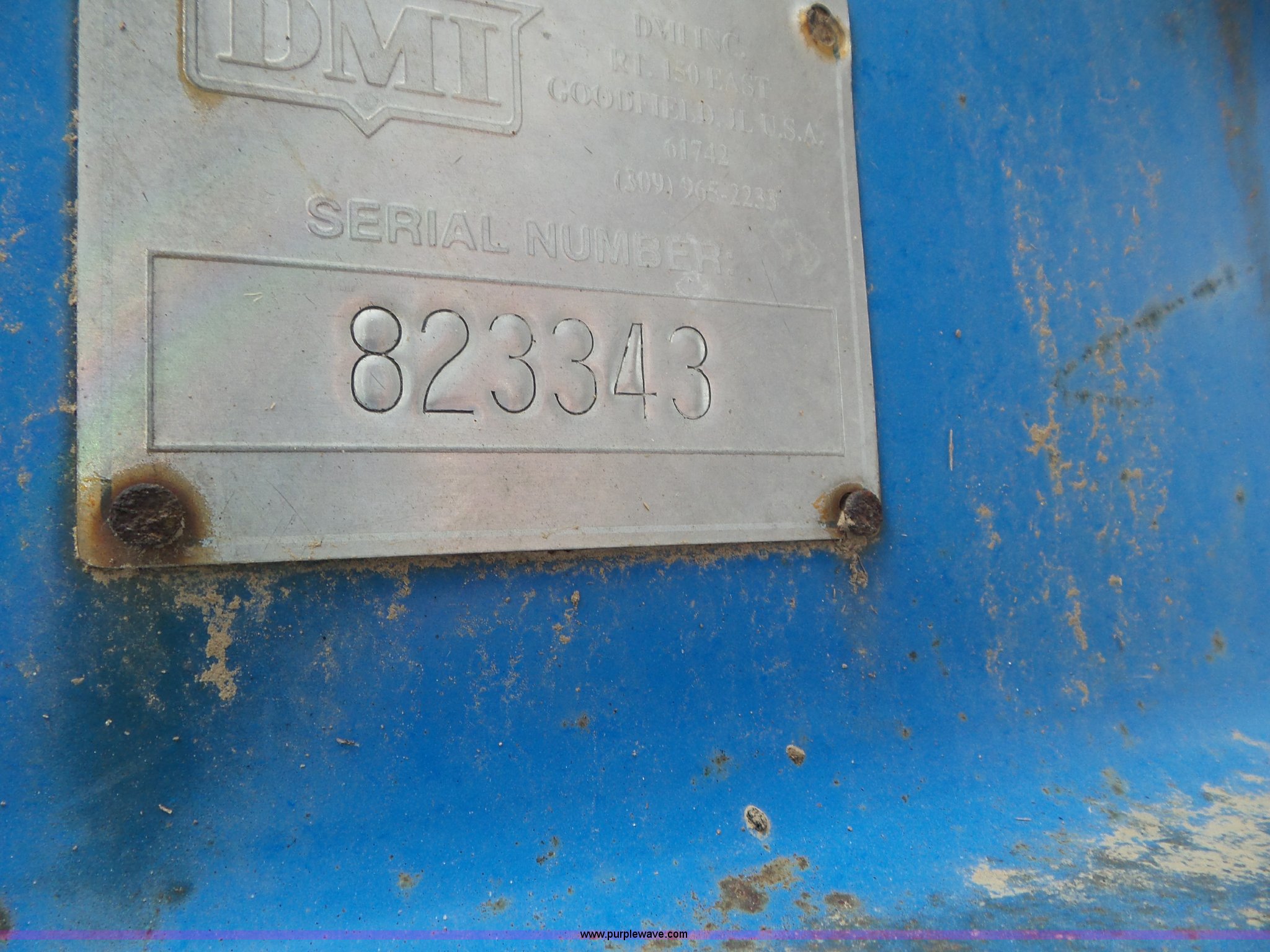 Purple Wave is selling a used Applicator Pull Type in Indiana. This item is a DMI Nutri-Placr 3250 applicator with the following: Approximately 24'W, (11) shanks, Openers, Yetter closing wheels, B9500 Continental Metermatic anhydrous pump with hydraulic shut off, Hydraulic fold and lift, Front and rear pin hitches, 11-15 tires, Serial 823343, Unit# 11-4