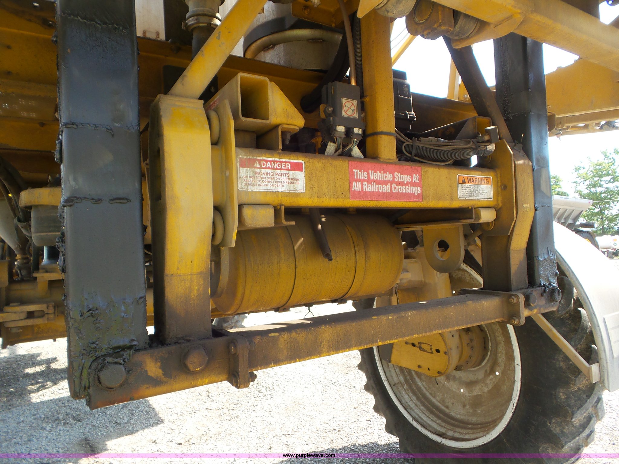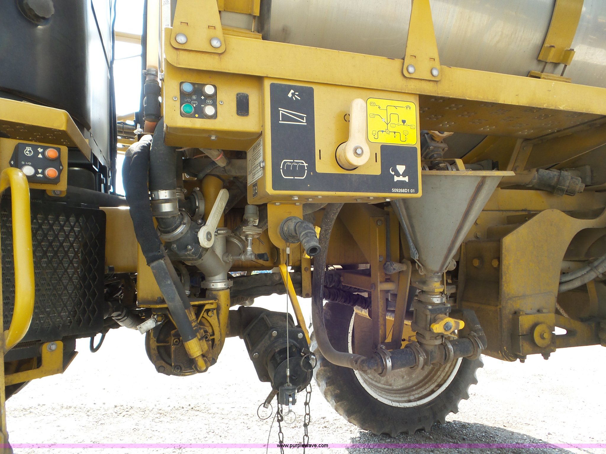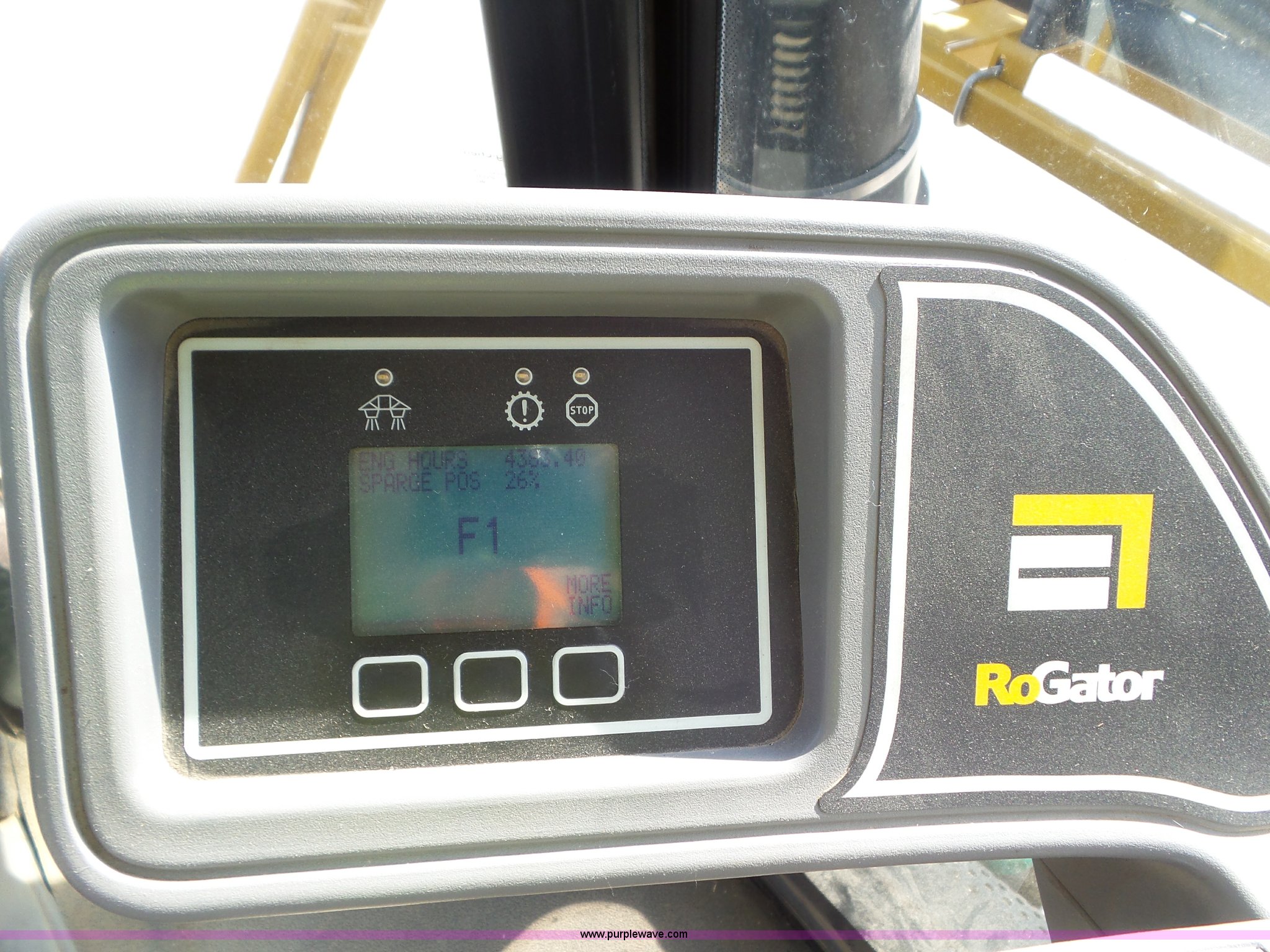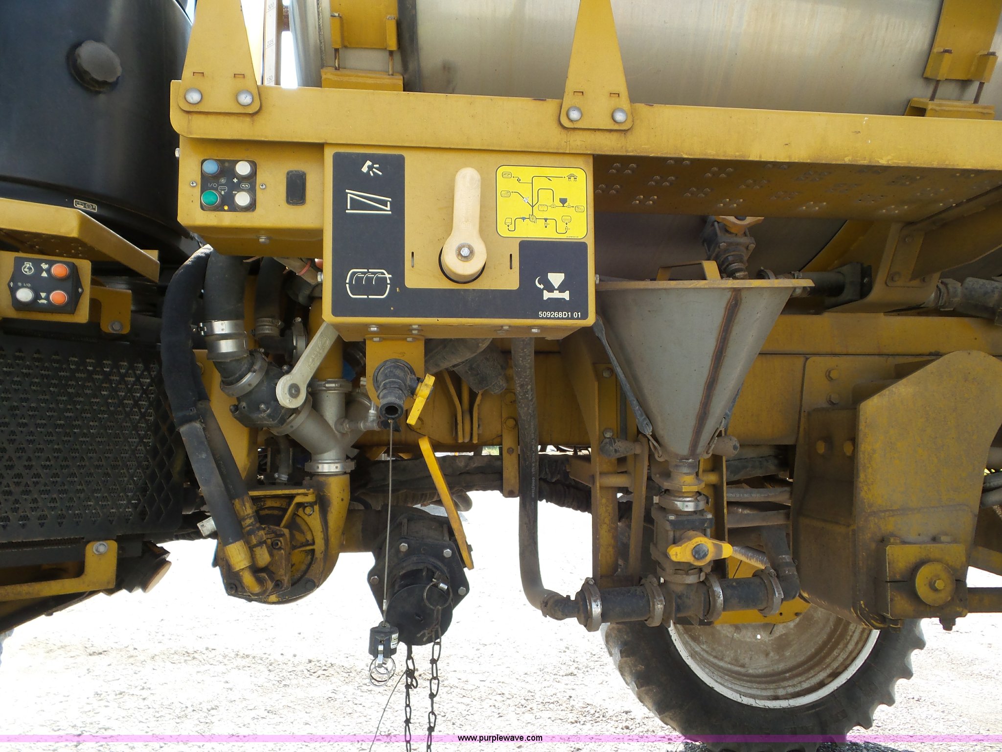 2008 Rogator 1286C self-propelled applicator. 4,383 hours on meter, Caterpillar six cylinder turbo diesel engine, Hydrostatic transmission, Four wheel dirve, AC and heat Non-operational AC, AM/FM, Air suspension seat, Work lights, 1,200 gallon stainless steel tank, 120' boom width, Five sections, Boom breakaway, Hydraulic boom fold, Automatic height control, 10" nozzle body spacing Three way nozzle bodies, Lightbar, Raven GPS monitor, Spray controls, Auto steer, Ground radar, Hydraulic ladder, Fenders, Hydraulic axle width adjustment, 380/90R46 row crop tires, Rear wheel drive leaks, Hydrostatic control issues, Boom return issues, Unknown operating condition of auto height control, Serial AGCA1286KNT001075, Unit# 43934. Crop Production Services. 10643. Amboy, IN 46911