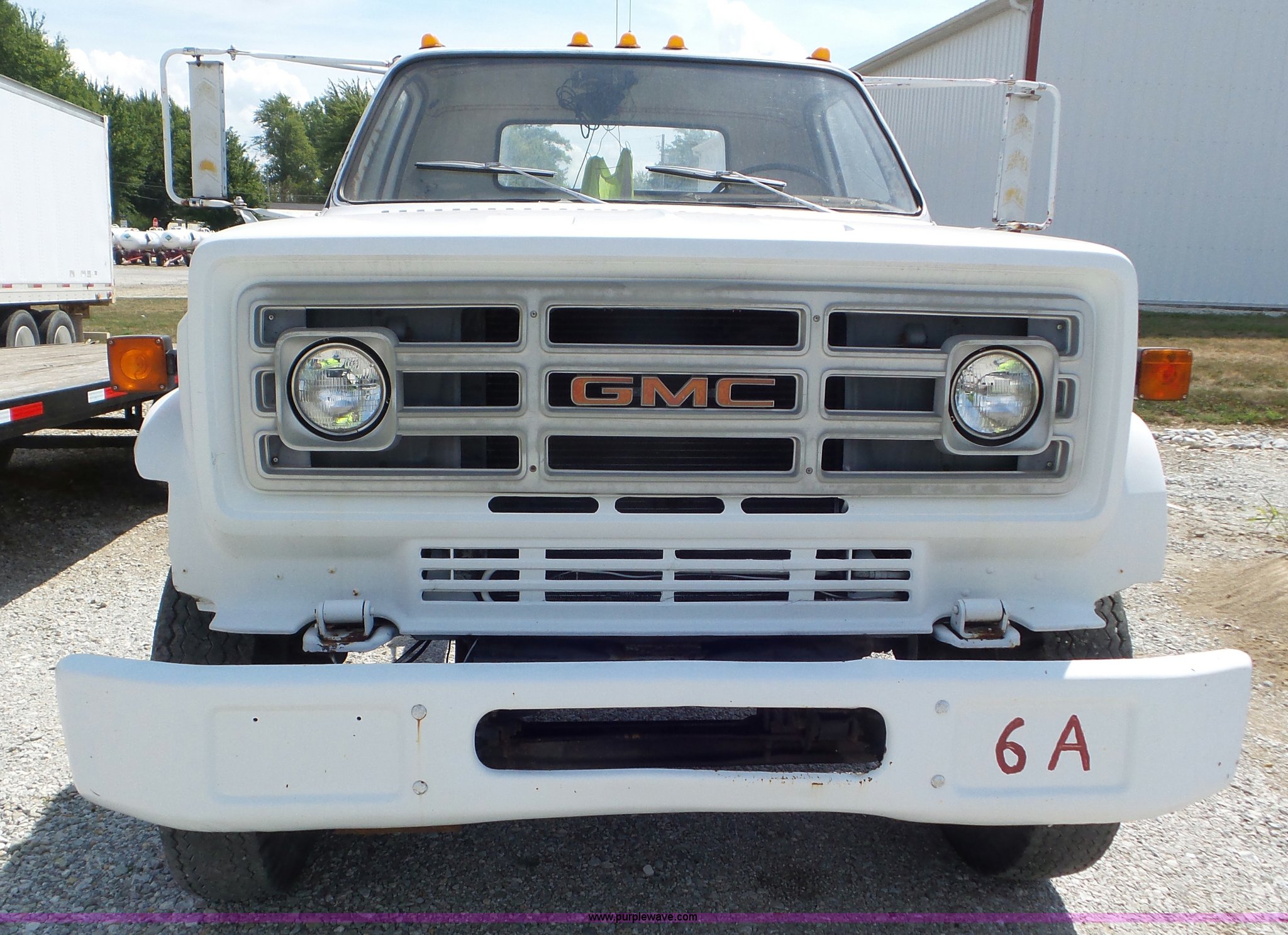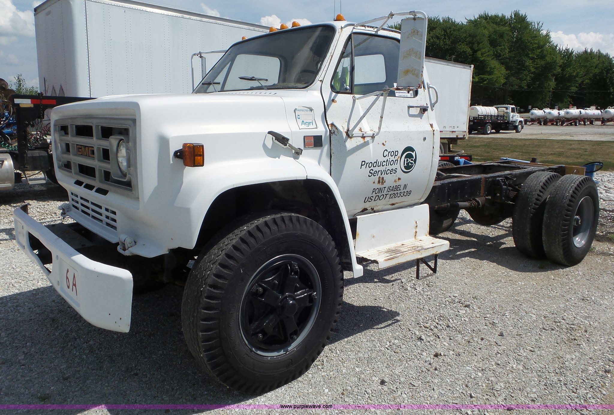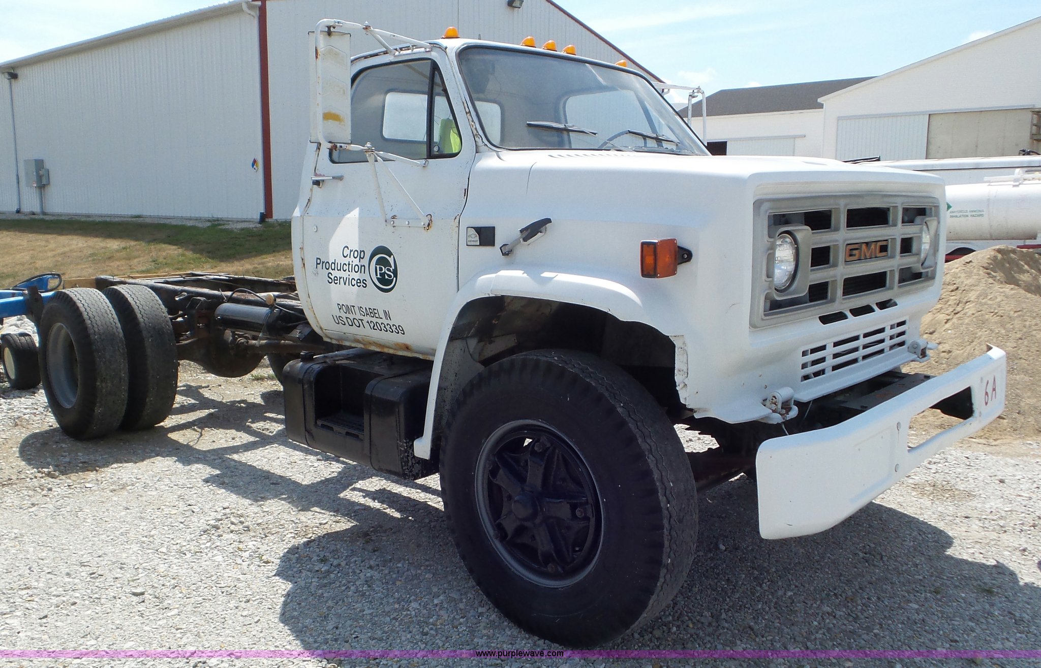 1981 GMC truck cab and chassis. 47,223 miles on odometer, Eight cylinder gas engine, Five speed manual transmission, Two speed rear end, Heat, AM/FM, Spring suspension seat, Trailer brake controller, Single fuel tank, 164" wheelbase, Spring suspension, Hydraulic brakes, 11R22.5 tires, GVWR 27,500 lbs, Windshield cracked, Rust, Contents are not included, Unit# 38627. Indiana title. Title distribution may be delayed up to 30 days from verification of funds and title assignment. 1GDL7D1B8BV574329. Crop Production Services. 401 N. Factory. Fairmount, IN 46928