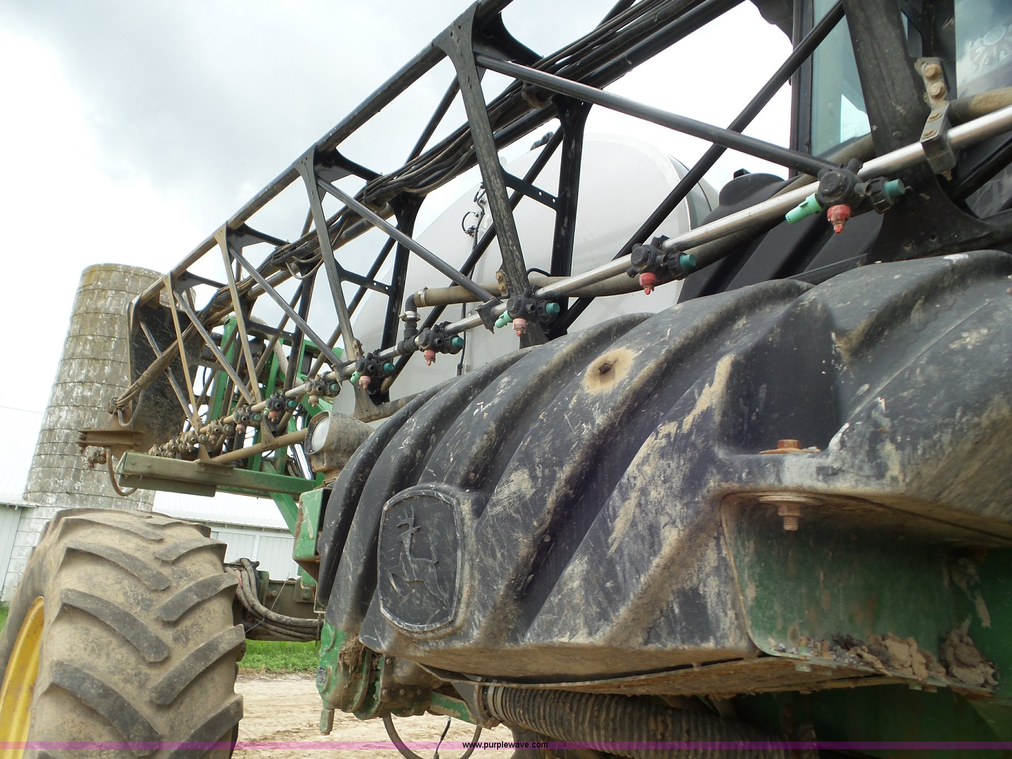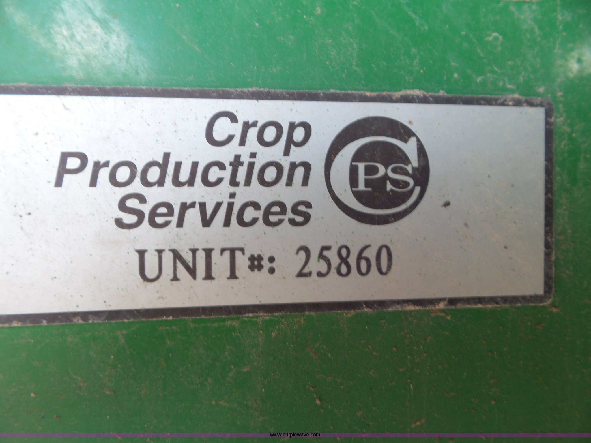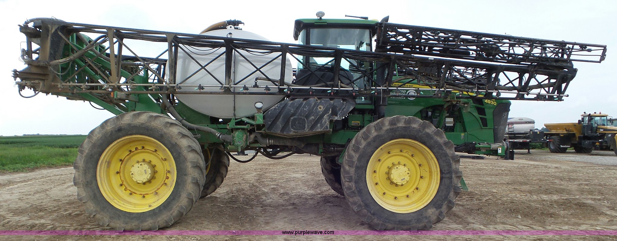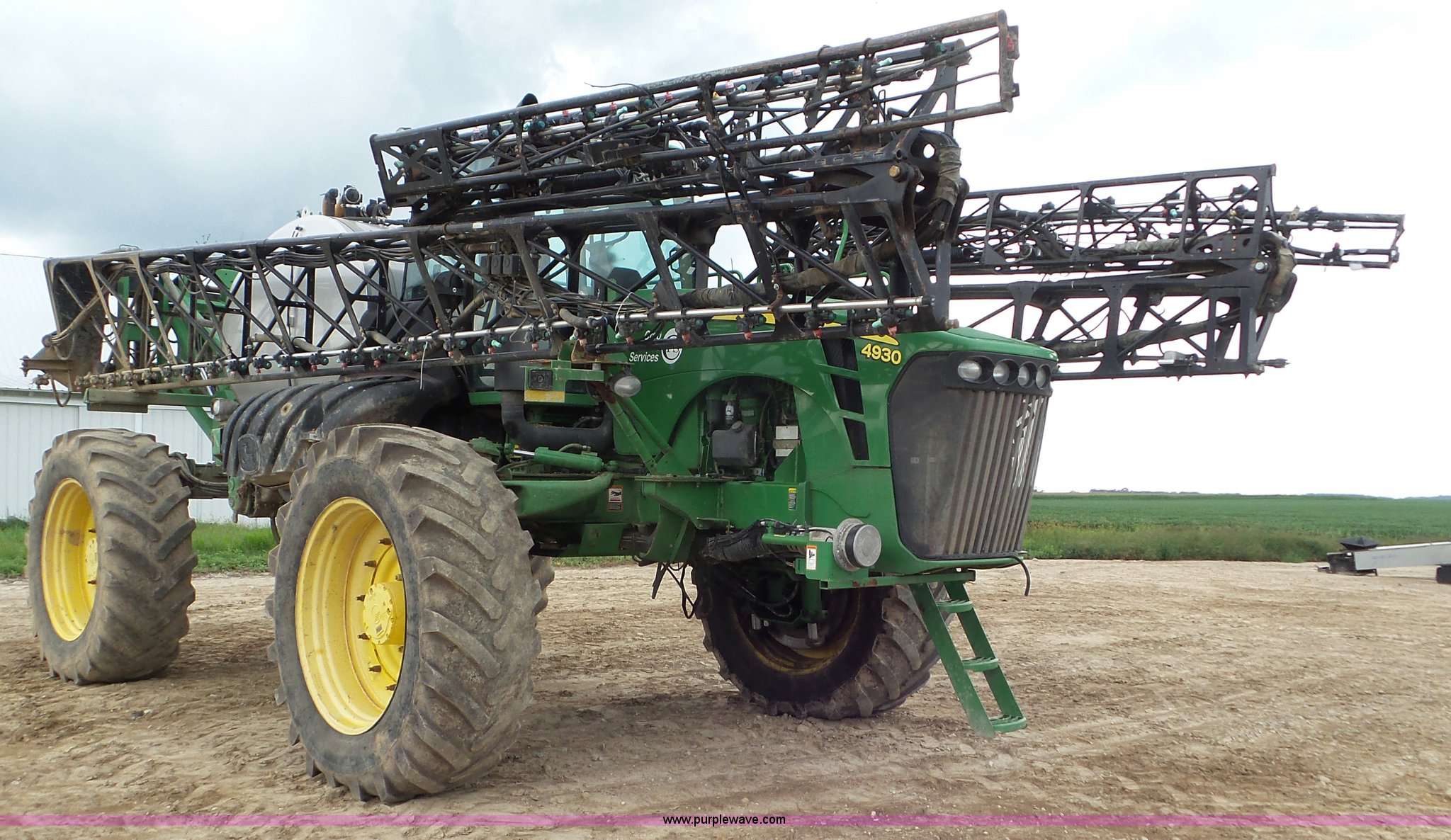 2010 John Deere 4930 self-propelled applicator. 4,478 hours on meter, John Deere six cylinder turbo diesel engine, Hydrostatic transmission 4F-4R gears, Four wheel drive, 1,200 gallon stainless steel solution tank Front fill, Stainless steel chemical eductor tank, Foam marker tank, 120'W boom Seven boom sections, Break-away boom, Hydraulic boom fold, Hydraulic height control, Automatic height control, 15" nozzle spacing, Five-way nozzle bodies, Load Command with truck arm, AC and heat, AM/FM, Air suspension seat, Rotary beacon, Work lights, GPS monitor, GreenStar GPS receiver, Auto steer, Ground radar, Hydraulic ladder, Hydraulic axle width adjust, 620/70R46 flotation tires, Serial 1N04930XCA0013032, Unit# 25860. View repairs. Crop Production Services. 473 S Co. Rd. 350 W. Greensburg, IN 47240