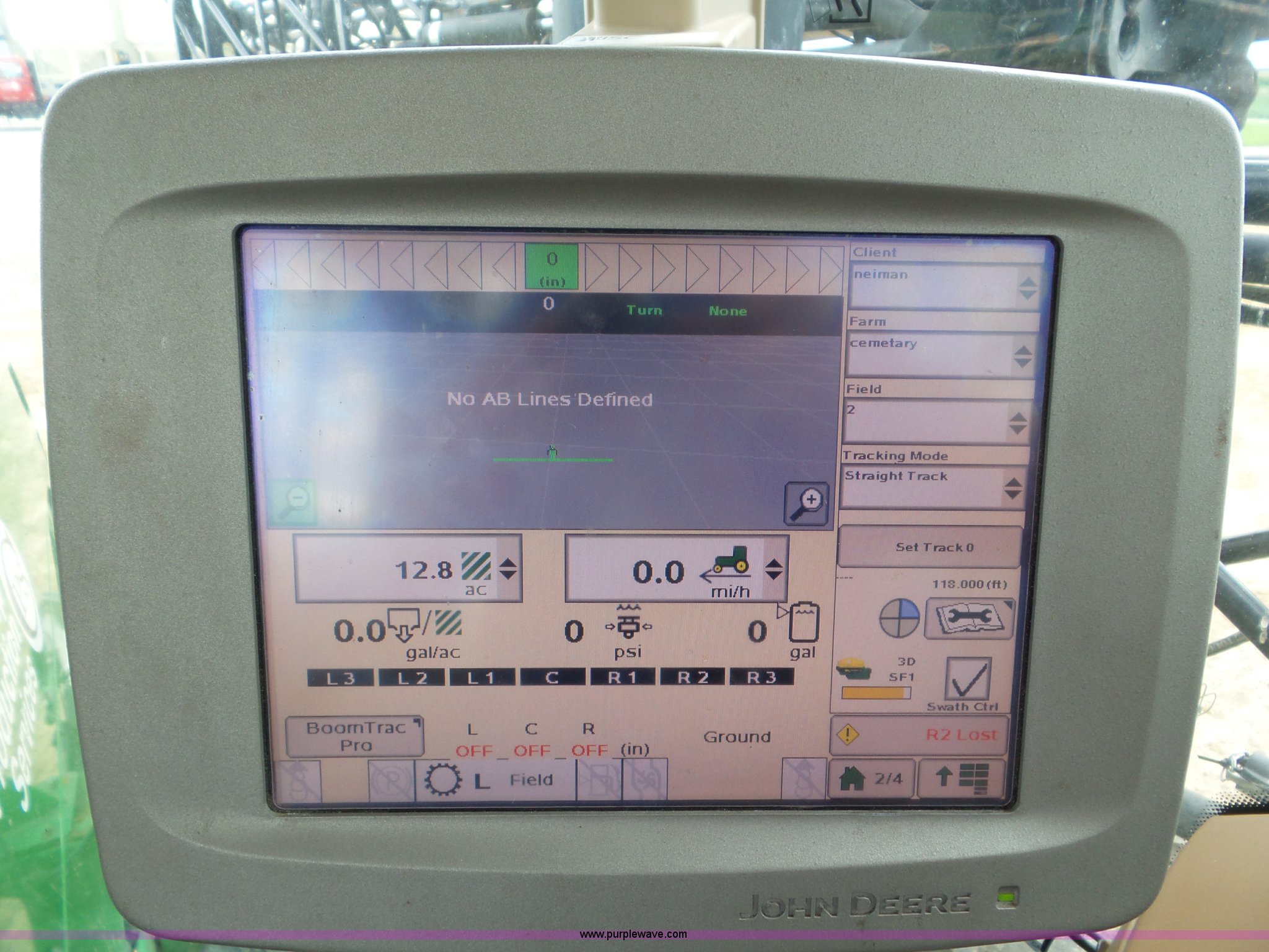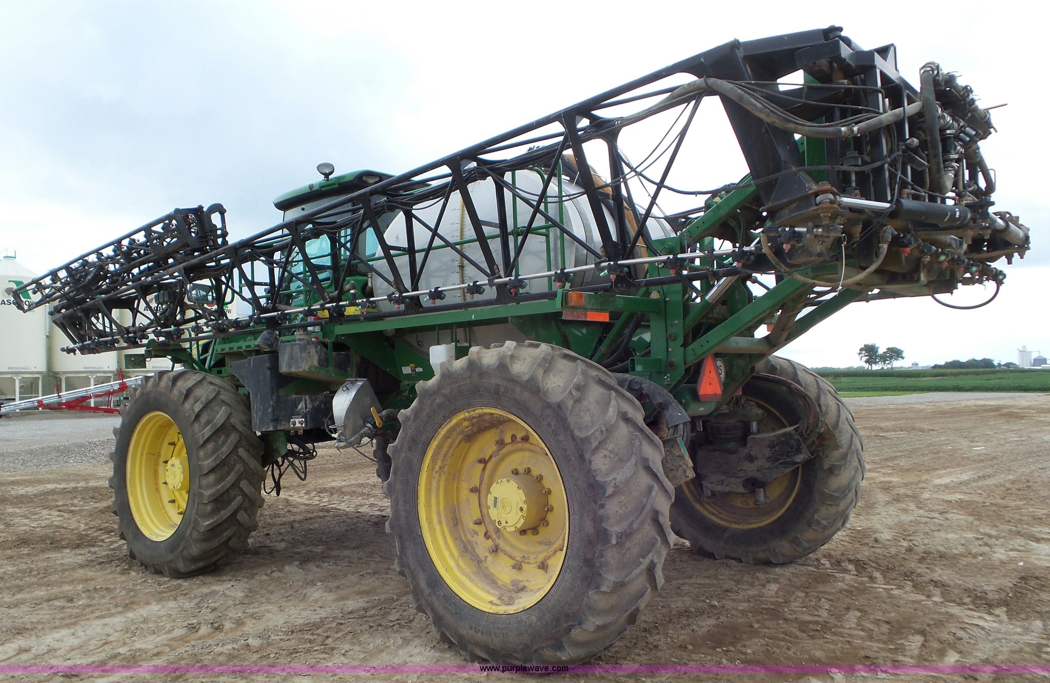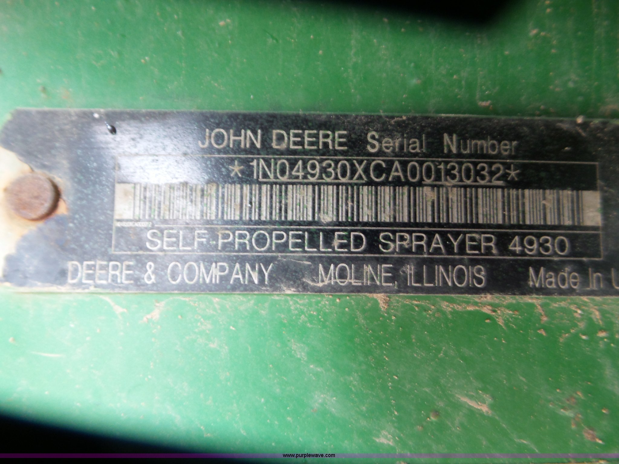 Purple Wave is selling a used Applicator Self Propelled in Indiana. This item is a 2010 John Deere 4930 self-propelled applicator with the following: 4,478 hours on meter, John Deere six cylinder turbo diesel engine, Hydrostatic transmission, 4F-4R gears, Four wheel drive, 1,200 gallon stainless steel solution tank, Front fill, Stainless steel chemical eductor tank, Foam marker tank, 120'W boom, Seven boom sections, Break-away boom, Hydraulic boom fold, Hydraulic height control, Automatic height control, 15" nozzle spacing, Five-way nozzle bodies, Load Command with truck arm, AC and heat, AM/FM, Air suspension seat, Rotary beacon, Work lights, GPS monitor, GreenStar GPS receiver, Auto steer, Ground radar, Hydraulic ladder, Hydraulic axle width adjust, 620/70R46 flotation tires, Serial 1N04930XCA0013032, Unit# 25860