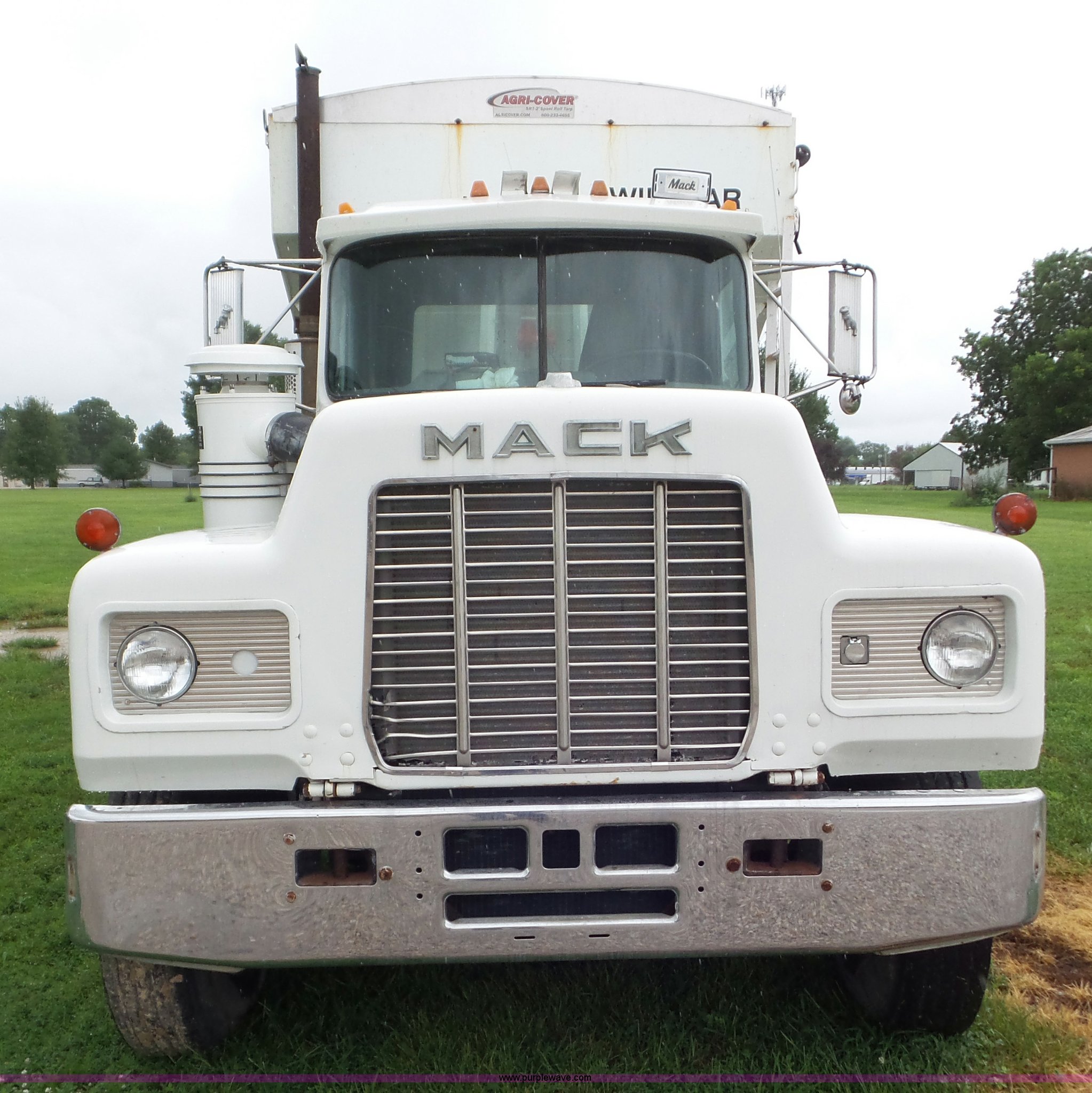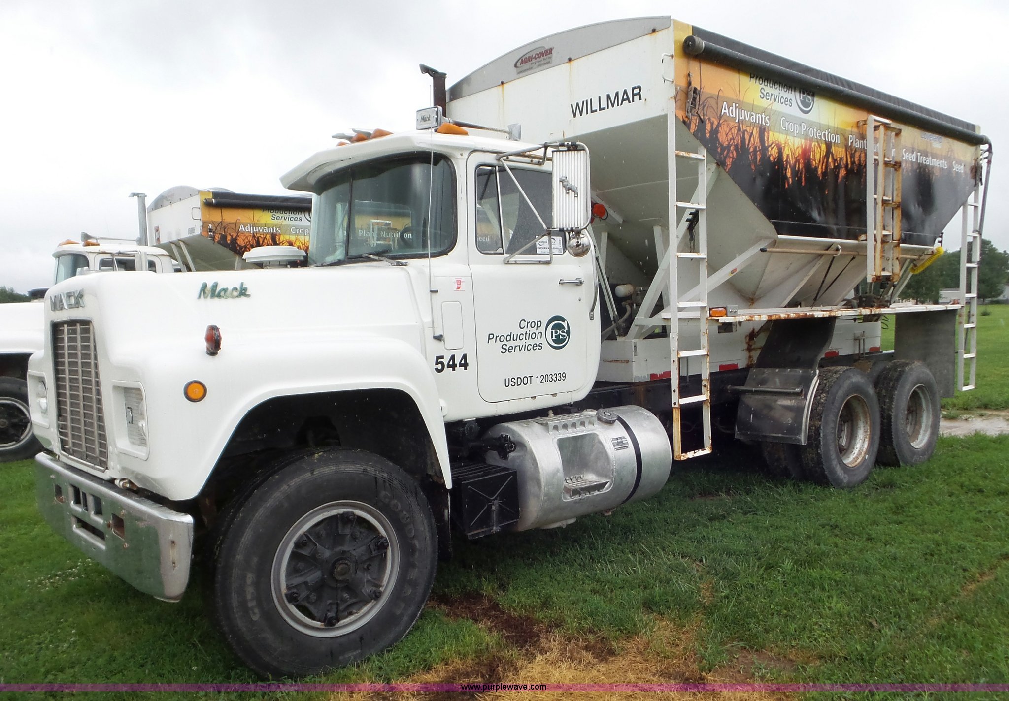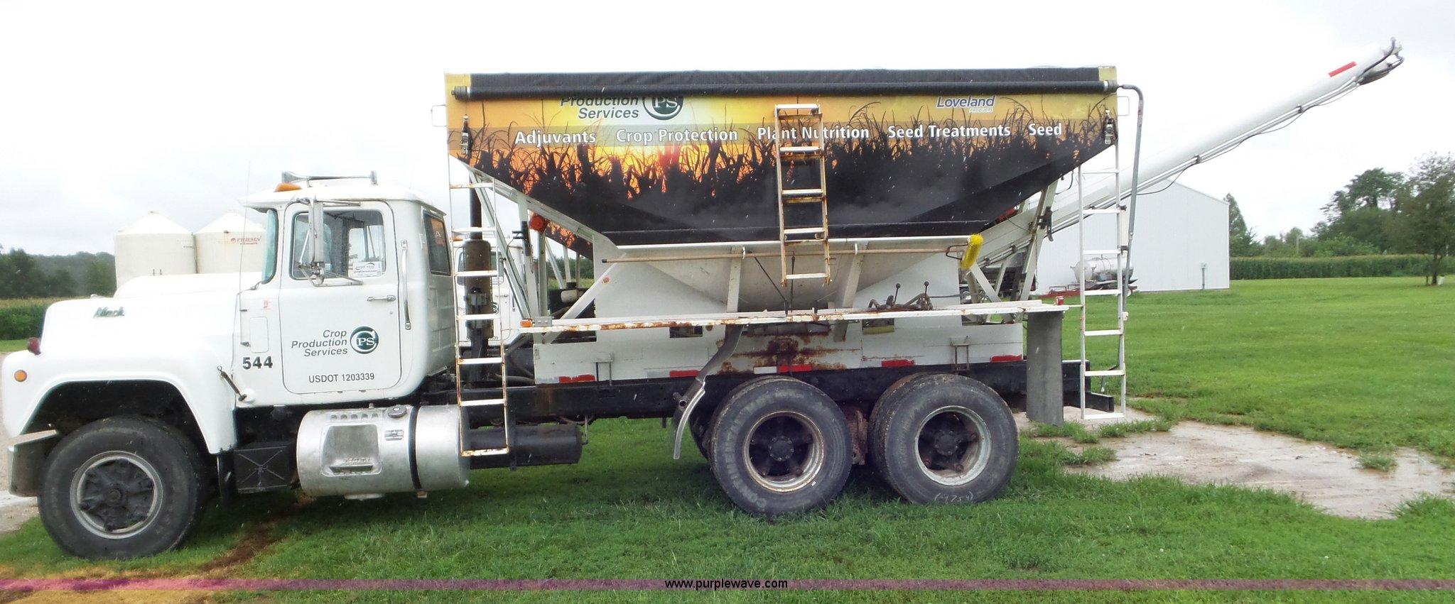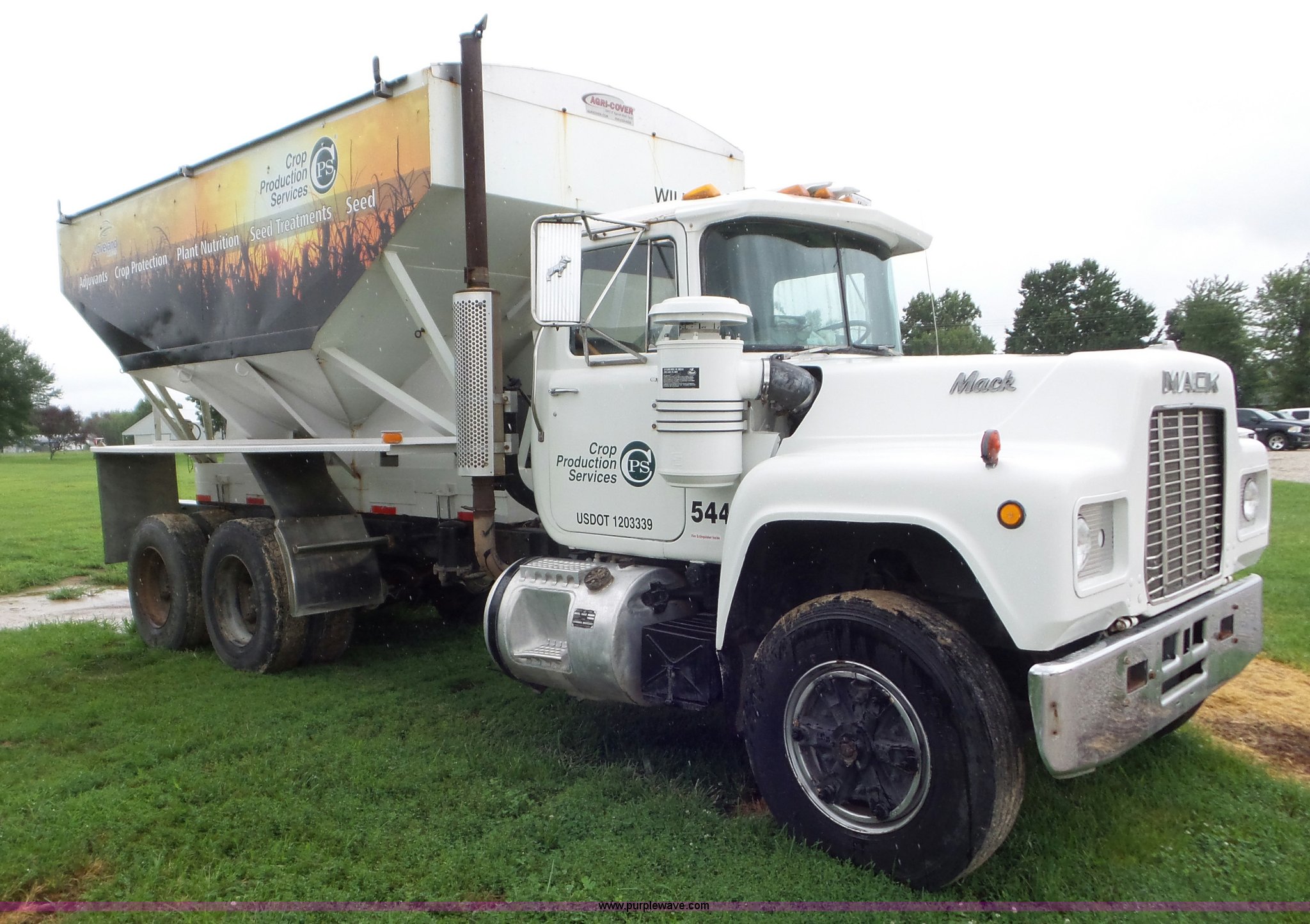 Purple Wave is selling a used Fertilizer or Feed Delivery Truck in Indiana. This item is a 1987 Mack R686ST tender truck with the following: 57,618 miles on odometer, 4,399 hours on meter, Mack E6 11.0L L6 turbo diesel engine, Nine speed manual transmission, Tandem axle, Inter-axle differential lock, Heat, AM/FM, Air suspension seat, Air ride cab, PTO, Exterior visor, Willmar steel tender bed, 16'L x 8'W, Approx. 12'L x 8" diameter auger, Two valve control, Rollover tarp, Dual fuel tanks, Pin hitch, Camelback suspension, Air brakes, 206" wheelbase, 11R22.5 tires, Hopper vibrator not included, Unit# 45443