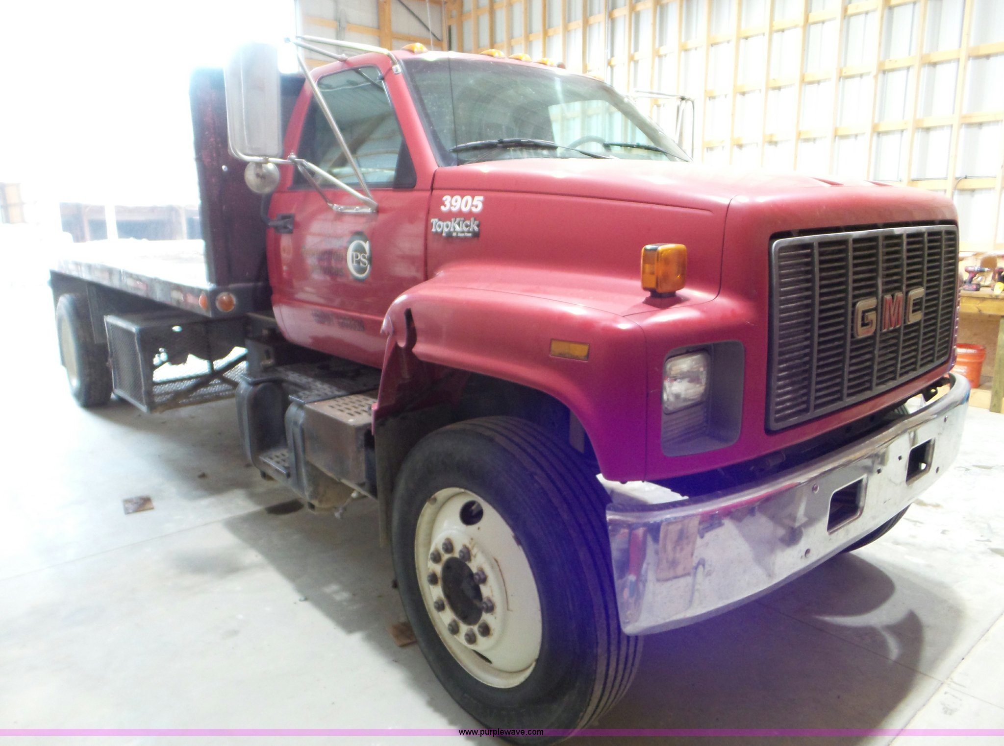 Purple Wave is selling a used Flat Bed Truck in Indiana. This item is a 1995 GMC TopKick 7000 flatbed truck with the following: 215,001 miles on odometer, Caterpillar 3116 6.6L six cylinder diesel engine, Five speed manual transmission, Two speed rear end, Single axle, Heat, AM/FM, Suspension seat, 20'L x 8'W flatbed, Dual fuel tanks, Pin hitch, Air brakes, 285/75R24.5 tires, Contents not included, Unit# 23905