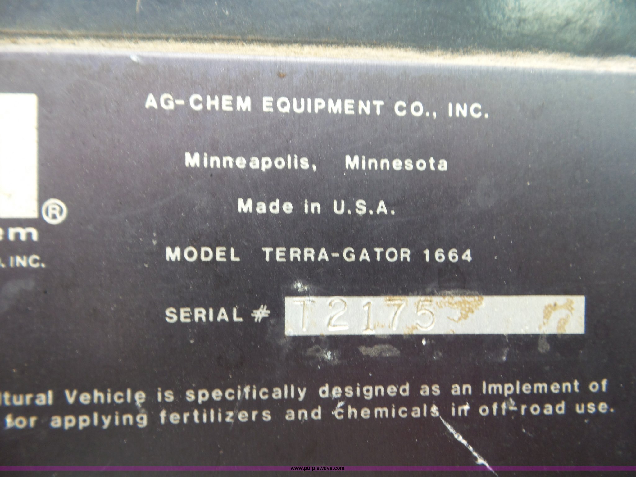 Purple Wave is selling a used Applicator Self Propelled in Kentucky. This item is a Ag-Chem TerraGator 1664 self-propelled applicator with the following: 95,457 miles on odometer, 16,525 hours on meter, Six cylinder turbo diesel engine, Eaton Fuller 18 speed manual transmission, Four wheel drive, Air suspension seat, Work lights, 12'L dry fertilizer spreader bed, Dual spinners, 16" conveyor belt, Stainless steel construction, 48x31.00-21 front flotation tires, 66x43.00-25 rear flotation tires, Serial T2175
