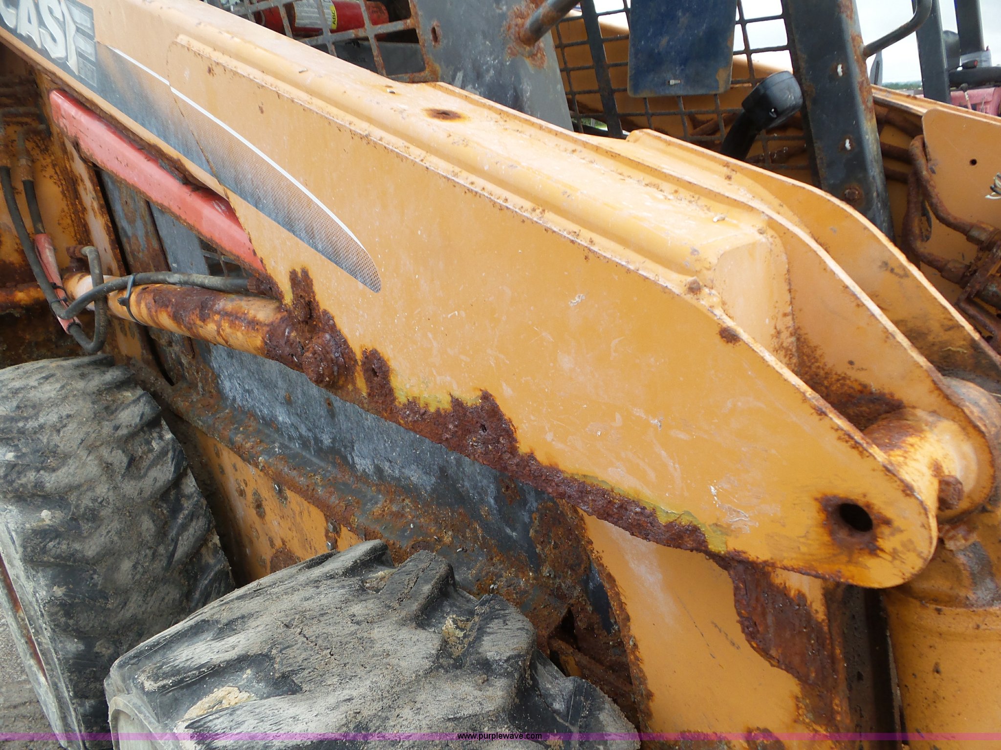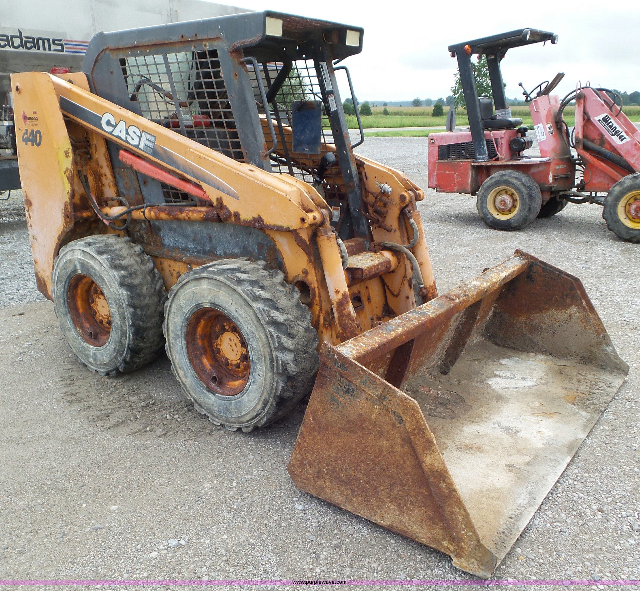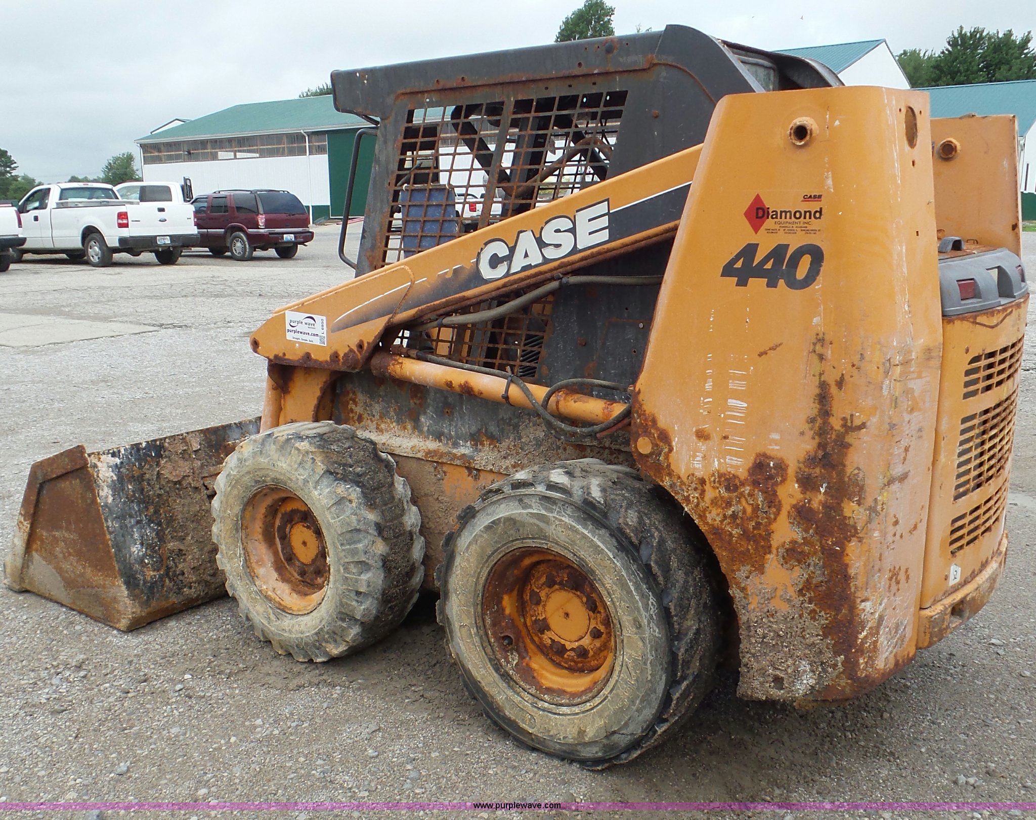 Purple Wave is selling a used Skid Steer Loader in Kentucky. This item is a 2006 Case 440 skid steer with the following: 1,806 hours on meter, Case 4.5L four cylinder turbo diesel engine, Hydrostatic transmission, Canopy, Joystick controls, Suspension seat, Backup alarm, Front and rear work lights, Auxiliary hydraulic, Manual quick coupler, 77"W bucket, Weld-on cutting edge, 12-16.5 tires, 7,027 lbs. base operating weight, Serial N6M443310