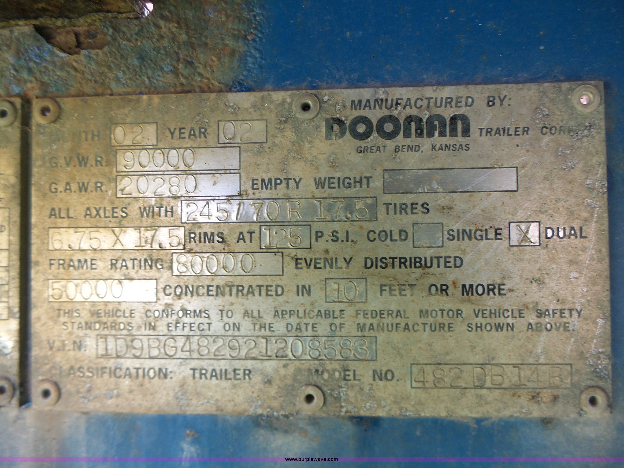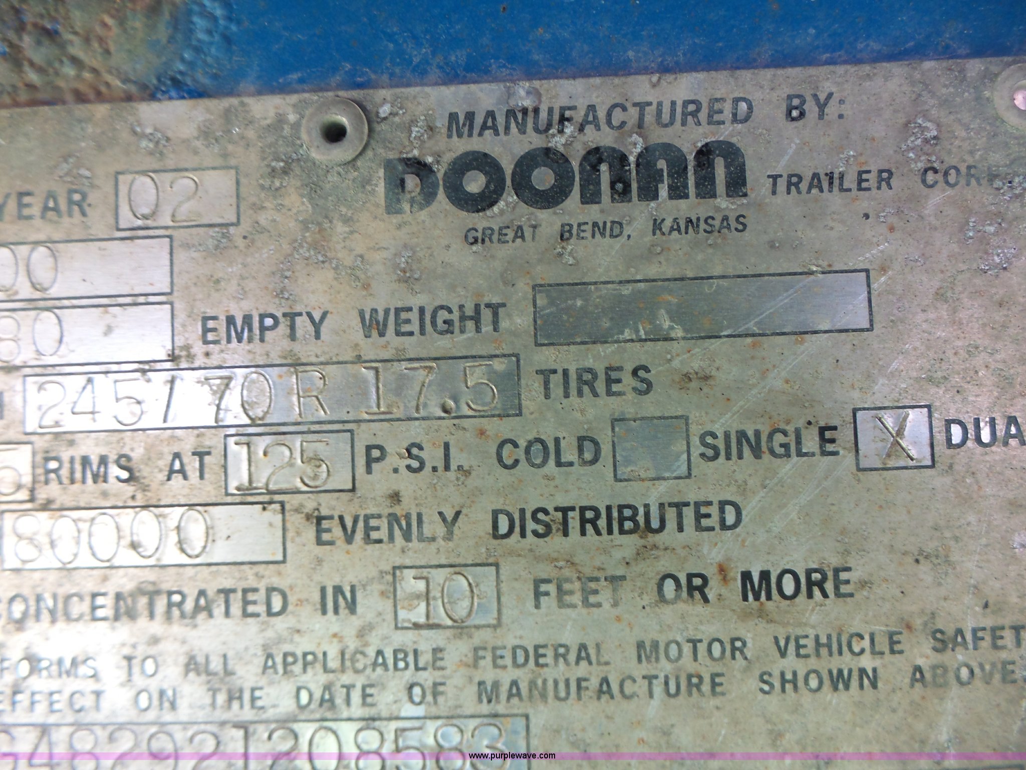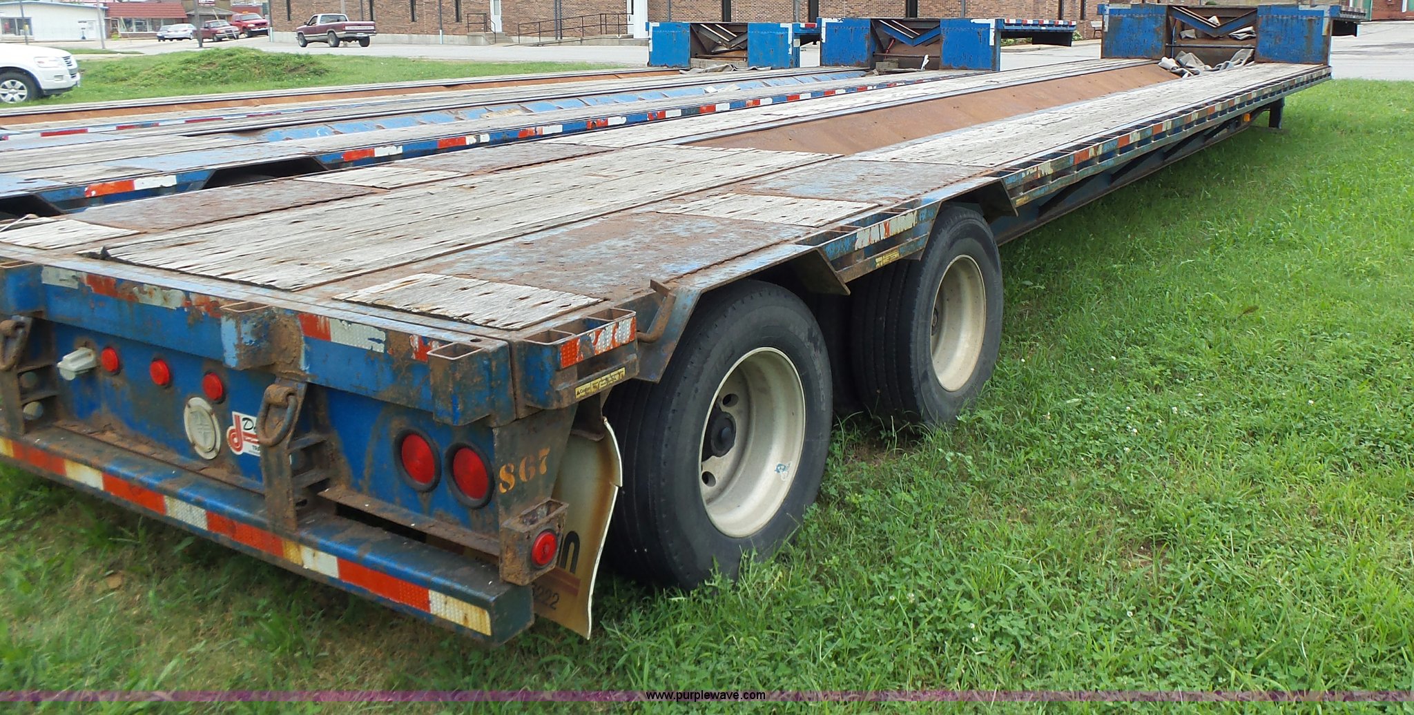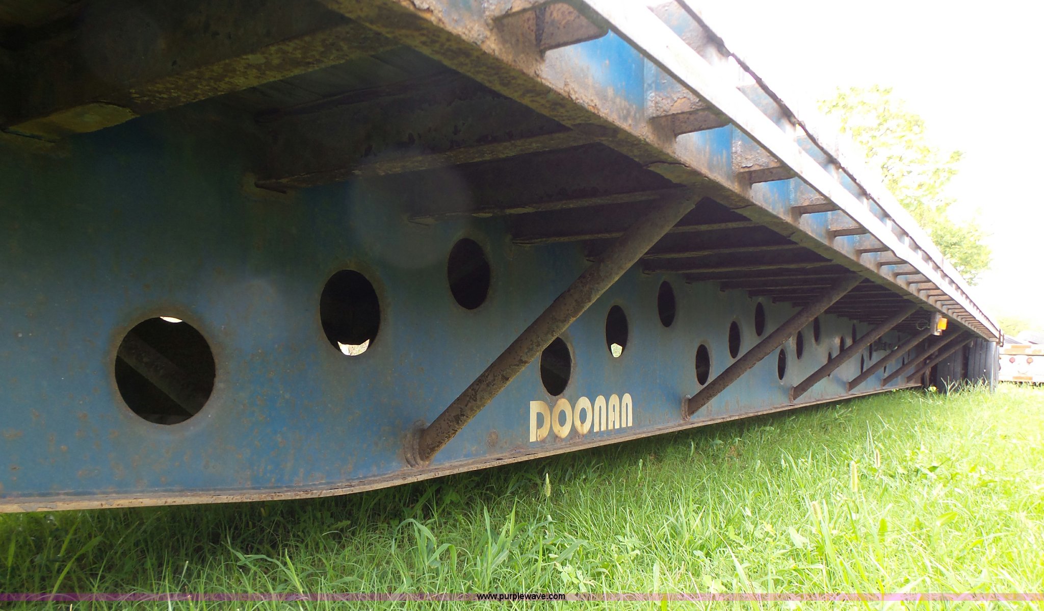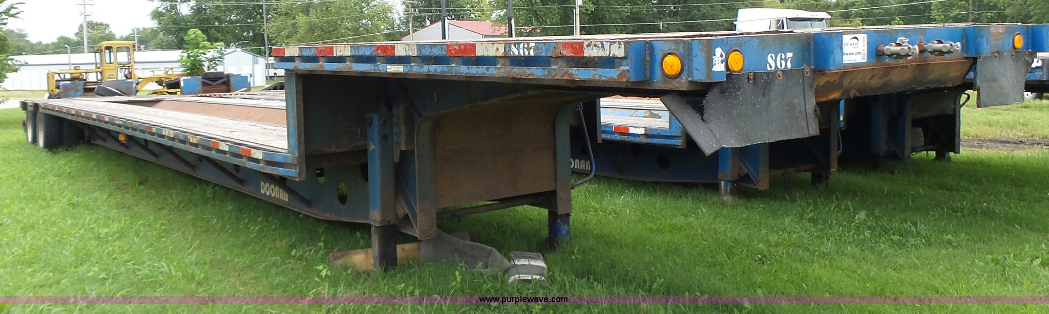 Purple Wave is selling a used Equip. Trailer in Missouri. This item is a 2002 Doonan 482DB14B drop deck equipment trailer with the following: 48'L x 8.5'W overall, 10'L top deck, 38'L main deck, 5'L slide-out tail, 32" deck height, Fifth wheel plate, Dual leg landing gear, Air suspension, Air brakes, Tandem axle, Aluminum wheels, 245/70R17.5 tires, GVWR 80,000 lbs
