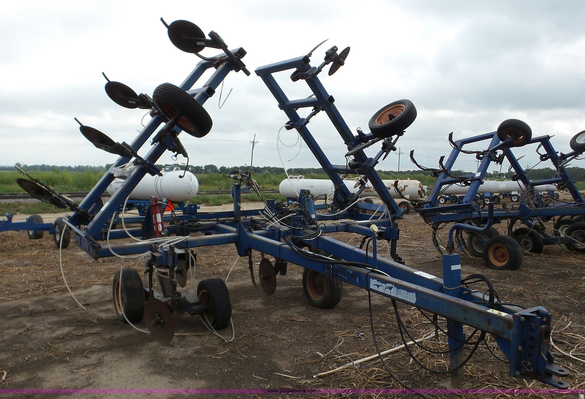 Purple Wave is selling a used Applicator Pull Type in Kansas. This item is a Blu-Jet Landwalker applicator with the following: 32.5'W, (13) knives with coulters, 30" spacing, 27x9.50-15 tires, Flat tires