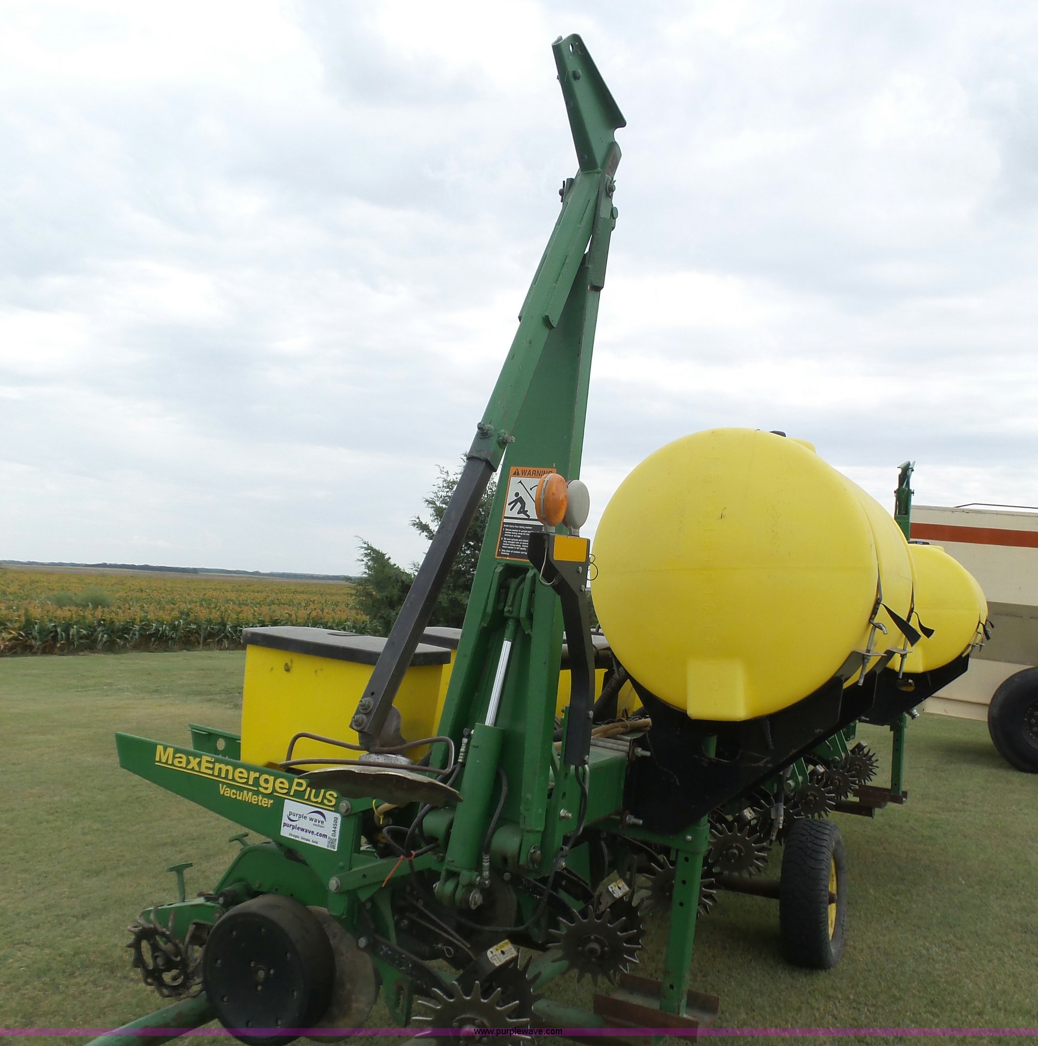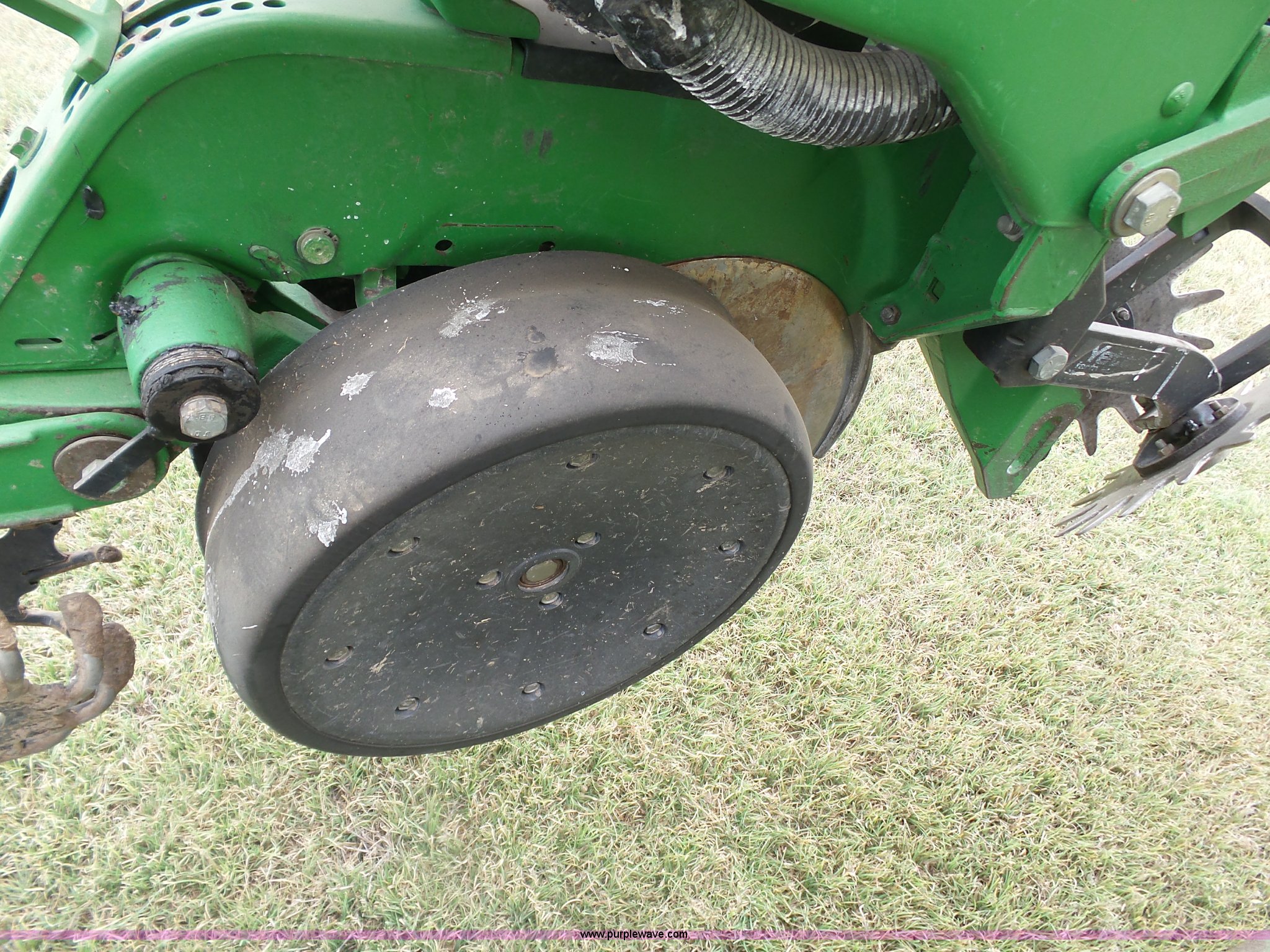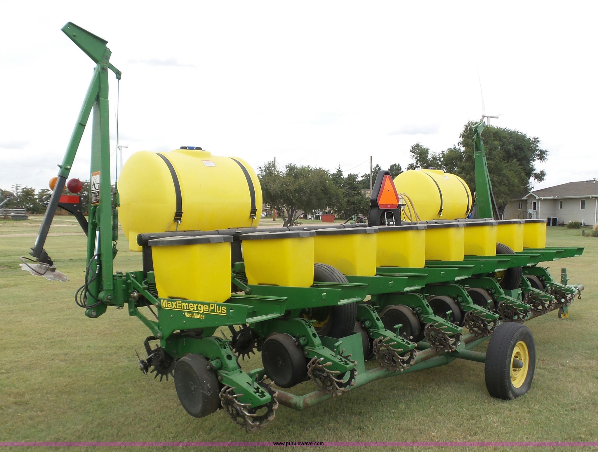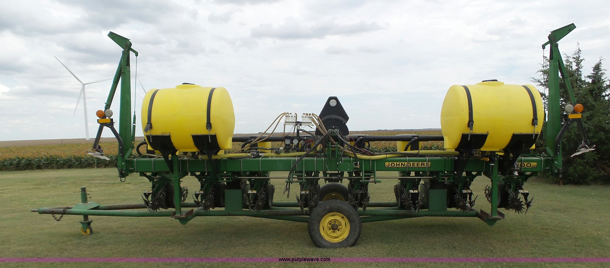 Purple Wave is selling a used Planter in Kansas. This item is a 1998 John Deere 1700 Max Emerge Plus Vacumeter no-till planter with the following: 19'W, Eight rows, 30" row spacing, Hydraulic marker arms, Individual seed hoppers, Vacuum metering, Ground meter drive, Double disk openers, Double gauge wheels, Double spiked closing system, (2) 150 gallon liquid tanks, Coulter applicator, Shur-Flo 2088 electric diaphragm pump, 4 gpm, Red Ball monitors,, John Deere Computer Trak 250 monitor, (2) 7.60-15 drive/outside tires, Heavy residue no-till coulters, Chemical arms for rear of each row, Additional press wheels, Additional meters, Additional parts, Transport trailer, 23'L, Slab hitch, 235/75R15 tires, Stored inside, Serial H01700R670919