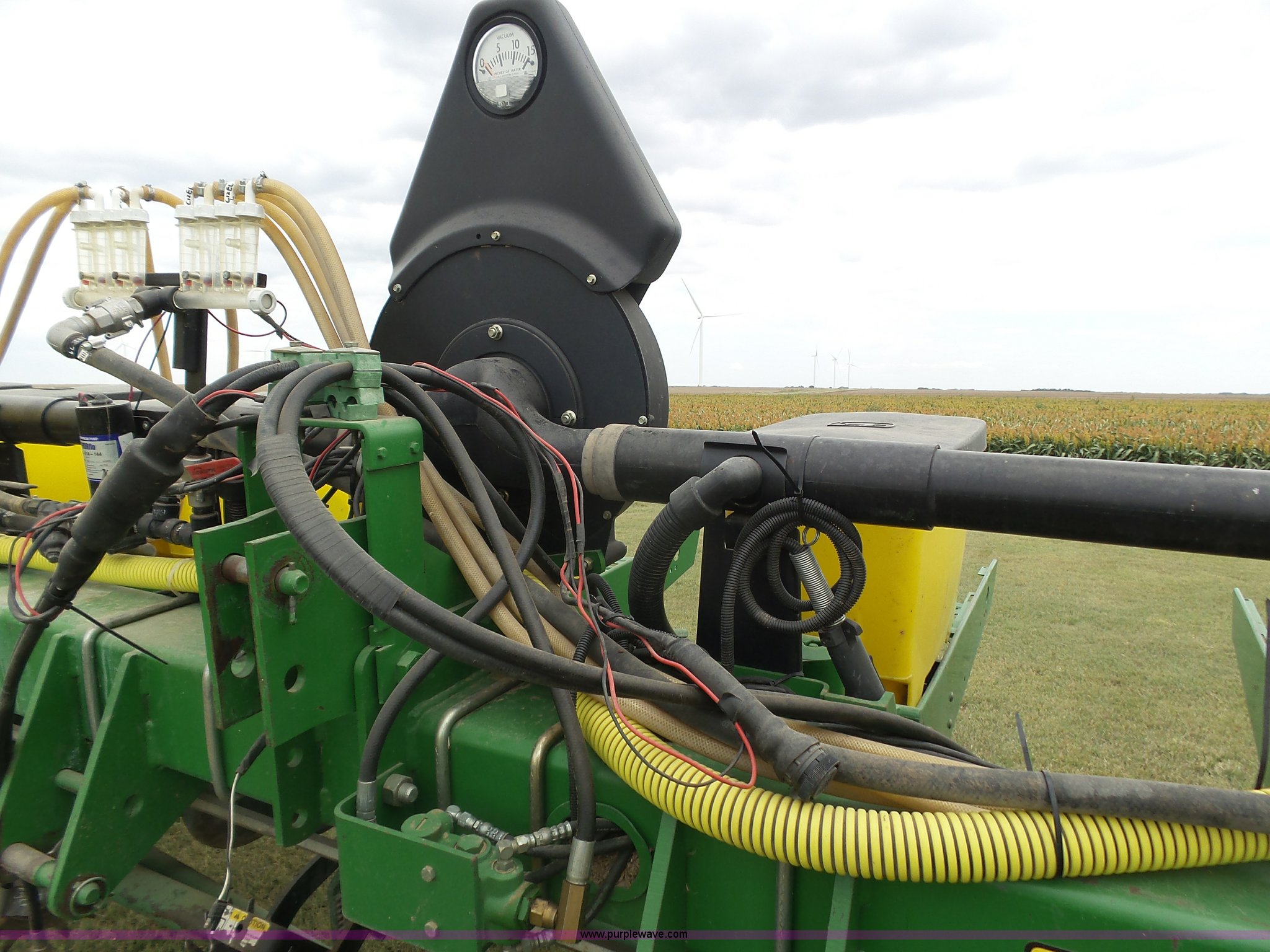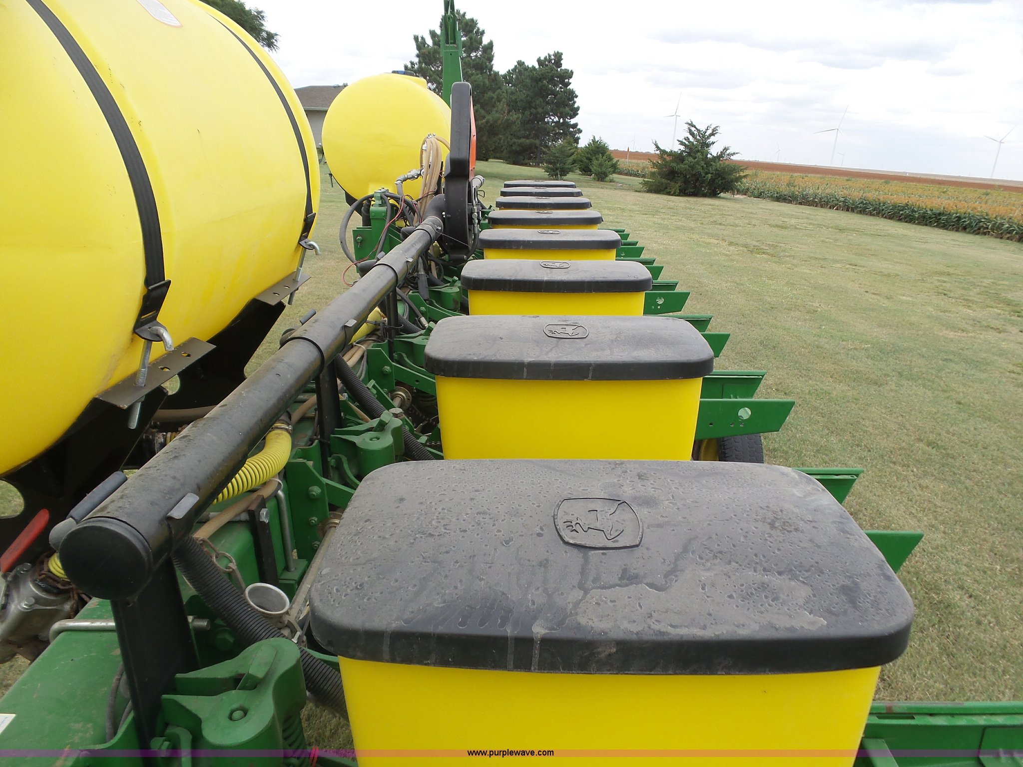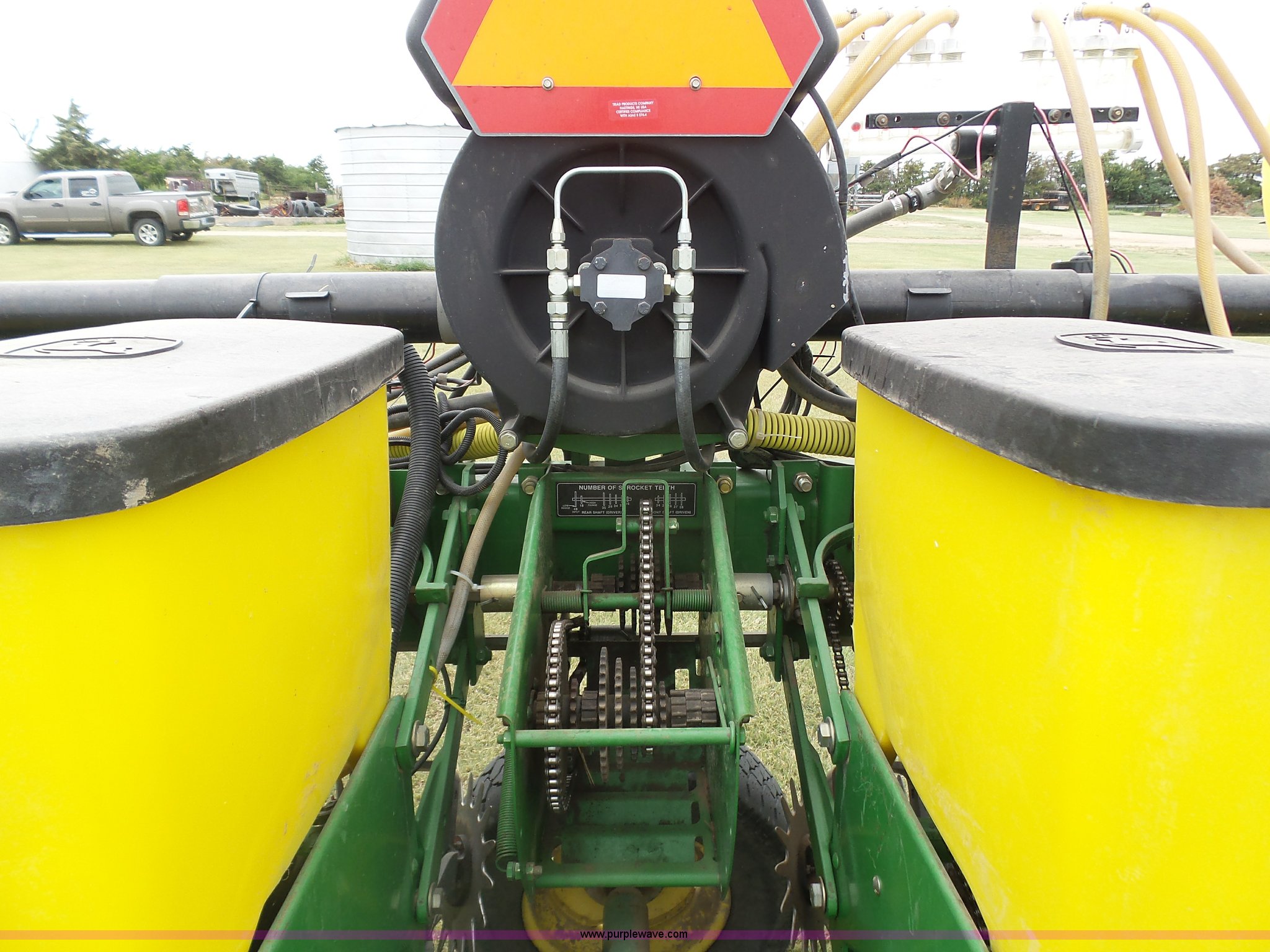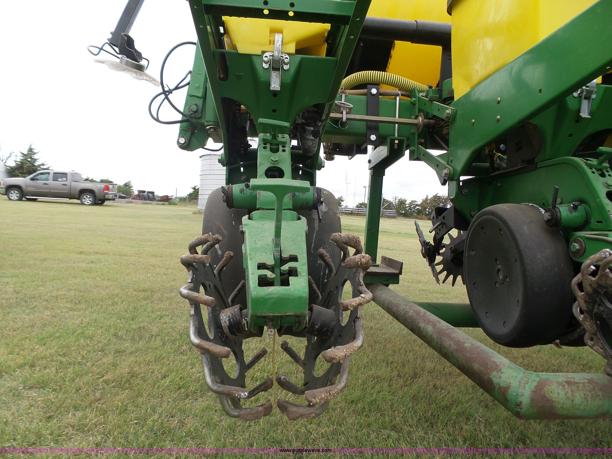 Purple Wave is selling a used Planter in Kansas. This item is a 1998 John Deere 1700 Max Emerge Plus Vacumeter no-till planter with the following: 19'W, Eight rows, 30" row spacing, Hydraulic marker arms, Individual seed hoppers, Vacuum metering, Ground meter drive, Double disk openers, Double gauge wheels, Double spiked closing system, (2) 150 gallon liquid tanks, Coulter applicator, Shur-Flo 2088 electric diaphragm pump, 4 gpm, Red Ball monitors,, John Deere Computer Trak 250 monitor, (2) 7.60-15 drive/outside tires, Heavy residue no-till coulters, Chemical arms for rear of each row, Additional press wheels, Additional meters, Additional parts, Transport trailer, 23'L, Slab hitch, 235/75R15 tires, Stored inside, Serial H01700R670919
