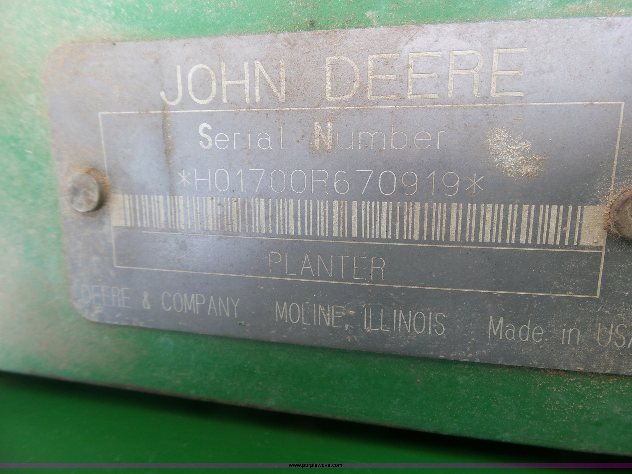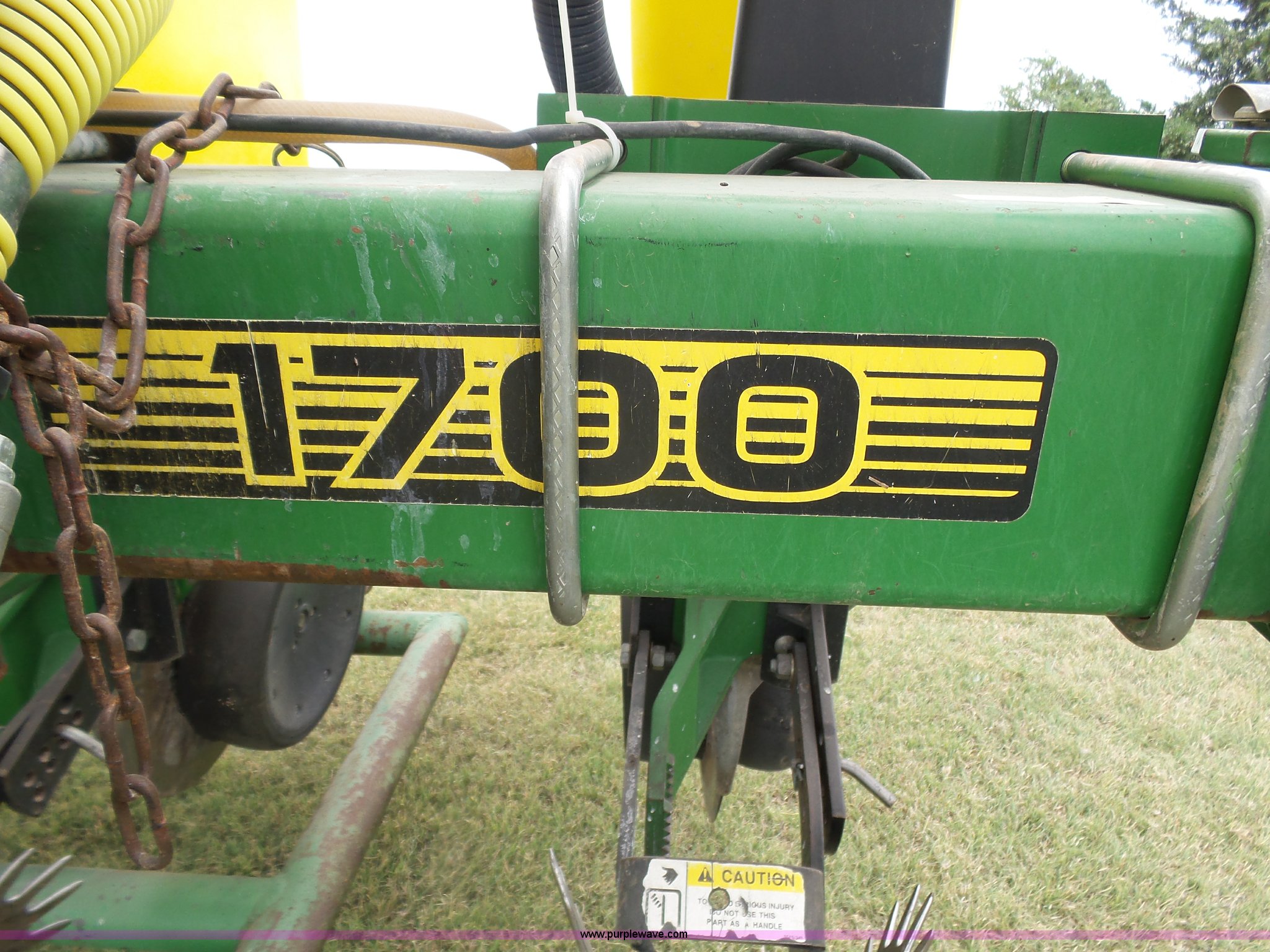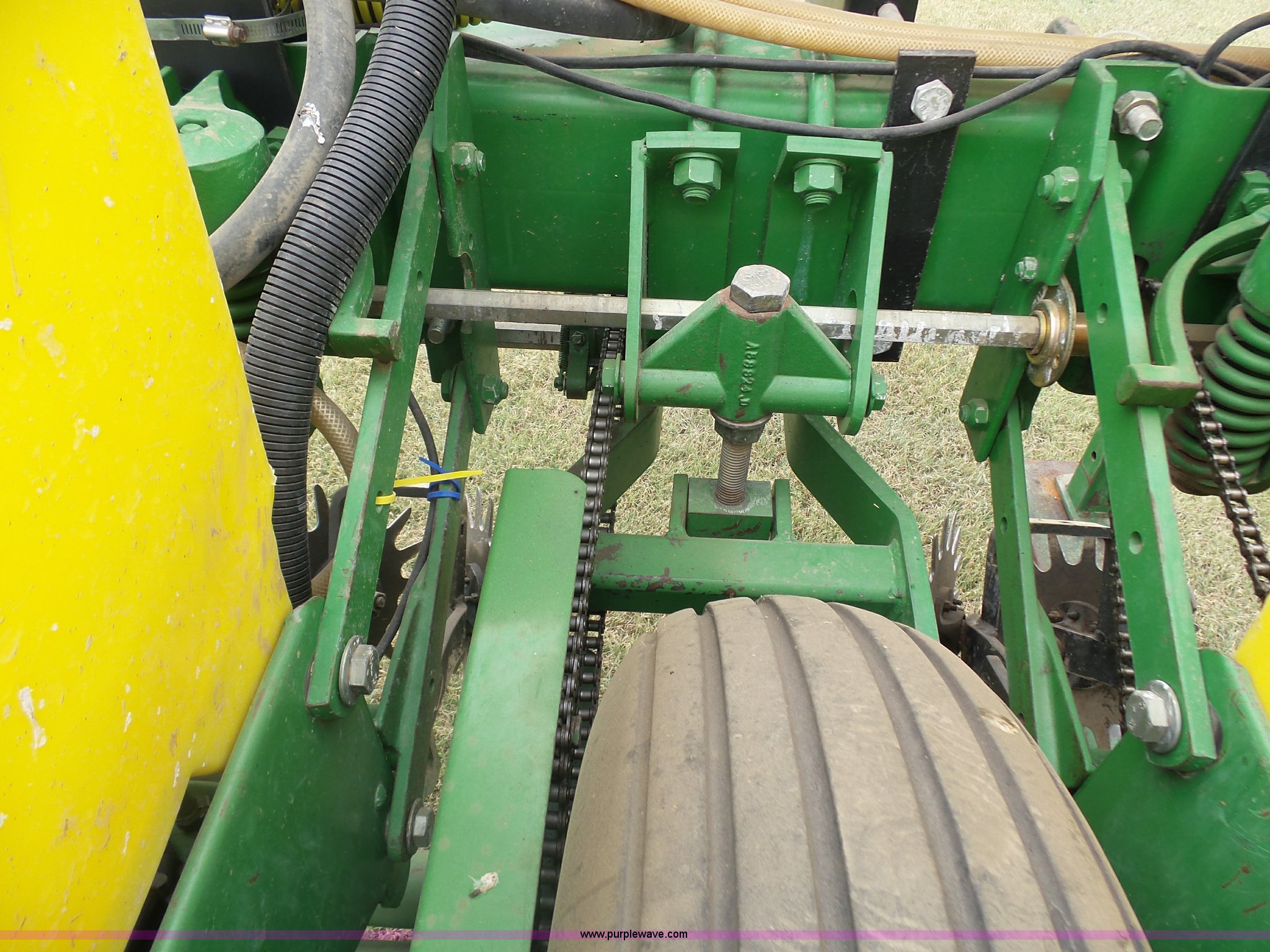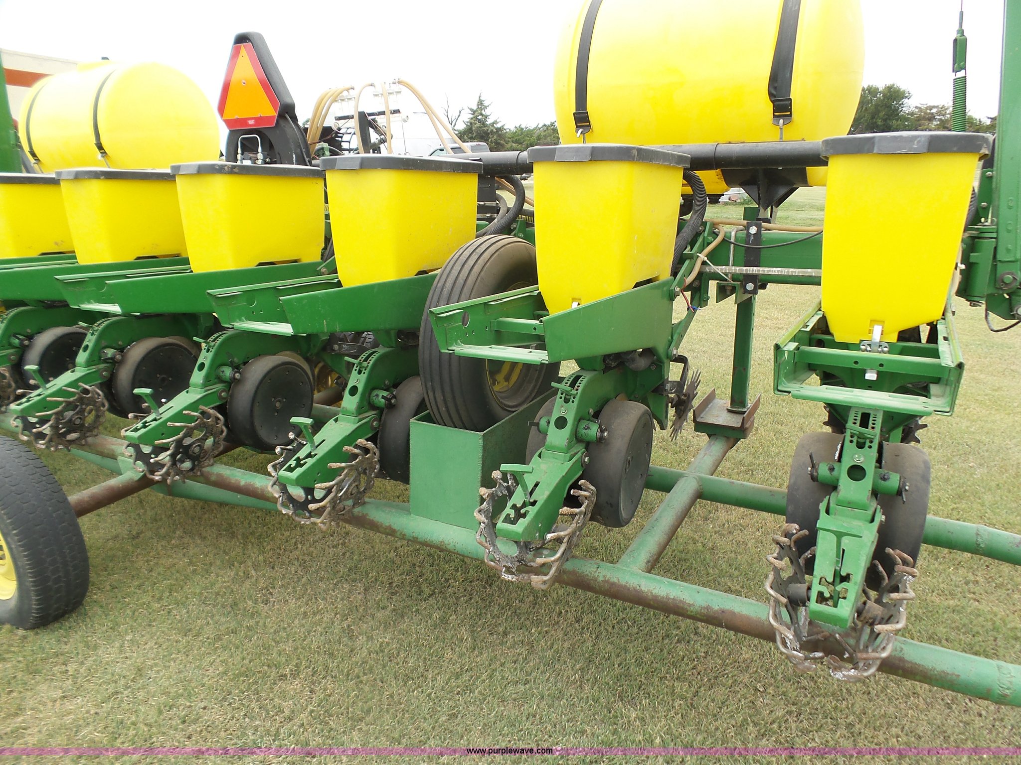 Purple Wave is selling a used Planter in Kansas. This item is a 1998 John Deere 1700 Max Emerge Plus Vacumeter no-till planter with the following: 19'W, Eight rows, 30" row spacing, Hydraulic marker arms, Individual seed hoppers, Vacuum metering, Ground meter drive, Double disk openers, Double gauge wheels, Double spiked closing system, (2) 150 gallon liquid tanks, Coulter applicator, Shur-Flo 2088 electric diaphragm pump, 4 gpm, Red Ball monitors,, John Deere Computer Trak 250 monitor, (2) 7.60-15 drive/outside tires, Heavy residue no-till coulters, Chemical arms for rear of each row, Additional press wheels, Additional meters, Additional parts, Transport trailer, 23'L, Slab hitch, 235/75R15 tires, Stored inside, Serial H01700R670919