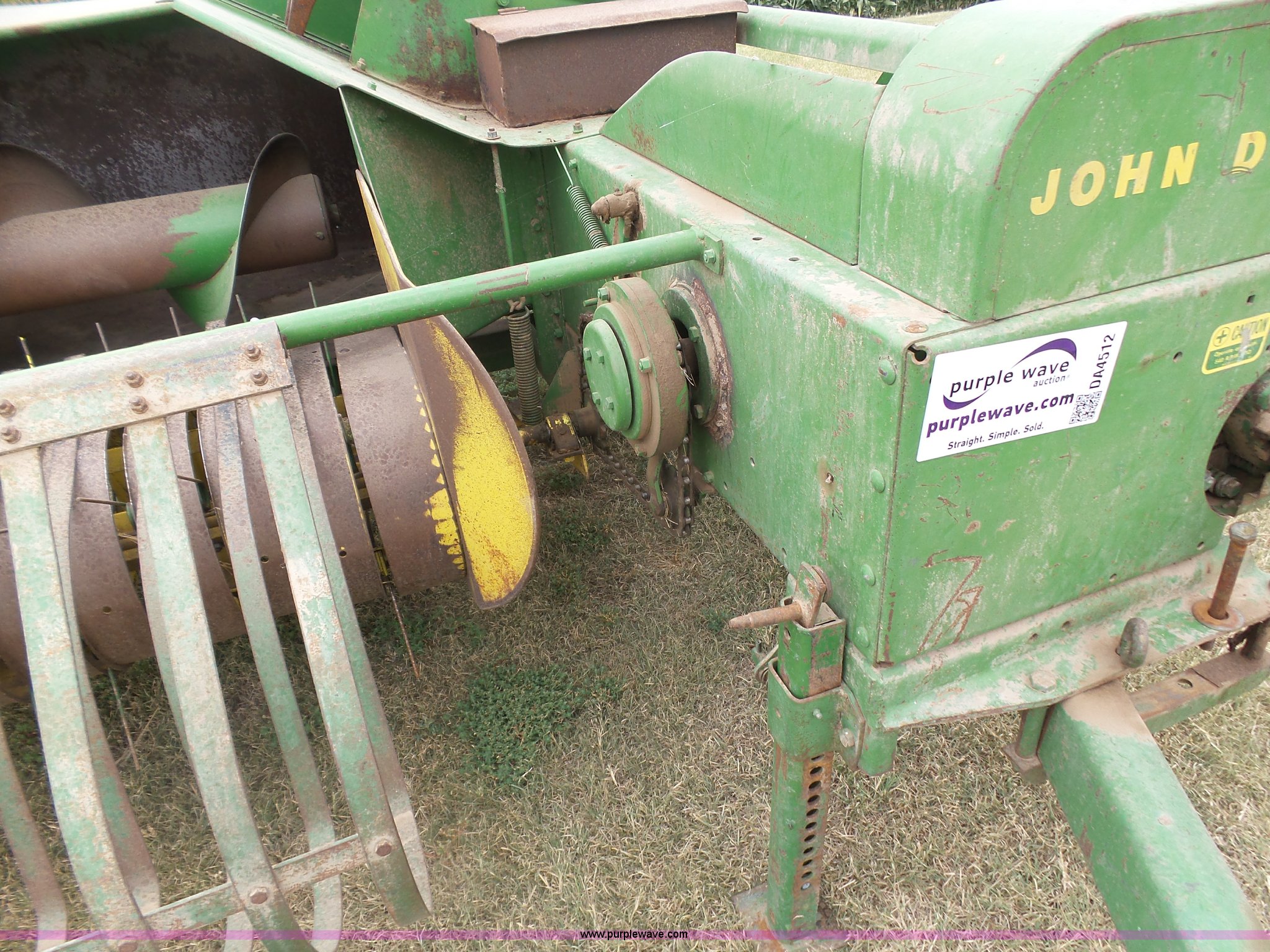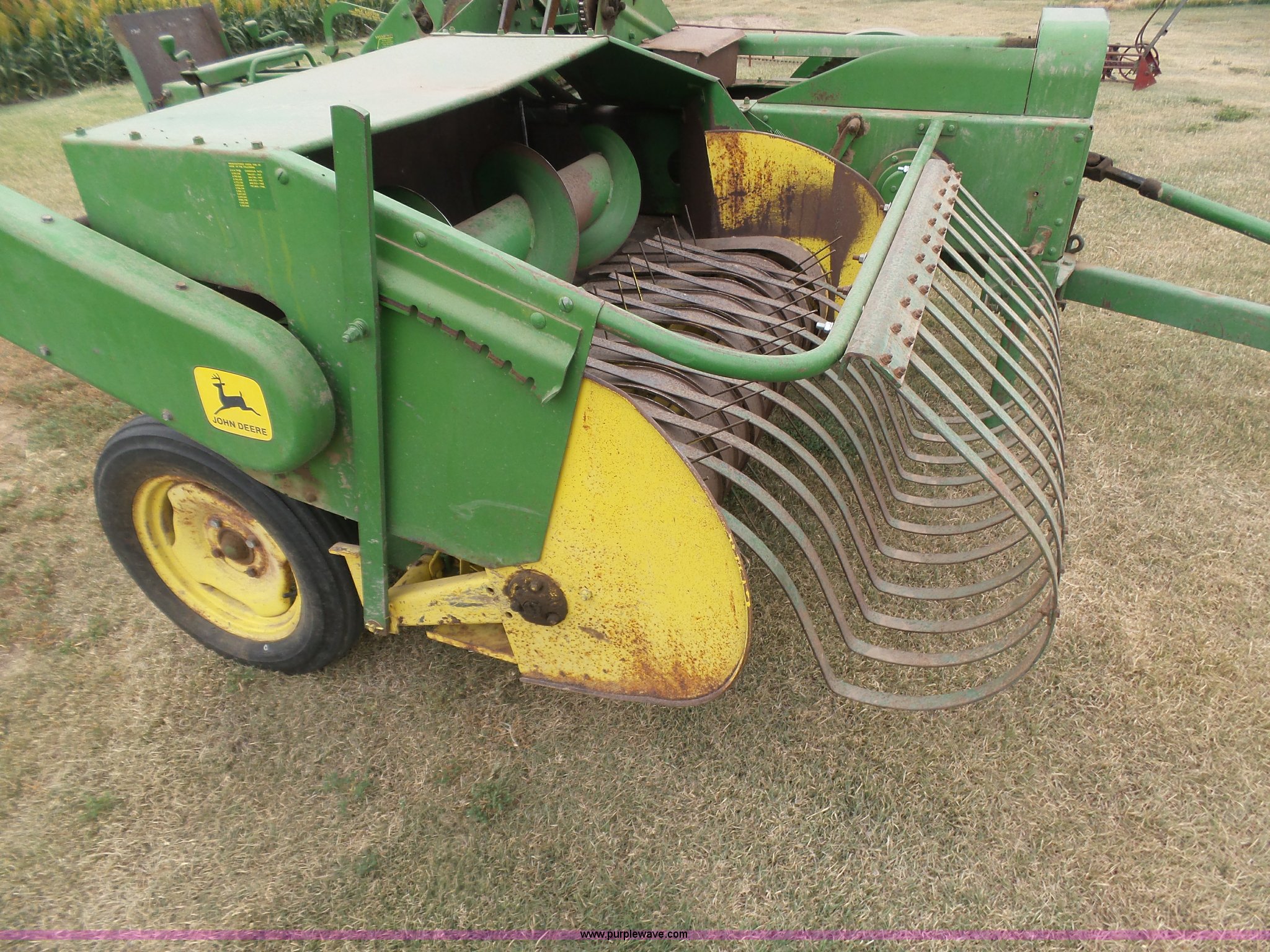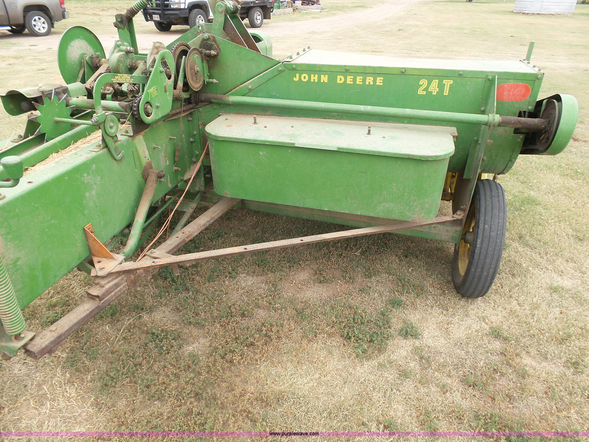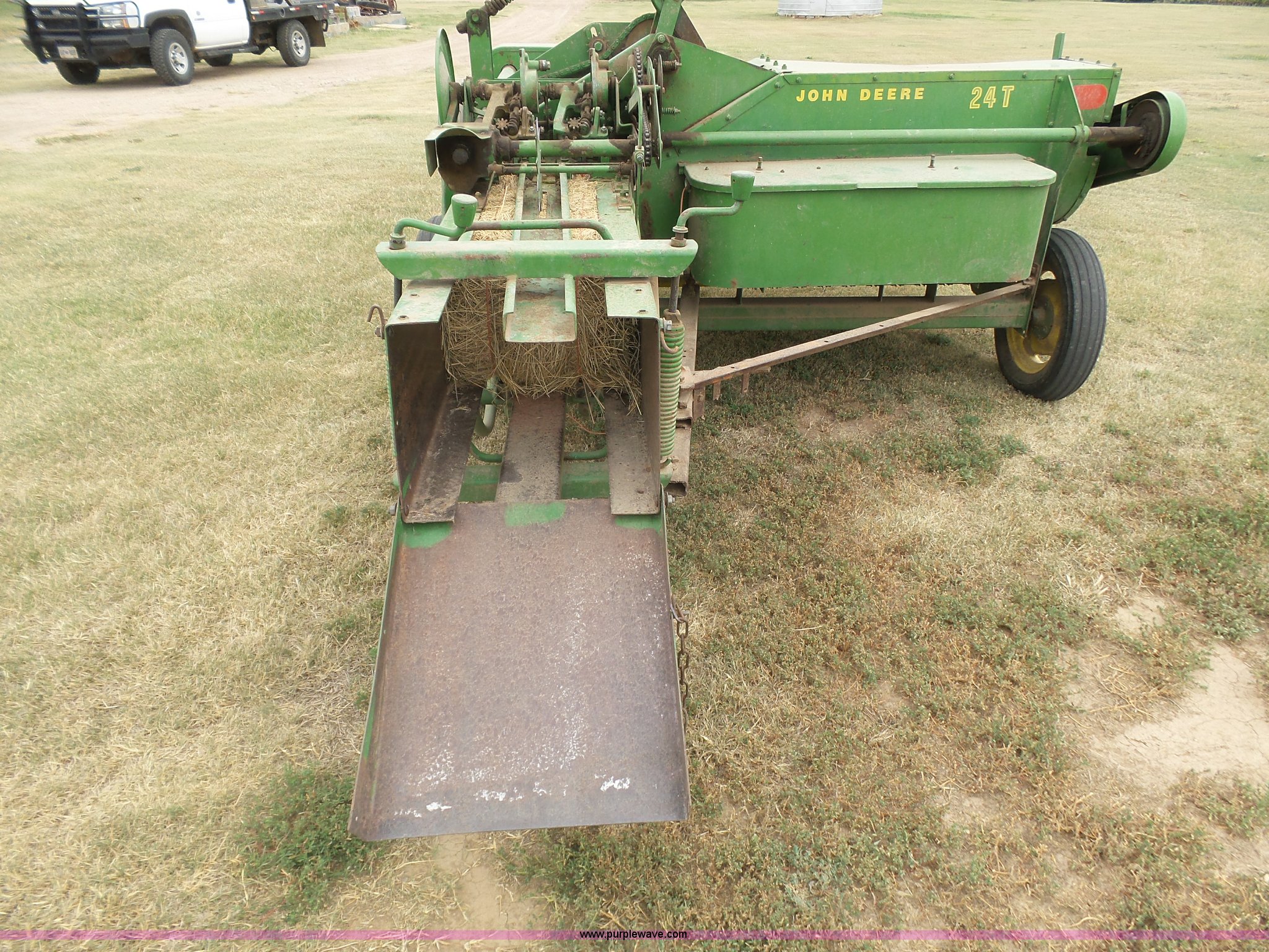 Purple Wave is selling a used Square Baler in Kansas. This item is a John Deere 24T small square baler with the following: 14" x 18" bale capacity, 52"W pickup, (2) knotters, Twine tie, Bale chute, 540 PTO, Pin hitch, 6.70-15 left side tire, 5.00-15 right side tire, Type E0024, Operator's manual, Stored inside, Serial 056144E