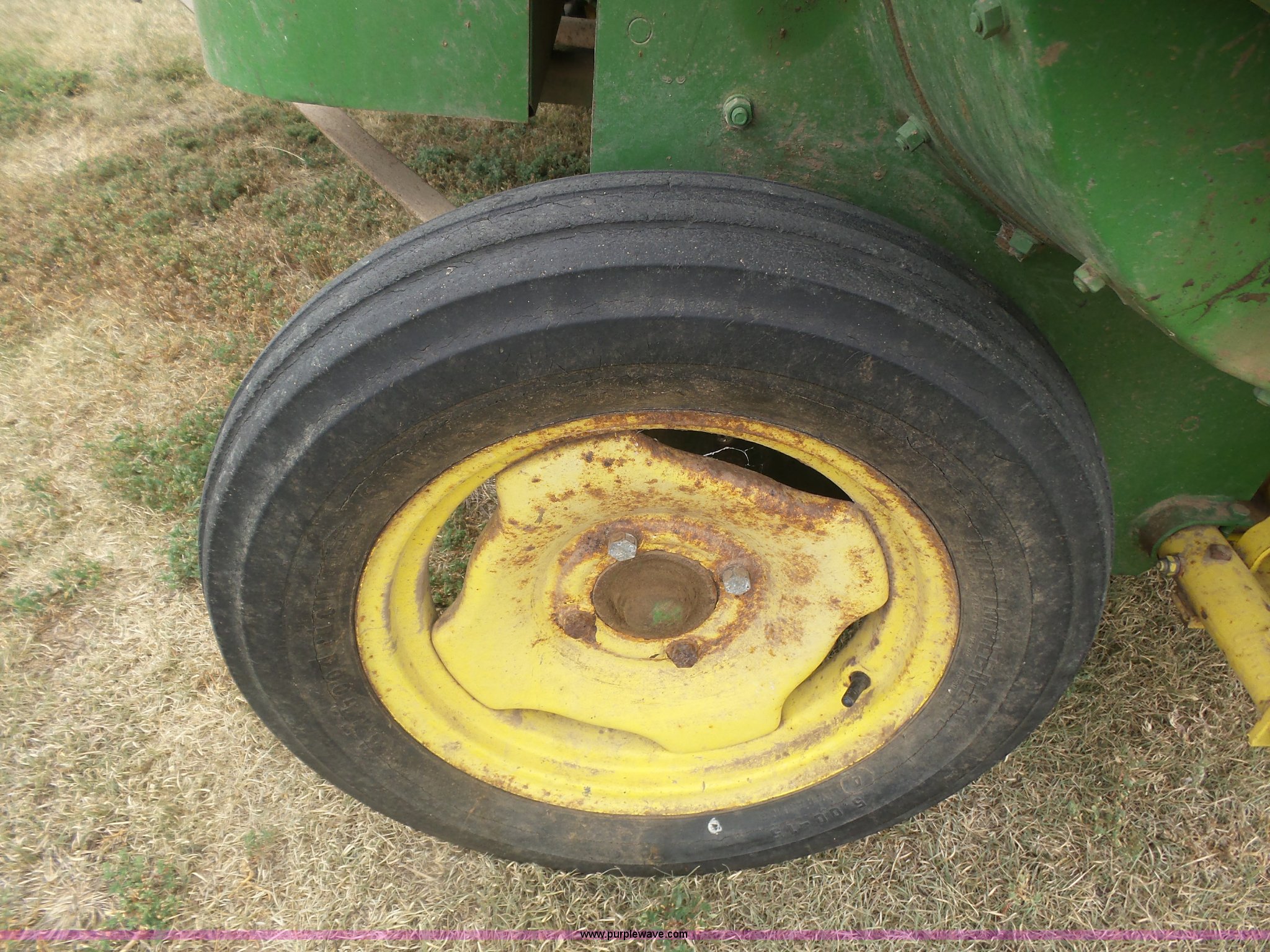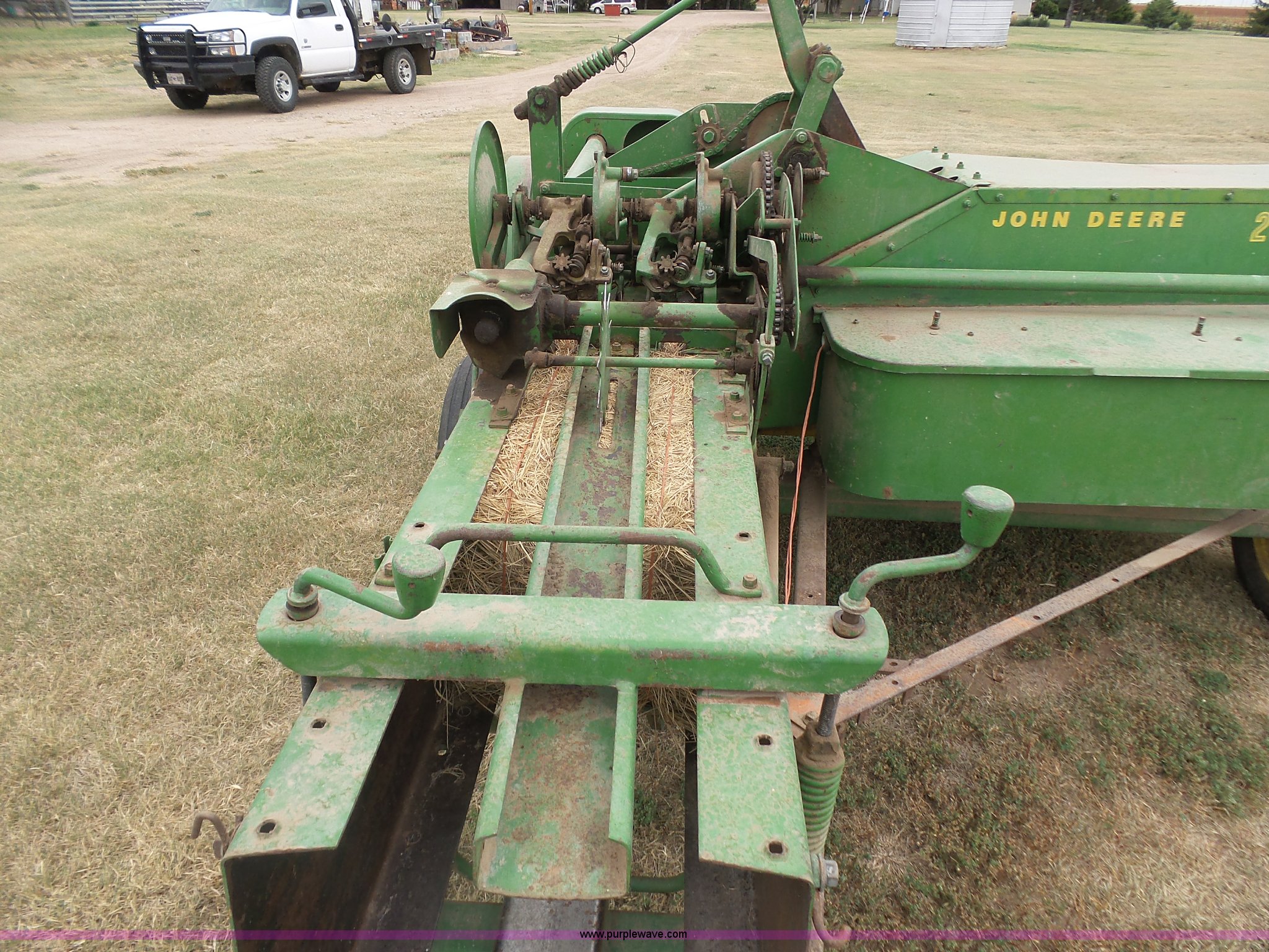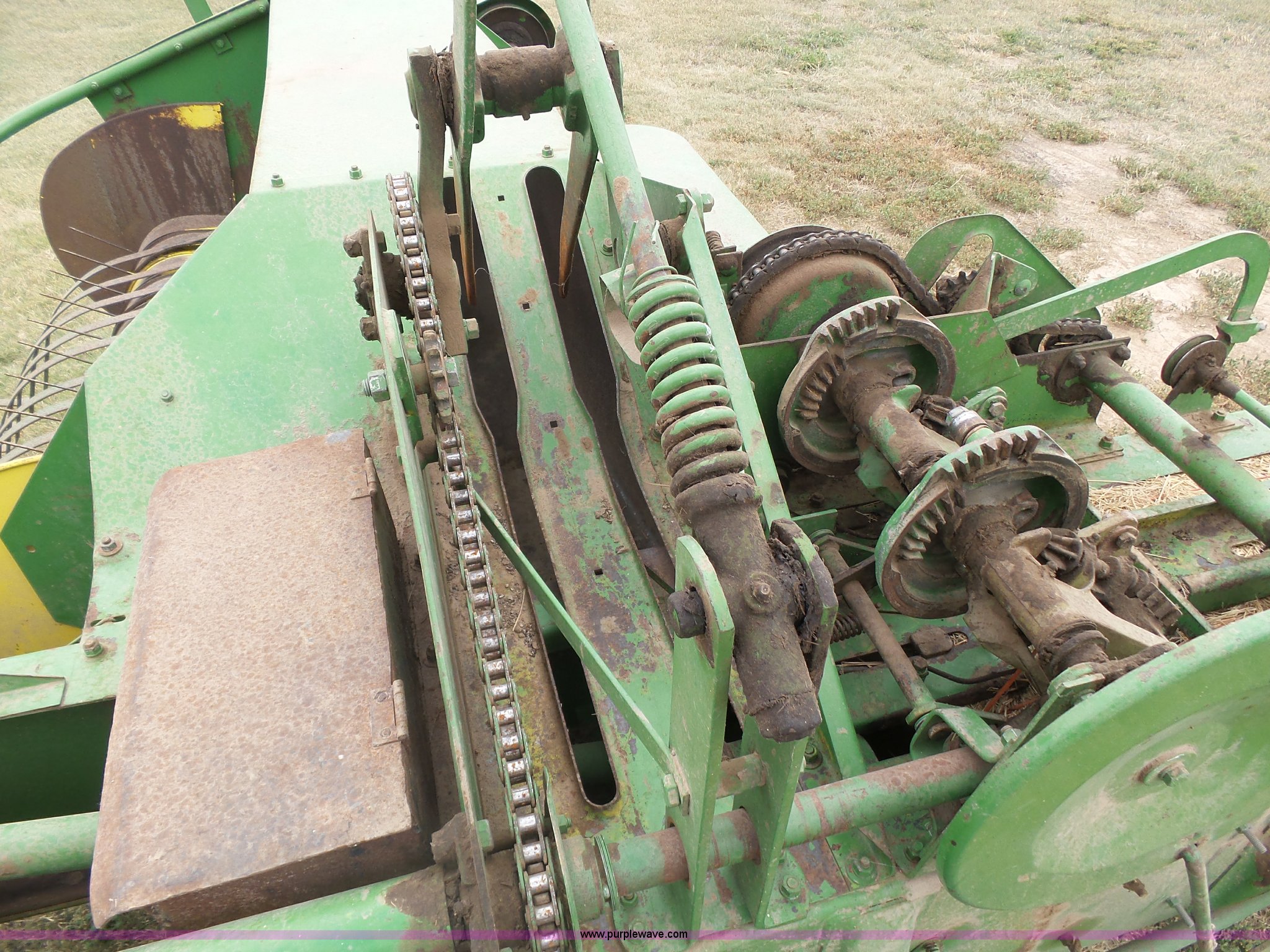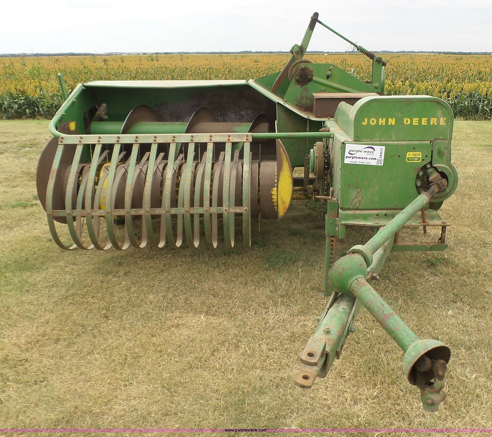 Purple Wave is selling a used Square Baler in Kansas. This item is a John Deere 24T small square baler with the following: 14" x 18" bale capacity, 52"W pickup, (2) knotters, Twine tie, Bale chute, 540 PTO, Pin hitch, 6.70-15 left side tire, 5.00-15 right side tire, Type E0024, Operator's manual, Stored inside, Serial 056144E