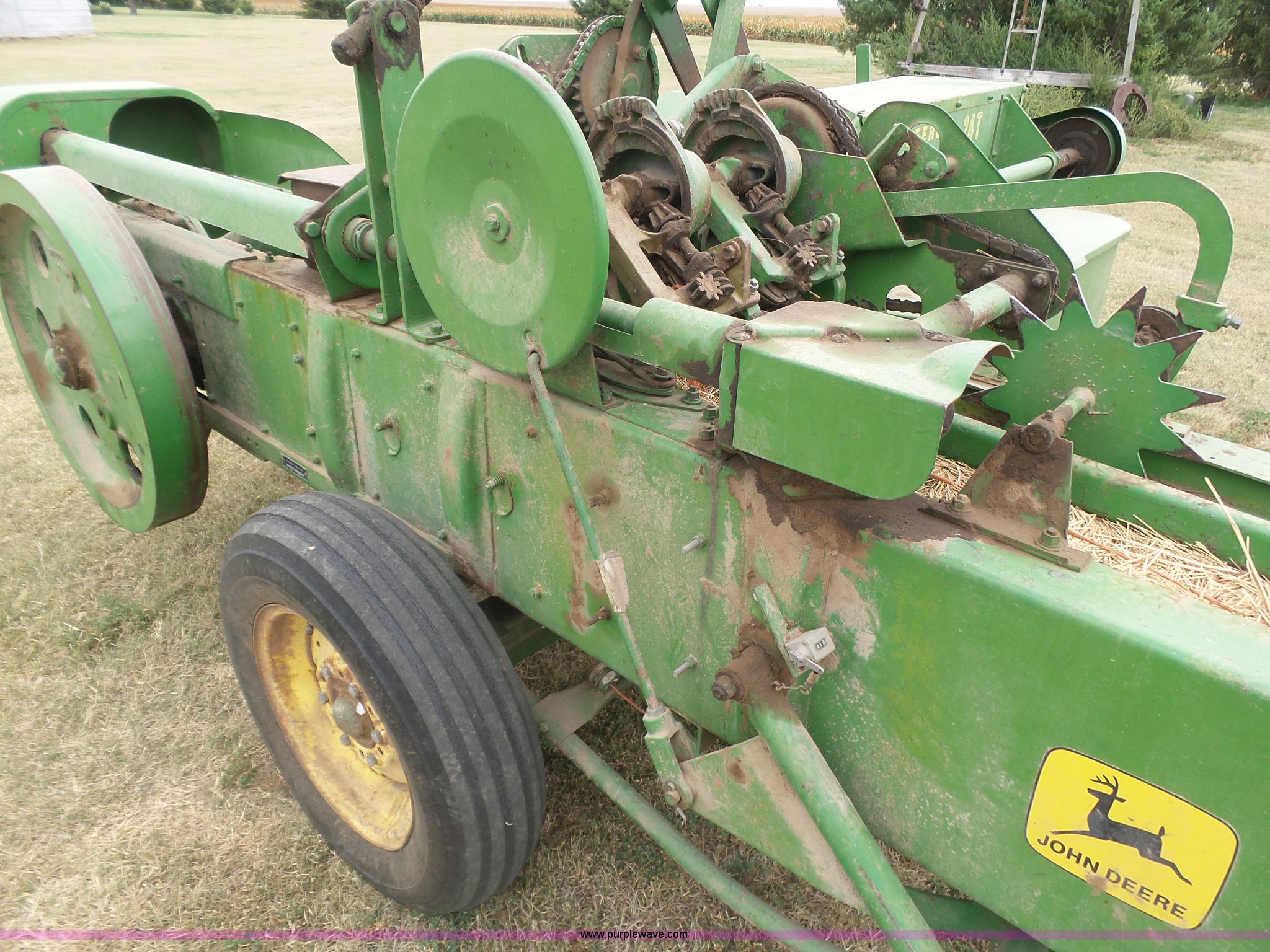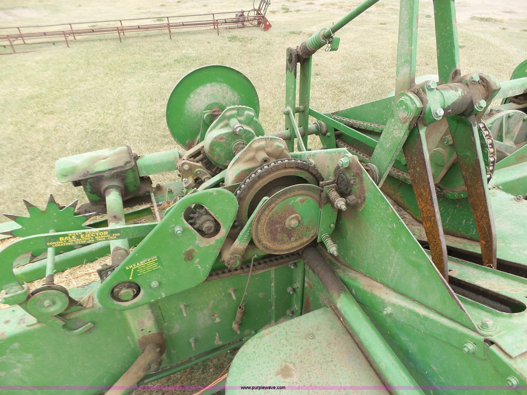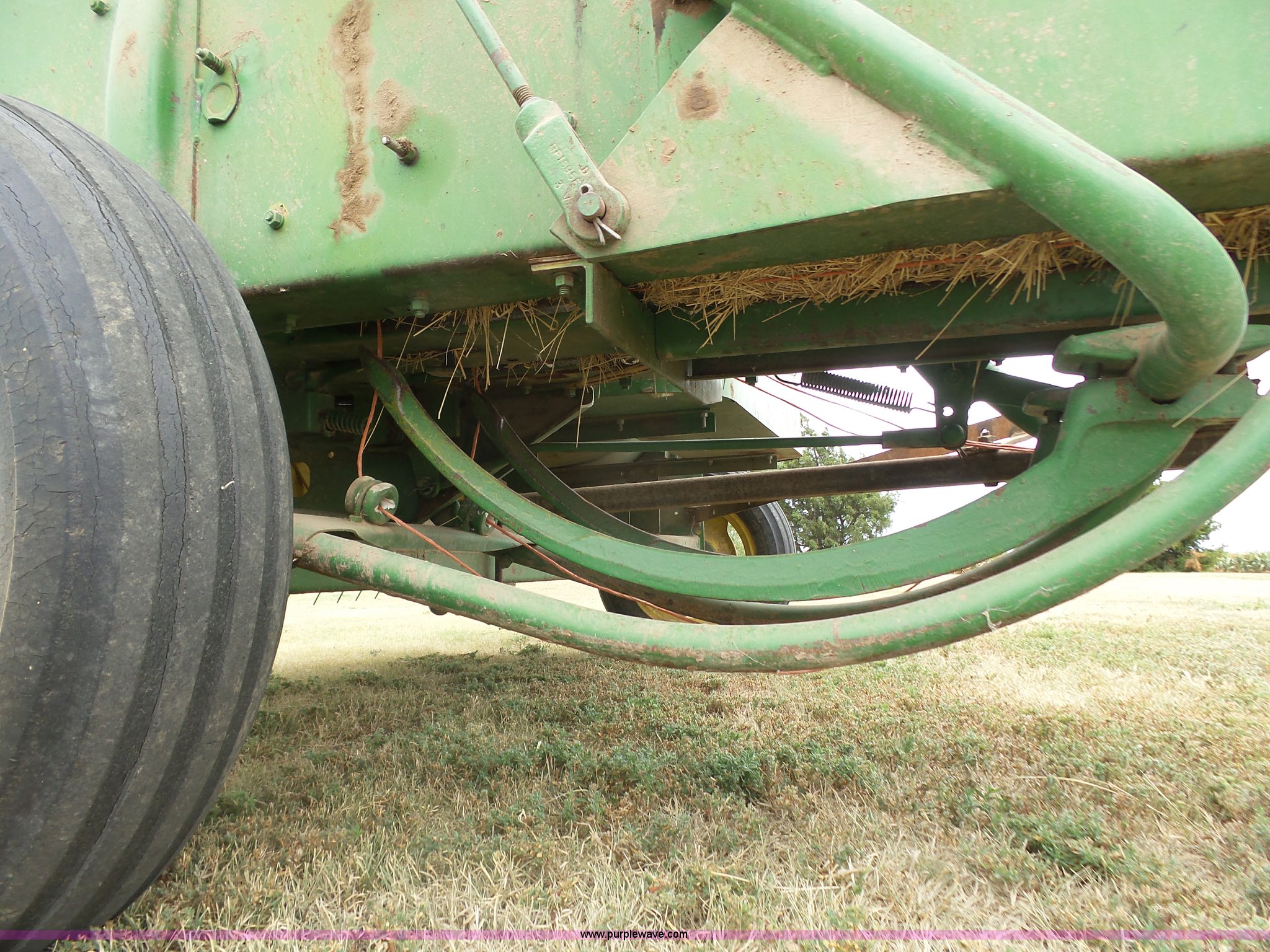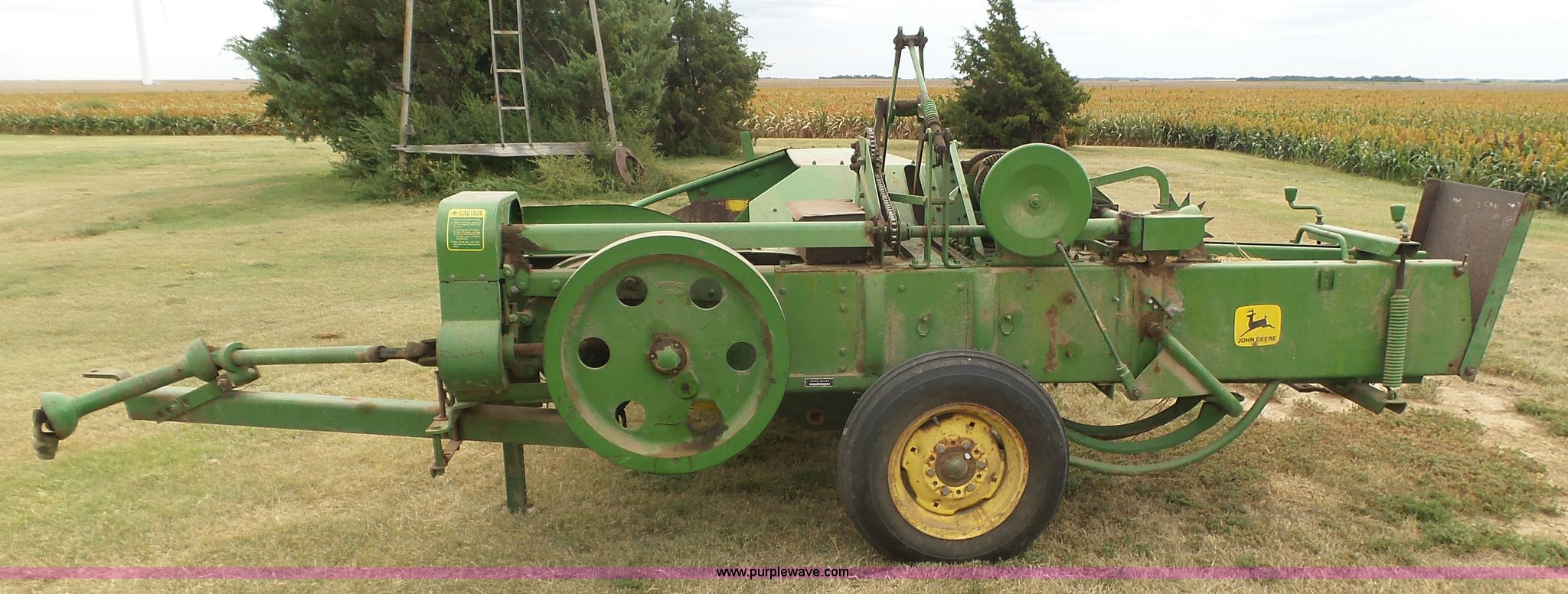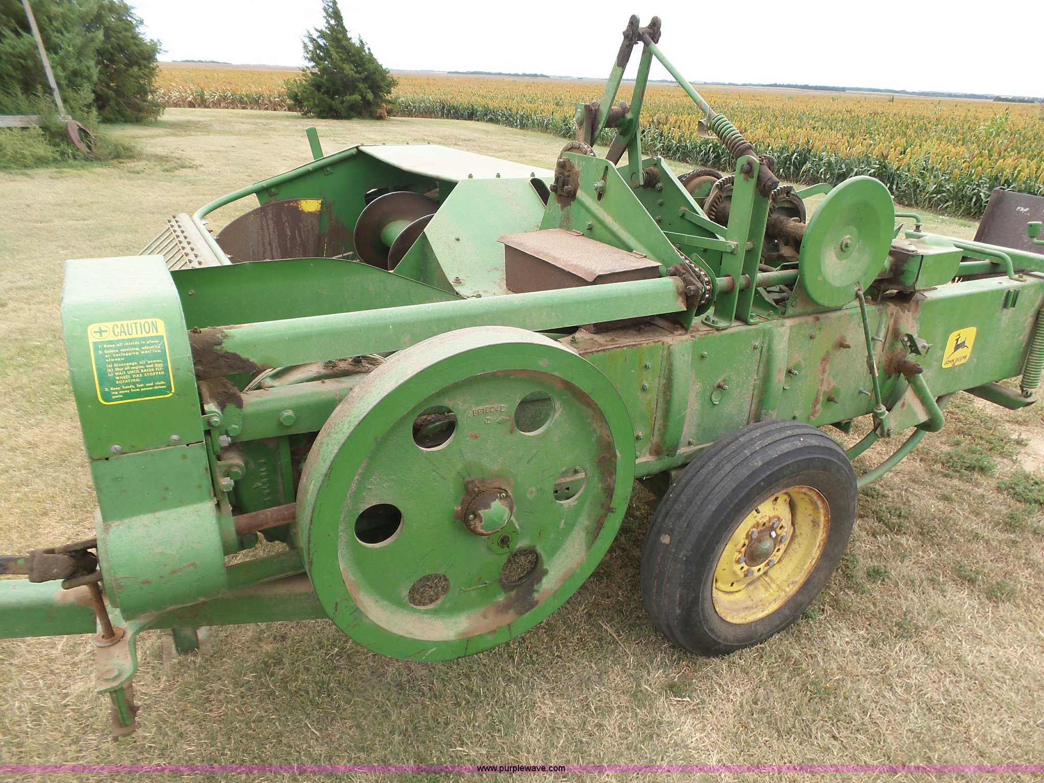 Purple Wave is selling a used Square Baler in Kansas. This item is a John Deere 24T small square baler with the following: 14" x 18" bale capacity, 52"W pickup, (2) knotters, Twine tie, Bale chute, 540 PTO, Pin hitch, 6.70-15 left side tire, 5.00-15 right side tire, Type E0024, Operator's manual, Stored inside, Serial 056144E