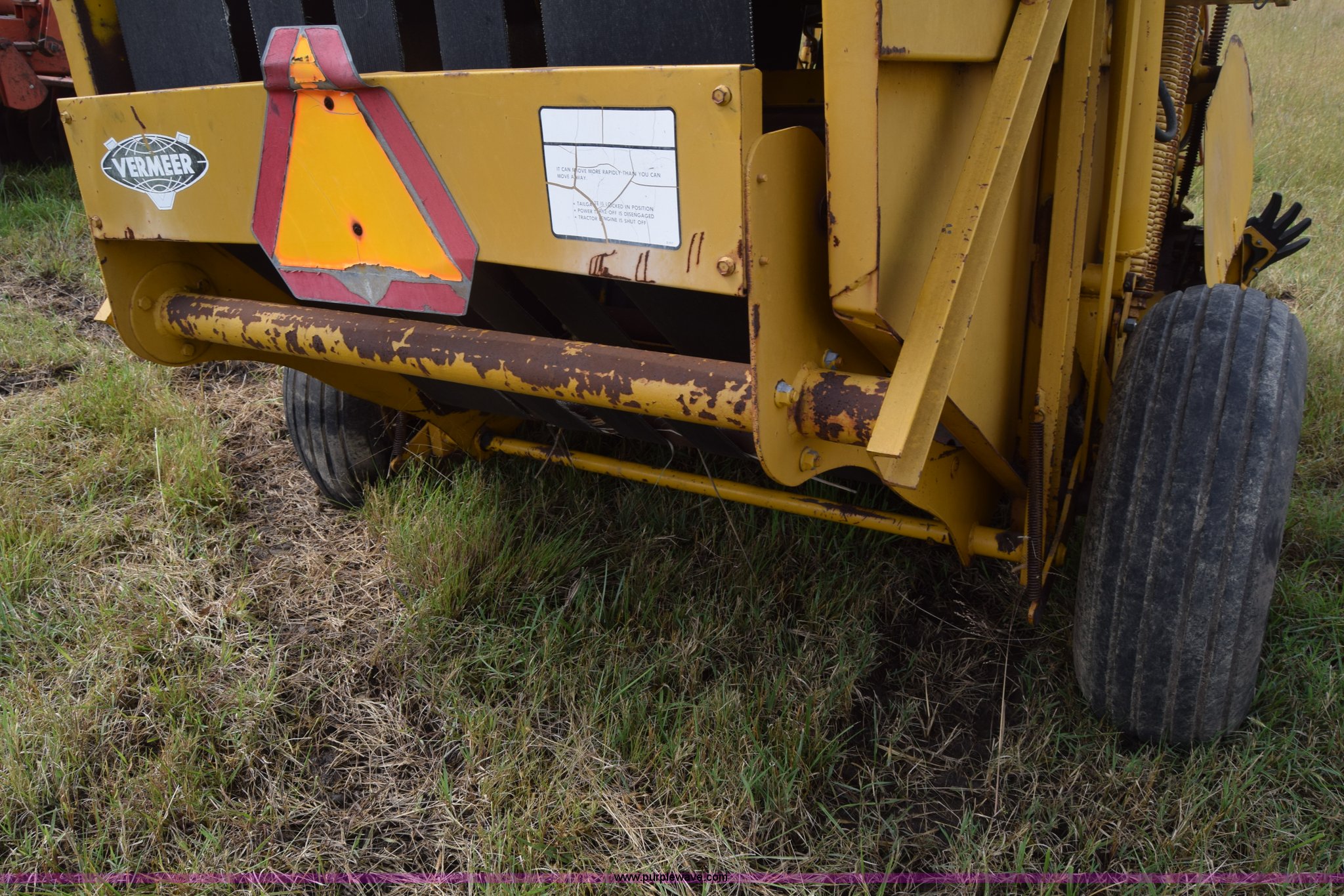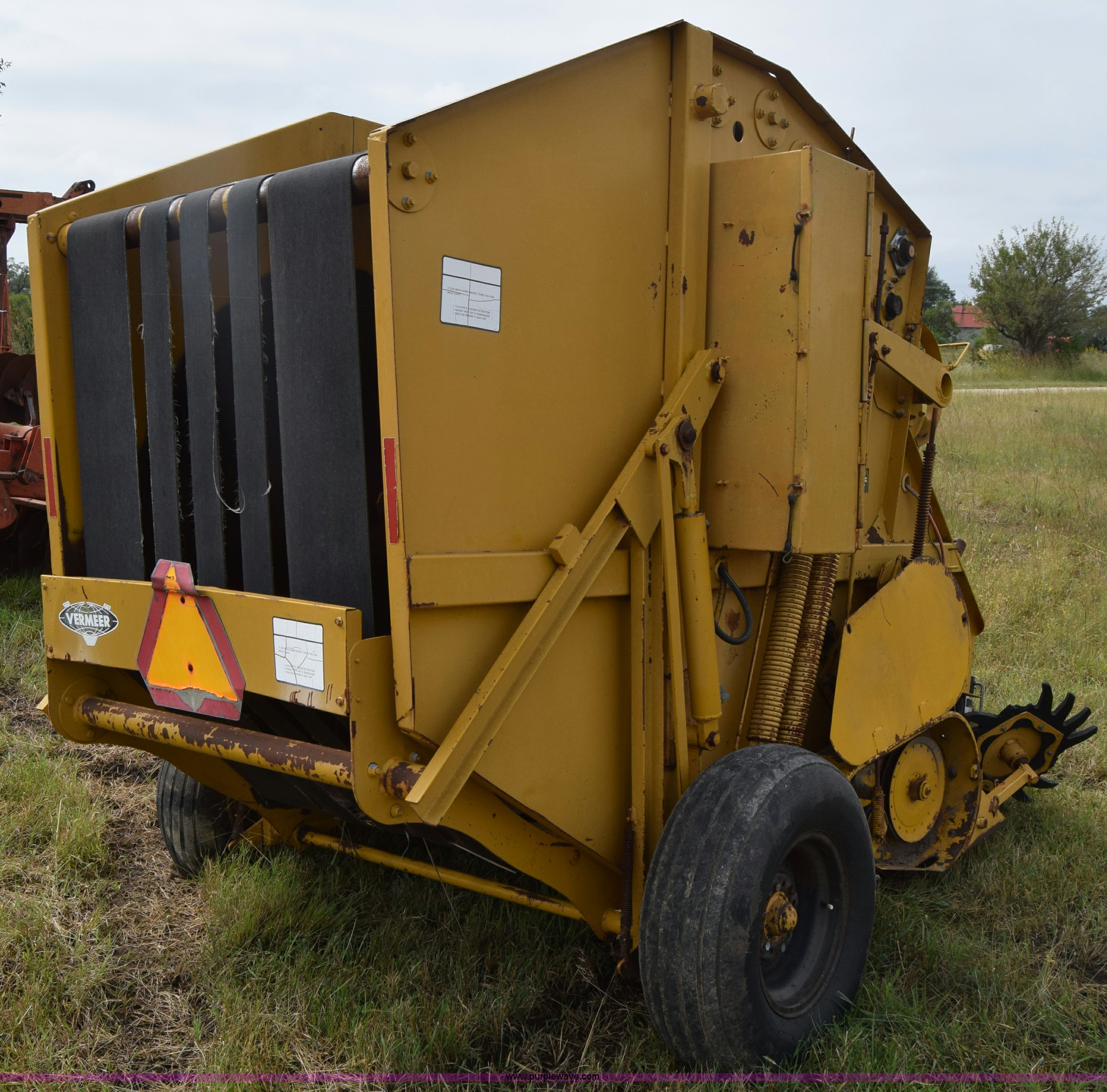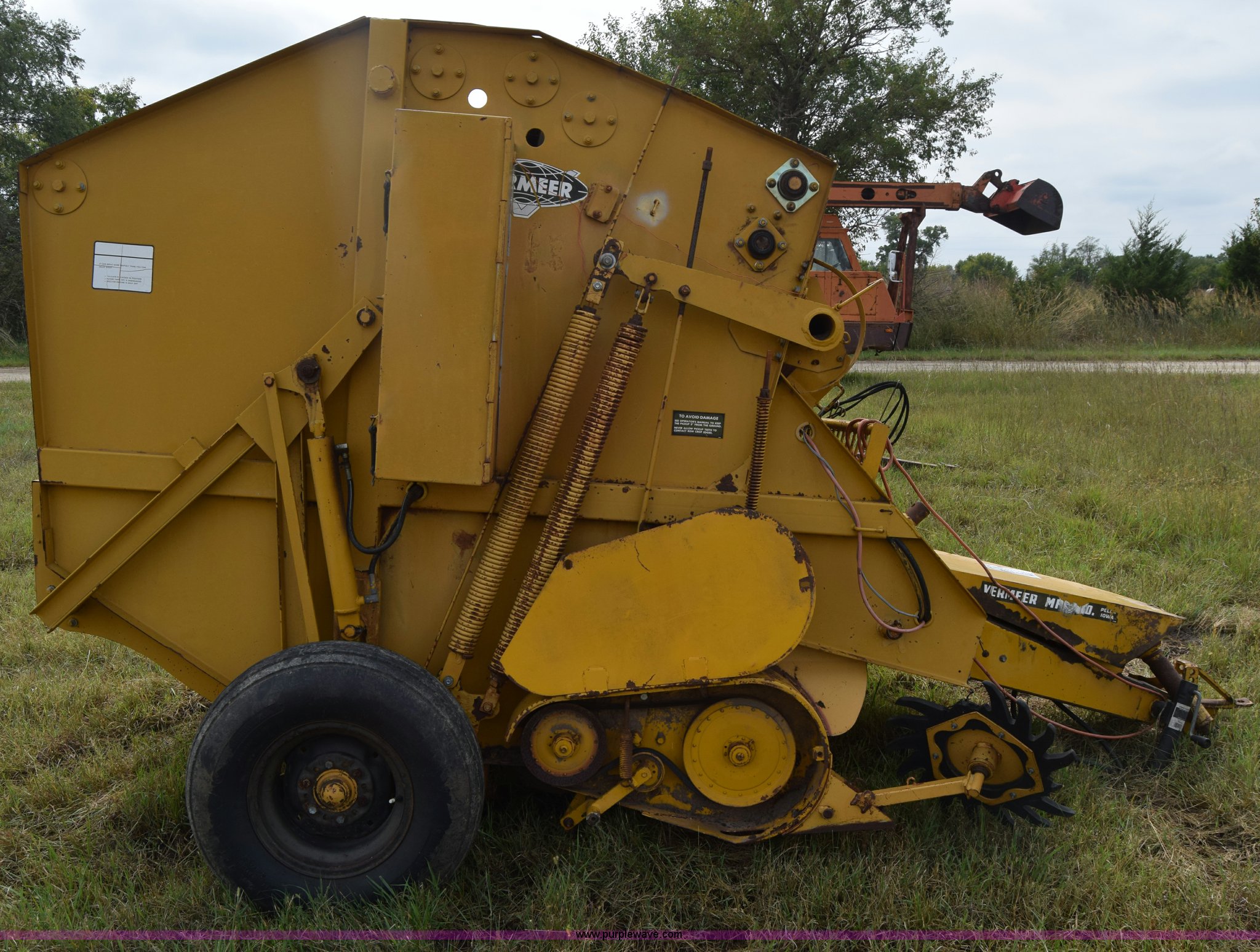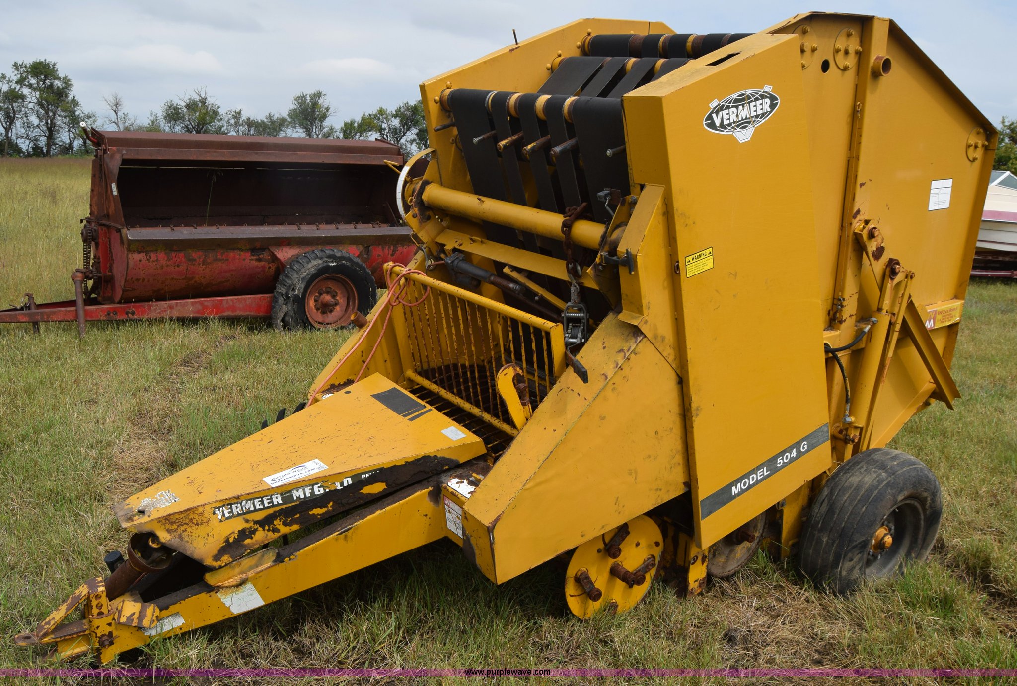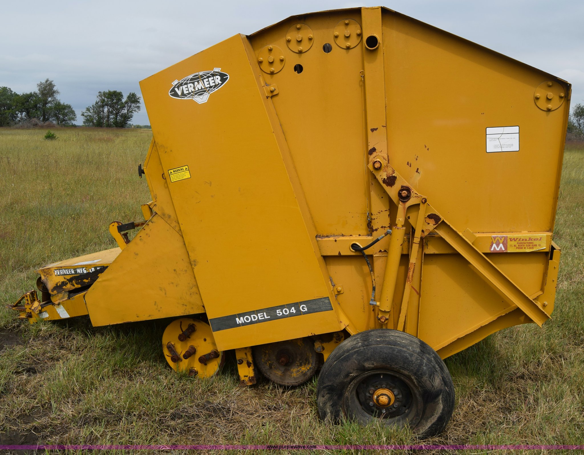Purple Wave is selling a used Round Baler in Kansas. This item is a 1980 Vermeer 504G round baler with the following: 4'W pickup, Gathering wheels, Twine tie, Pin hitch, 11-15 tires, Tires may need to be replaced, PTO shaft parts missing, Unknown operating condition, Serial 499