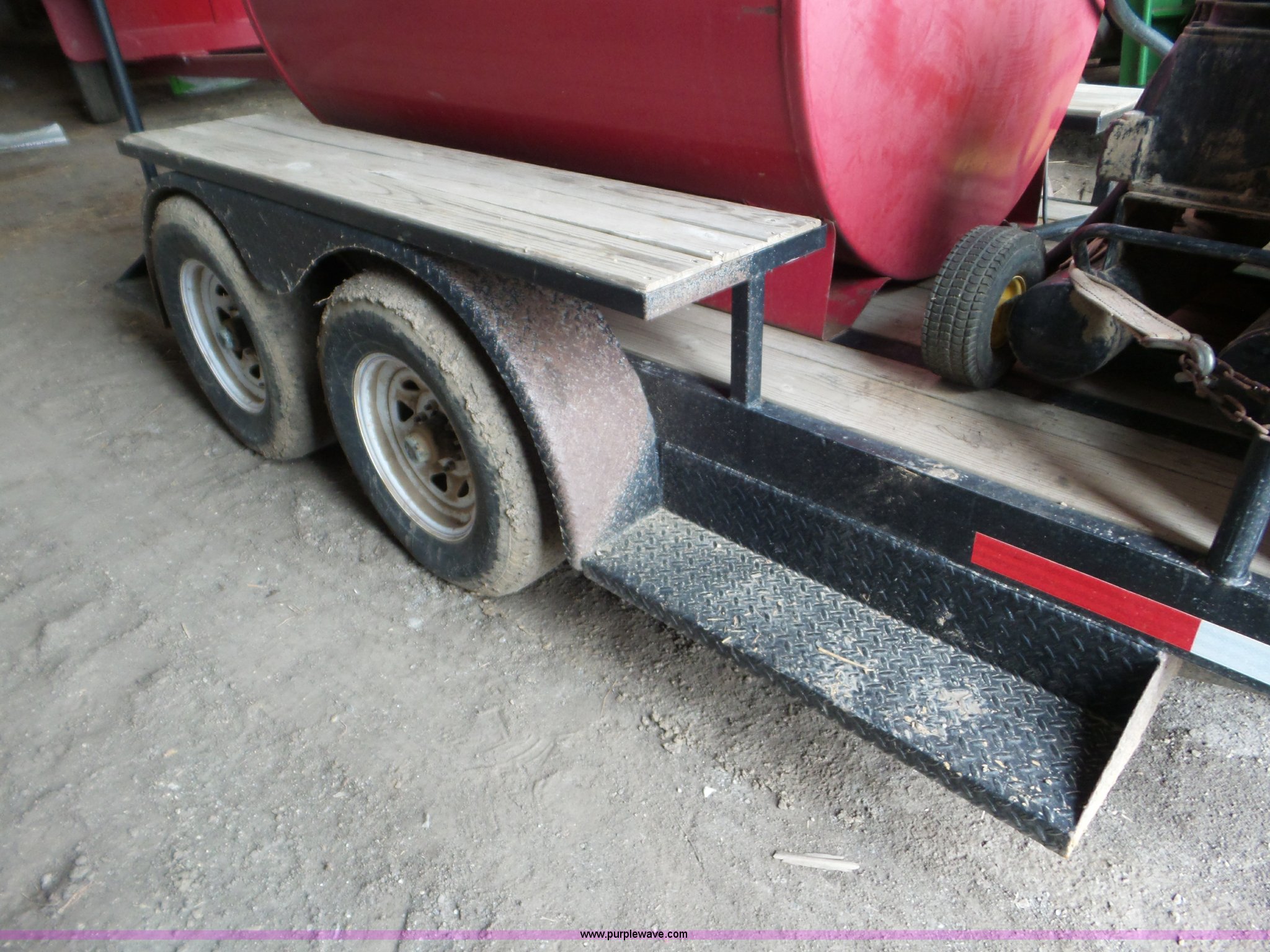 Purple Wave is selling a used Tank Trailer in Kansas. This item is a 2010 shop built fuel trailer with the following: 12'L x 77"W, Wood deck, 500 gallon fuel tank, Pump, Toolbox, John Deere AC2-8GS air compressor, Subaru 9 HP engine, Eight gallon capacity, Pintle hitch, Manual jack, Jack will be straightened prior to auction, 225/75R15 tires