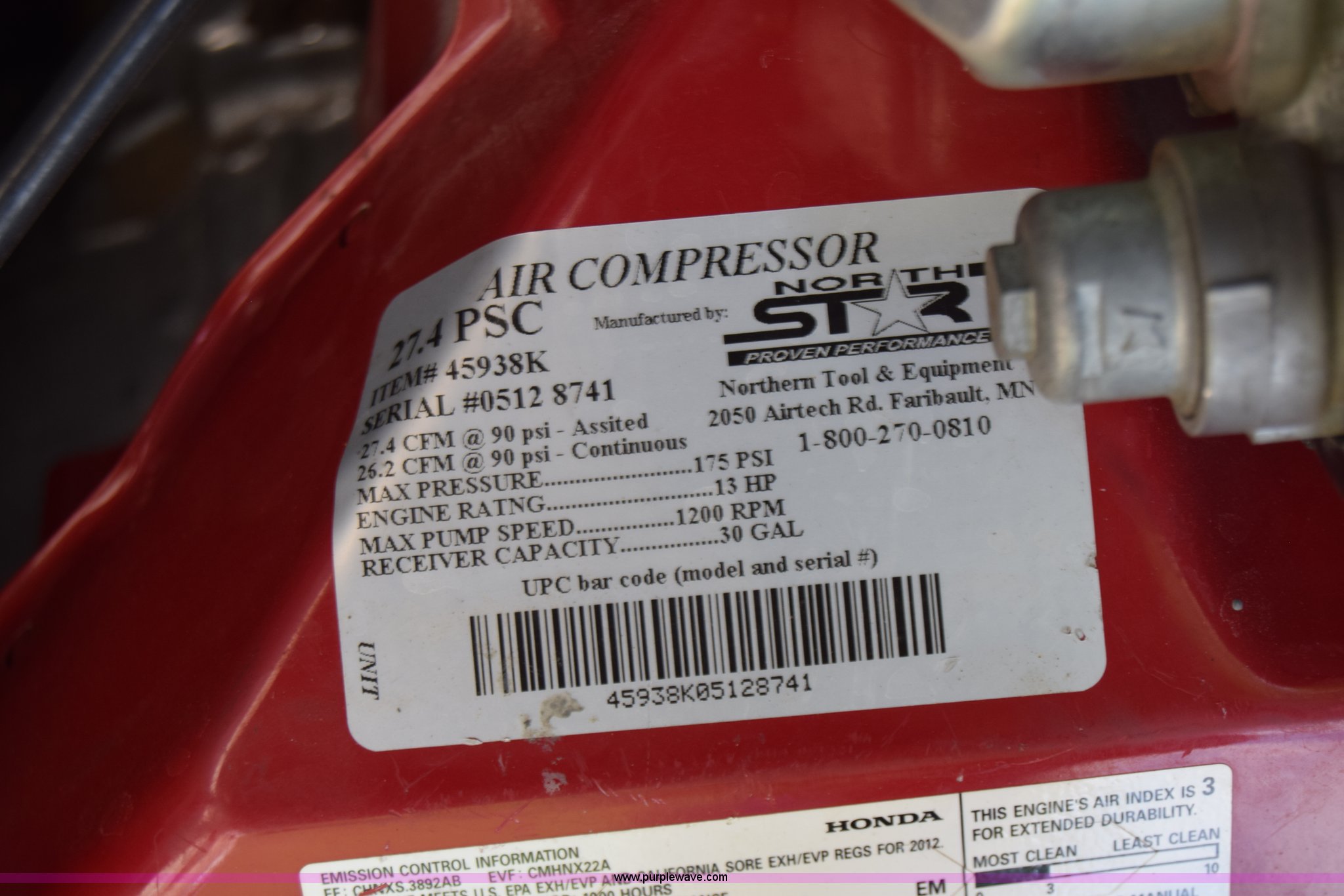 Purple Wave is selling a used Air Compressor in Kansas. This item is a North Star air compressor with the following: Honda GX390 gas engine, Electric start, 30 gallon tank, Battery not included