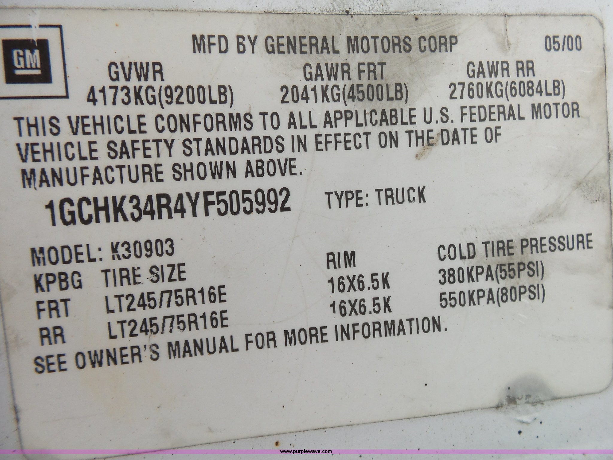 Purple Wave is selling a used 3/4 or 1 Ton Pickup or Van in Missouri. This item is a 2000 Chevrolet 3500 pickup truck with the following: 154,591 miles on odometer, 5.7L V8 OHV 16V gas engine, Automatic transmission, Four wheel drive, AC and heat, AM/FM/cassette, Manual windows and locks, Cloth interior, Receiver hitch, 245/75R16 tires, Hood damage, Passenger side front fender damage, Front bumper damage, ABS light on