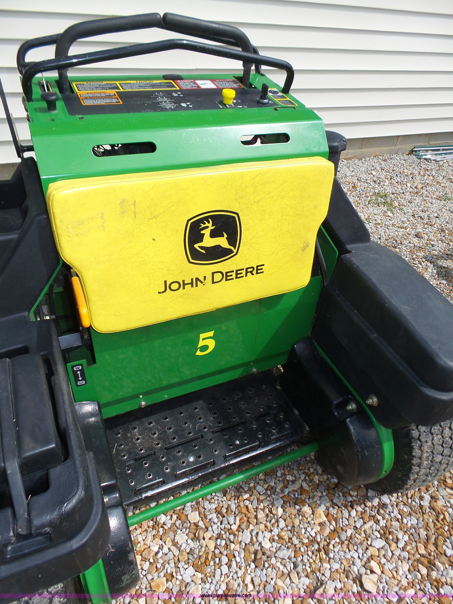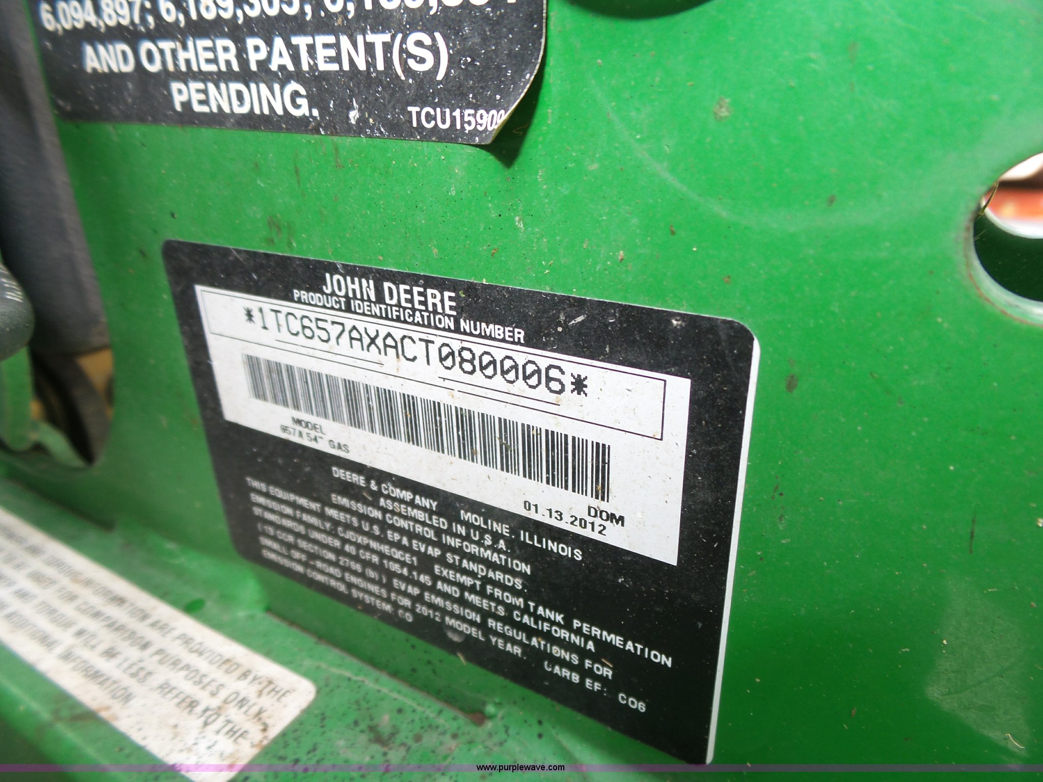 Purple Wave is selling a used Commercial Turf Mower in Nebraska. This item is a 2012 John Deere 657A Quik Trak Pro lawn mower with the following: 561 hours on meter, 54" deck, John Deere V-twin OHV gas engine, 22 HP, Serial FX691VA19694, Parking brake, Seven Iron Pro deck, 13x5.00-6 front swivel tires, 20x10.00-10 drive tires, Serial 1TC657AXACT080006, Unit# 5
