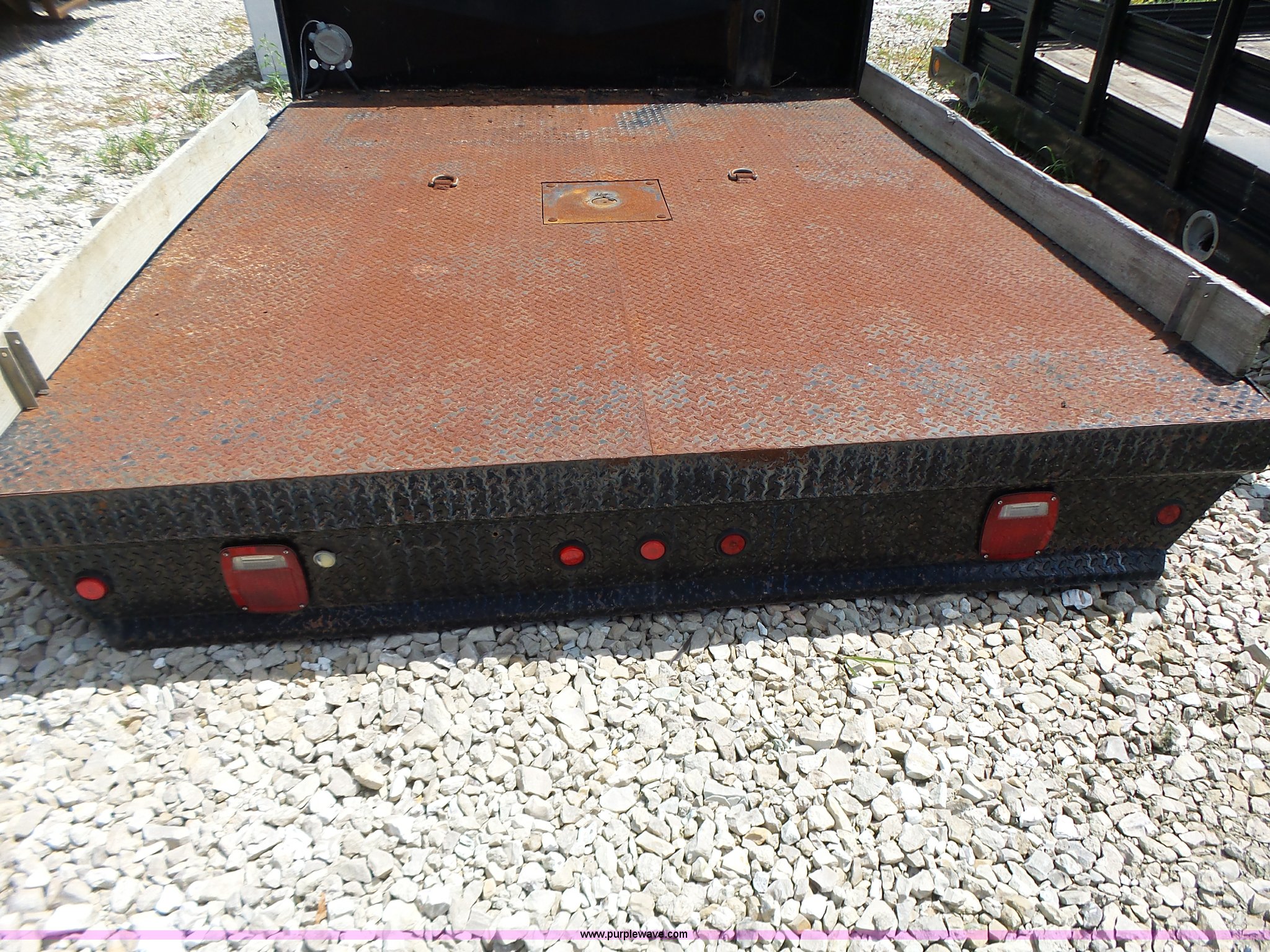 9'L x 92"W flatbed. Stake pockets, Ref. no. TRADFB. Knapheide Truck Equipment. 6603 Business 50 West. Jefferson City, MO 65109