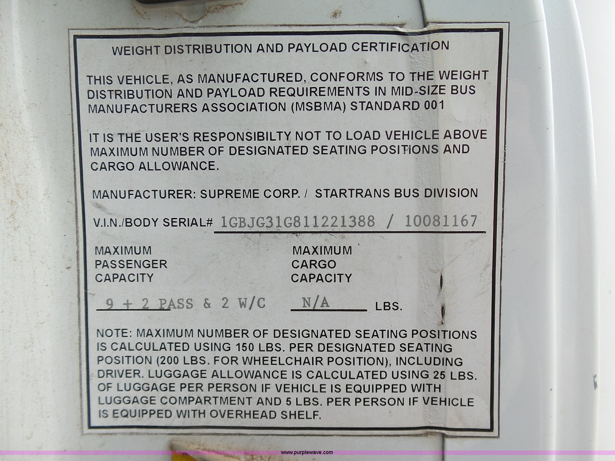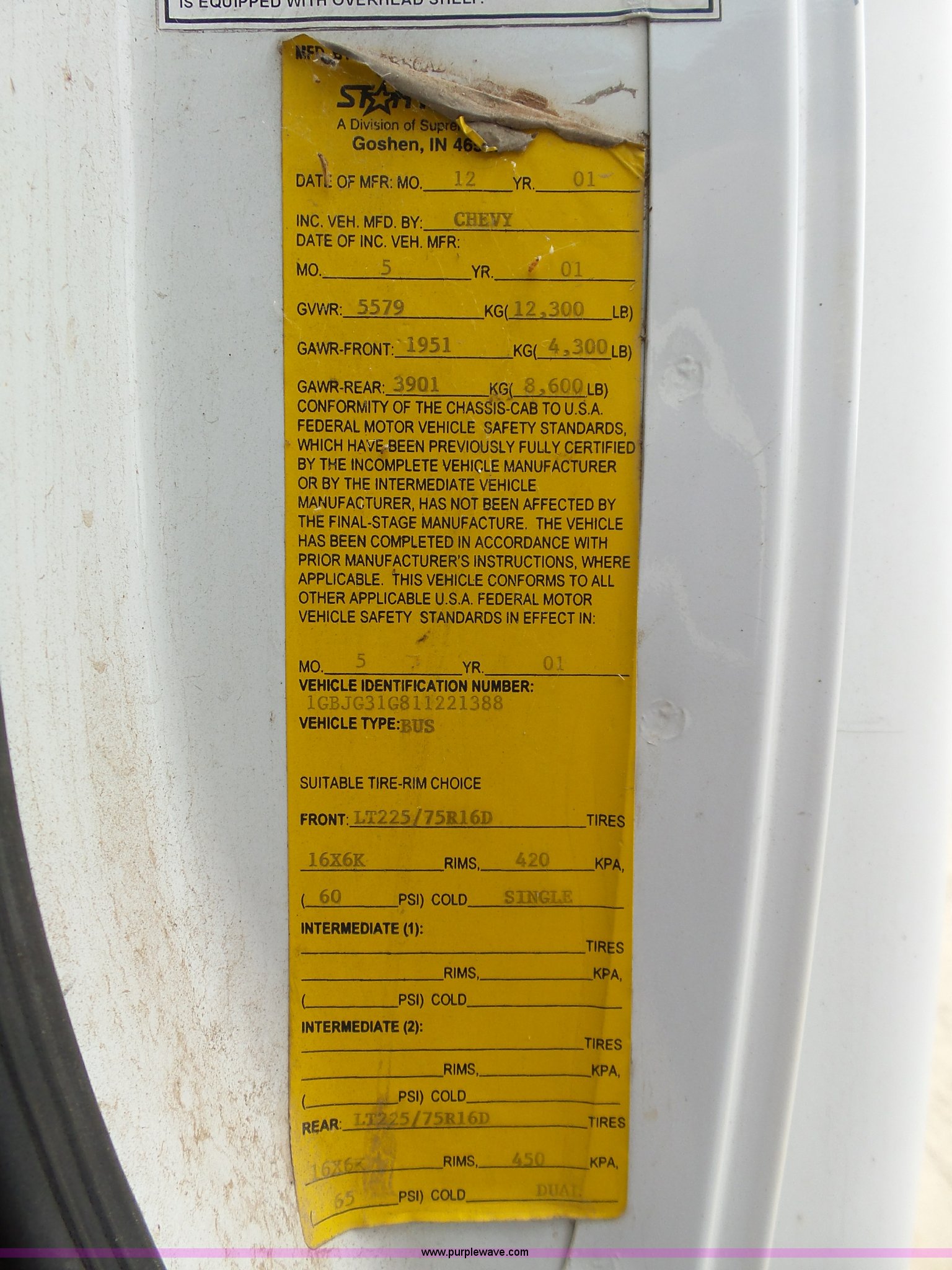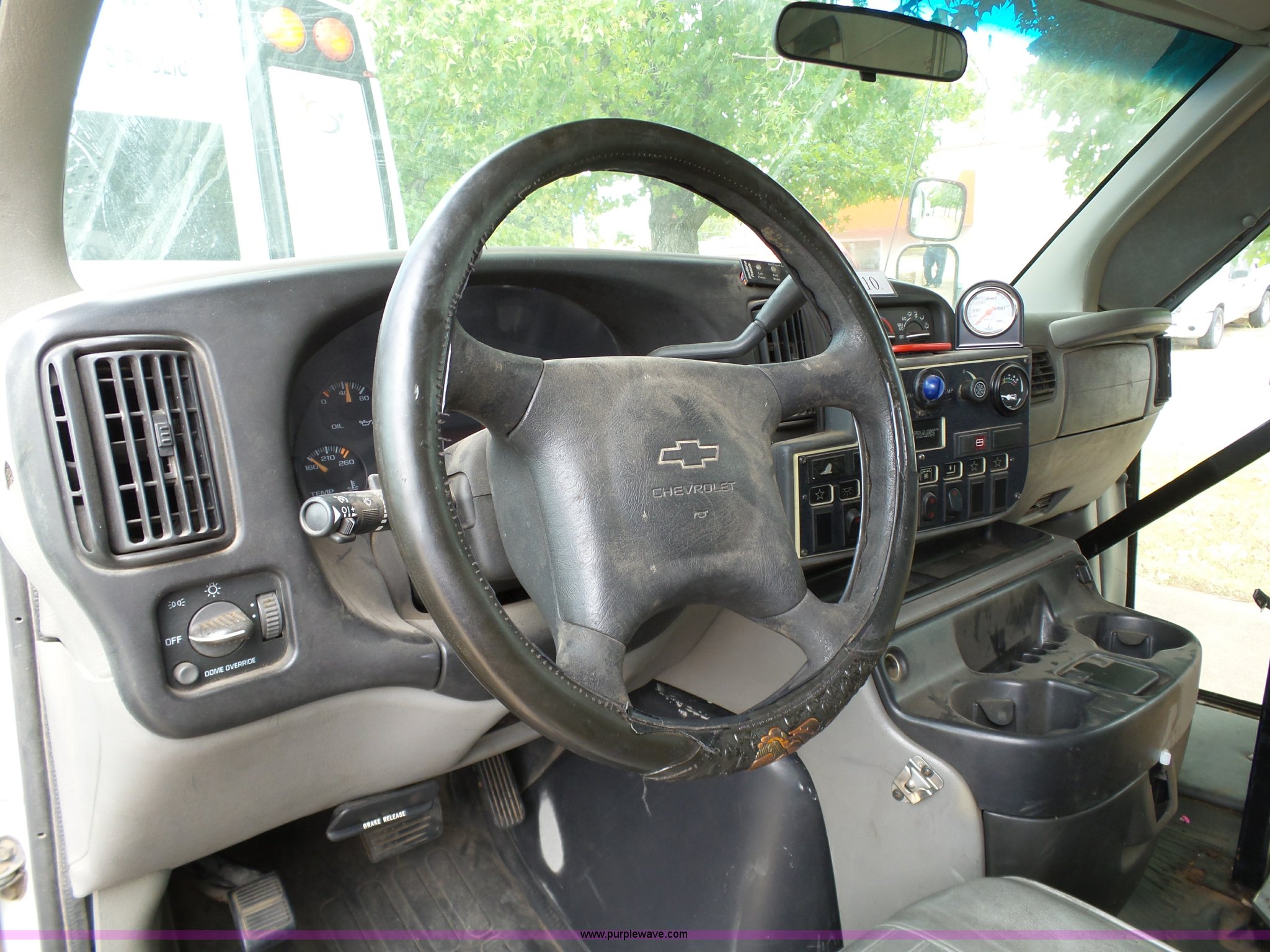 Purple Wave is selling a used Bus in Oklahoma. This item is a 2001 Chevrolet Express 3500 Cargo Startrans shuttle bus with the following: 123,216 miles on odometer, 8.1L V8 OHV 16V gas engine, Automatic transmission, Single axle, AC and heat, AM/FM/cassette, 11 passenger capacity, (9) adult seats, Seat belts, Braun L916IB wheelchair lift, Serial 05-00572, Non-operational, (2) wheelchair tie down areas, Ceiling, front, rear, and side emergency egress, Carrier AC roof unit, Hydraulic suspension, Hydraulic brakes, LT225/75R16 tires, GVWR 12,300 lbs, Transmission issues, Transmission fluid leak, Unit will not shift into gear, Service/maintenance records available upon request and will be included, Unit# 10