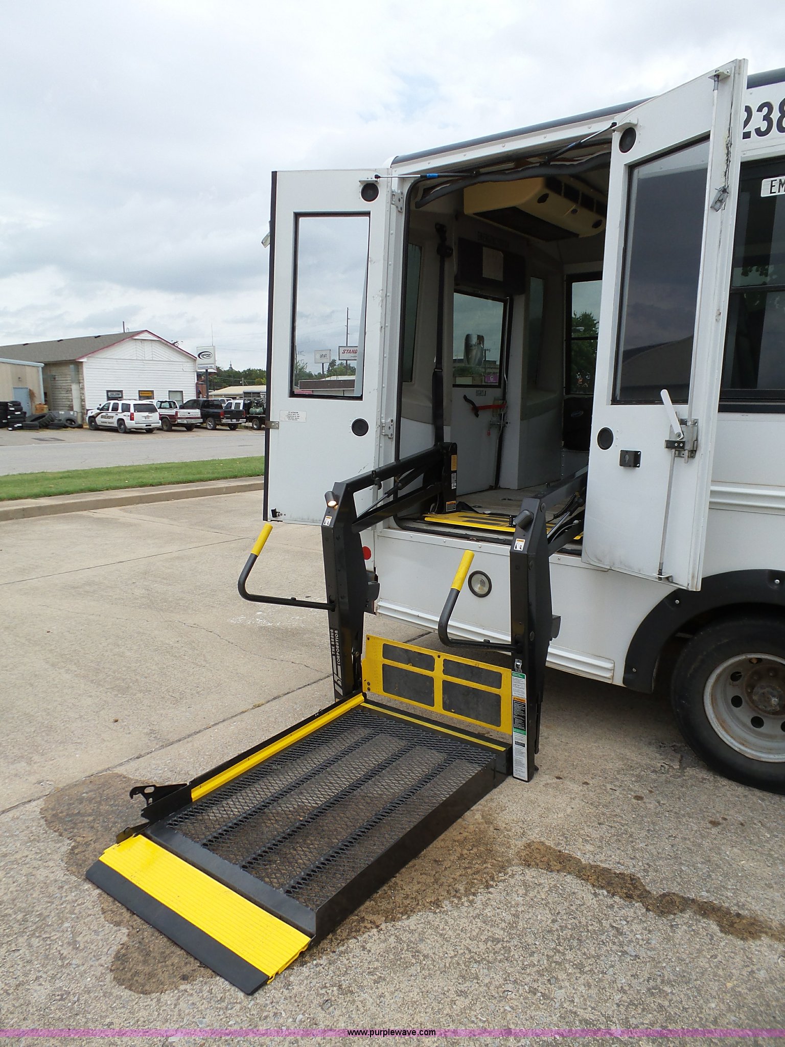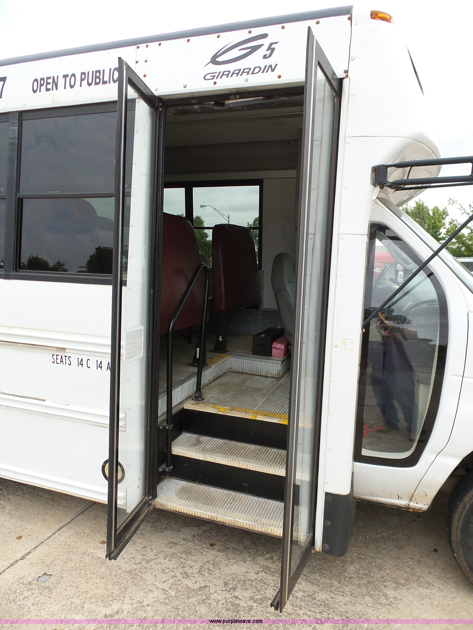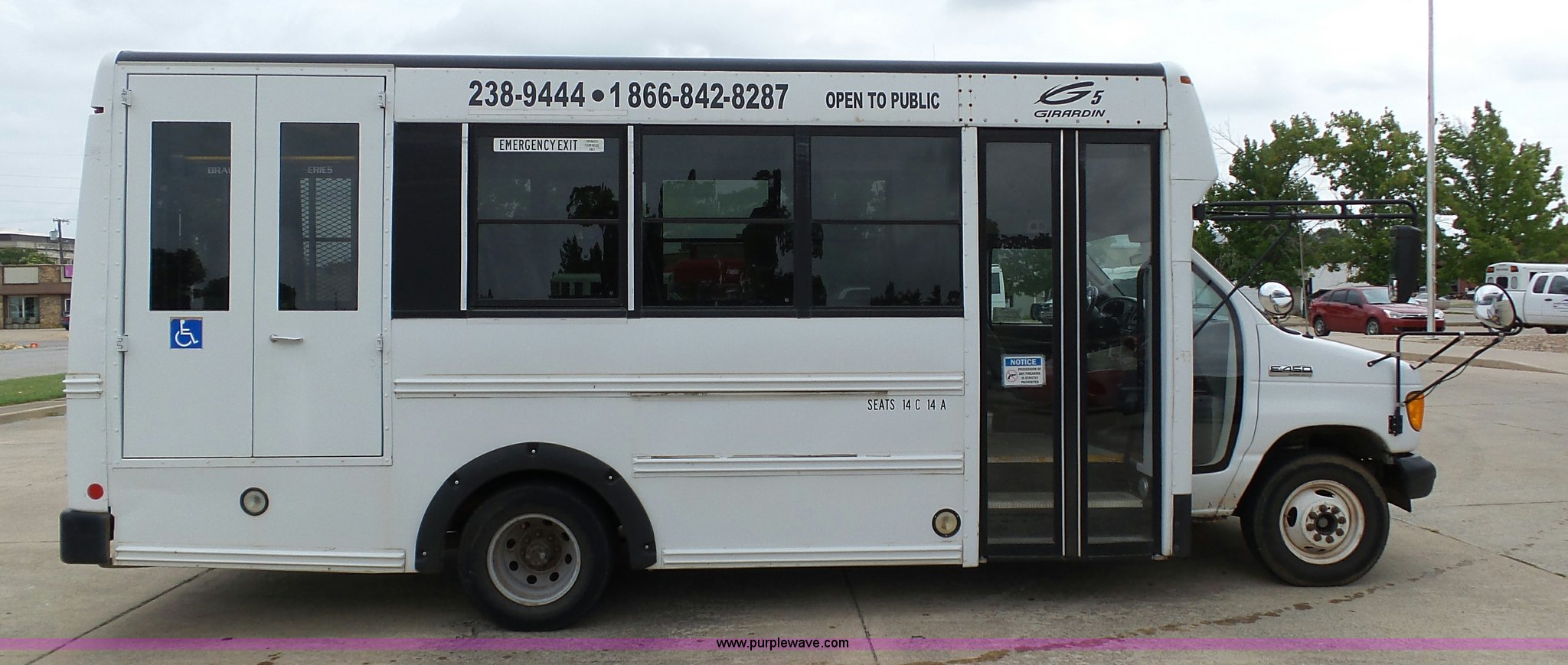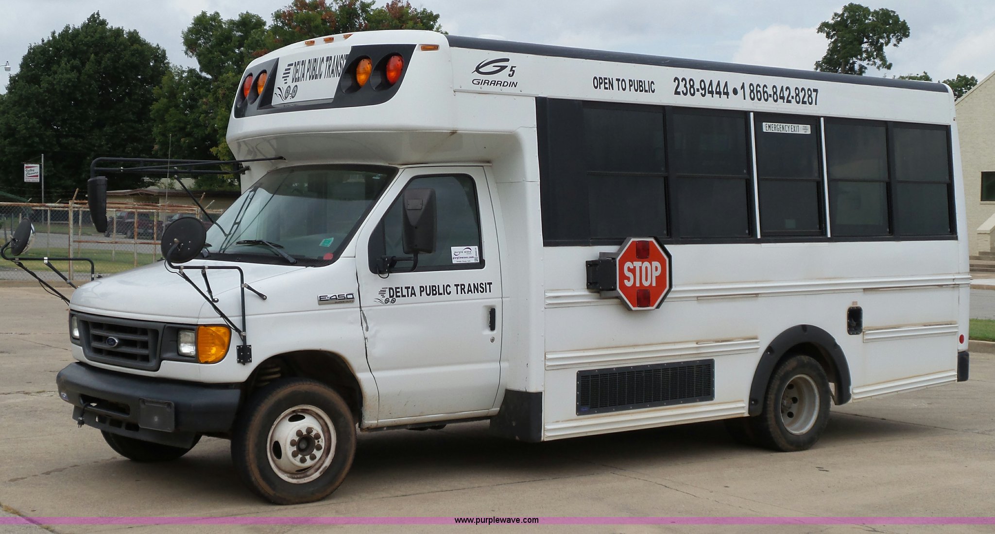 Purple Wave is selling a used Bus in Oklahoma. This item is a 2006 Ford E450 Super Duty Girardin shuttle bus with the following: 113,351 miles on odometer, 6.0L V8 OHV 32V diesel engine, Automatic transmission, Single axle, AC and heat, AM/FM/CD, Heated mirrors, Electric passenger sliding door, 15 passenger capacity, (12) child safety seats, (14) adult seats, Seat belts, Braun NL919FIB wheelchair lift, Serial 03-01022, Wheelchair tie down area, Front, rear, and side emergency egress, Lighted stop sign, Carrier AC roof unit, Block heat, Hydraulic suspension, Hydraulic brakes, 158" wheelbase, LT225/75R16 tires, GVWR 14,050 lbs, Unit intermittently will shut off, Service/maintenance records available upon request and will be included, Unit# 16