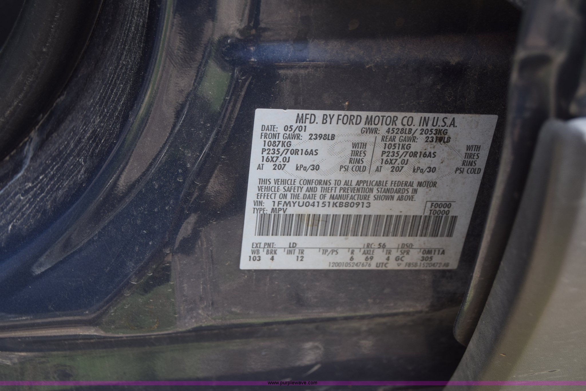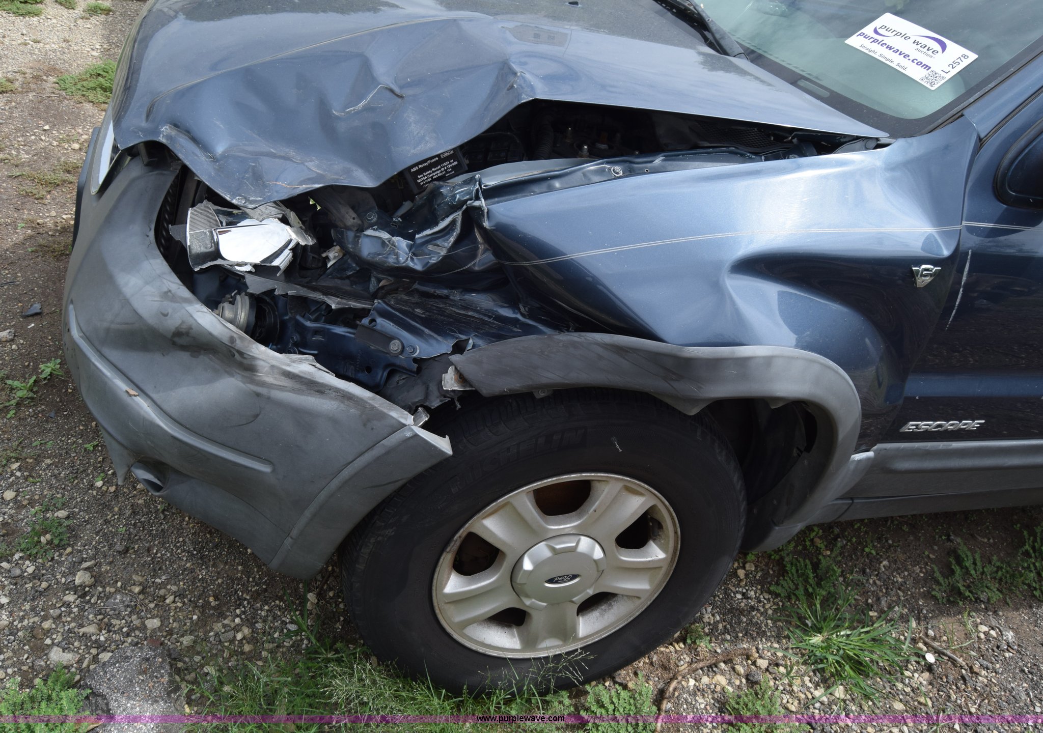 Purple Wave is selling a used Passenger Vehicle in Kansas. This item is a 2001 Ford Escape SUV with the following: Unknown miles on odometer, 3.0L V6 DOHC 24V gas engine, Automatic transmission, AC and heat, Tilt, Cruise, AM/FM/CD, Power windows, locks, and mirrors, Cloth interior, P235/70R16 tires, Front end damage, Unknown operating condition
